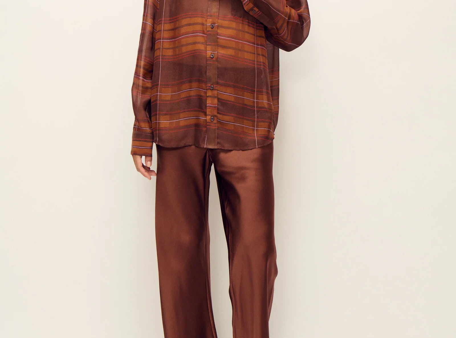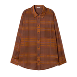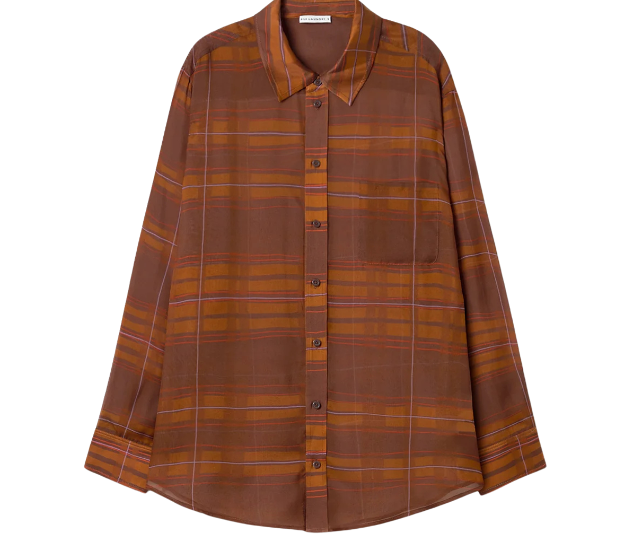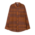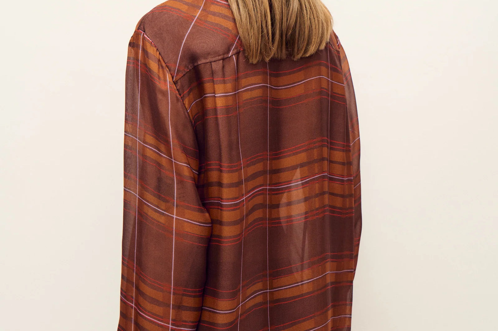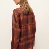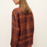 Introducing Silk Laundry's Chiffon Boyfriend Shirt in Root Plaid, a classic long-sleeve shirt in Root Plaid. Crafted in a relaxed silhouette with a lightweight semi-sheer blend featuring a batwing sleeve, point-collared neckline, curved hemline, and finished with a front centre row button closure. Perfect for a day-to-night relaxed and elevated look.