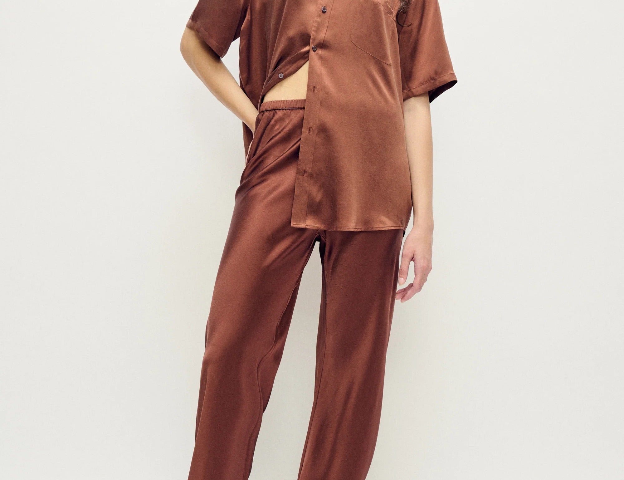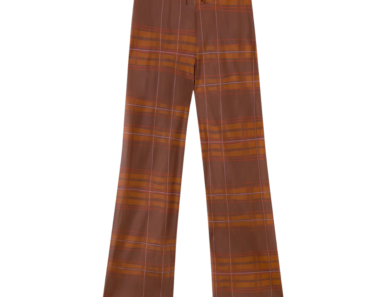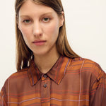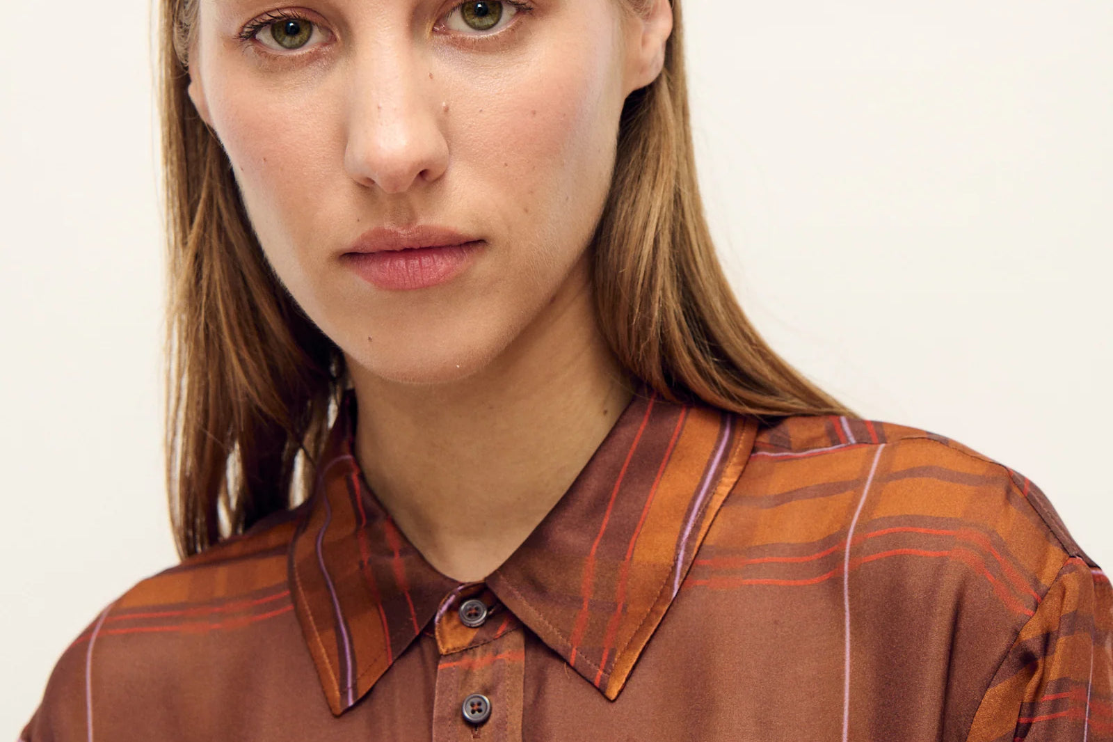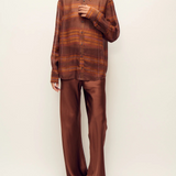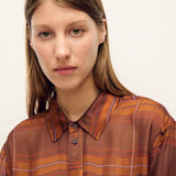 Introducing Silk Laundry's Chiffon Boyfriend Shirt in Root Plaid, a classic long-sleeve shirt in Root Plaid. Crafted in a relaxed silhouette with a lightweight semi-sheer blend featuring a batwing sleeve, point-collared neckline, curved hemline, and finished with a front centre row button closure. Perfect for a day-to-night relaxed and elevated look.