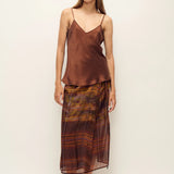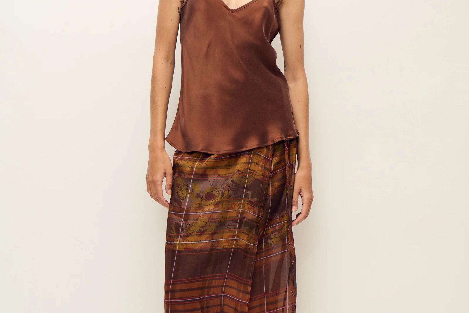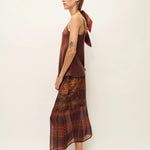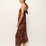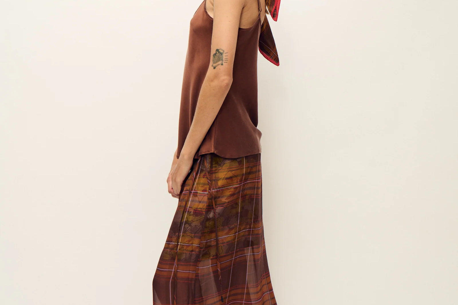 Introducing Silk Laundry's Chiffon Wrap Skirt Root Plaid Sunflower Floral, a chiffon wrap skirt in an earthy red floral plaid print. Designed with a sheer, lightweight fabrication with blue floral canvas. Perfect for a summer's day look.