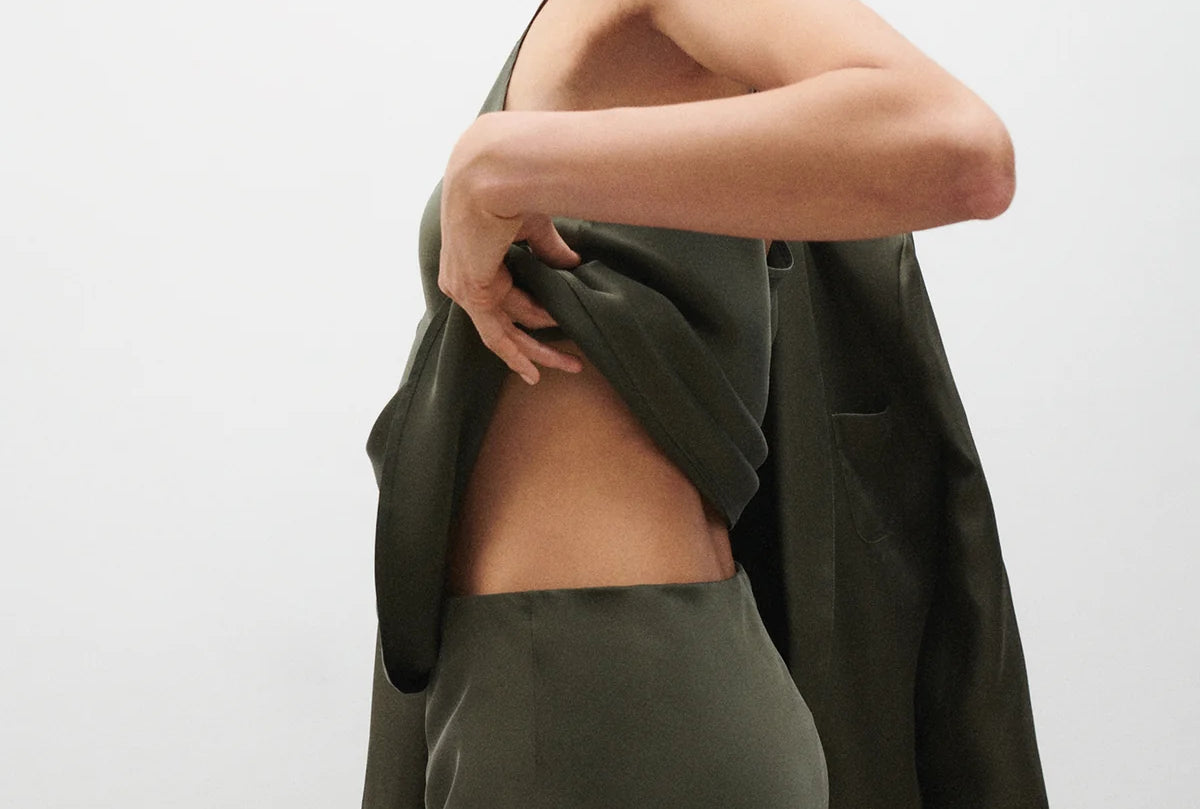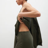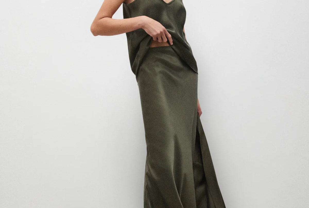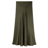 Introducing Silk Laundry's Long Bias Cut Skirt in Pine, a midi skirt silhoutte in green-pine hue, cut on the bias from velvet satin with a smooth finish with a flattering drape that skims the body. Sitting high on the waist with a fluid midi-length silhouette, it moves effortlessly and offers endless styling versatility, perfect with a structured blazer or a simple tank.