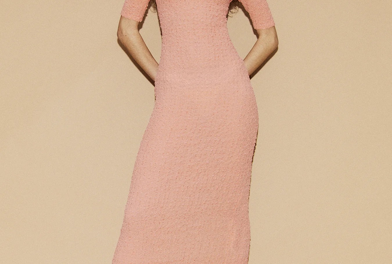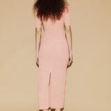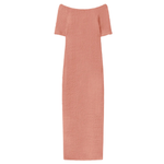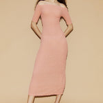 Introducing Silk Laundry's Pebble Off-the-Shoulder Dress in Orchid, a midi-length off-the-shoulder dress silhouette in a pink orchid hue. The pebble dress is made from a silk blend and shaped with a shirred stretch finish. It is designed with an off-shoulder, form-fitting style and a back slit. Perfect for day-to-night occasion dressing.