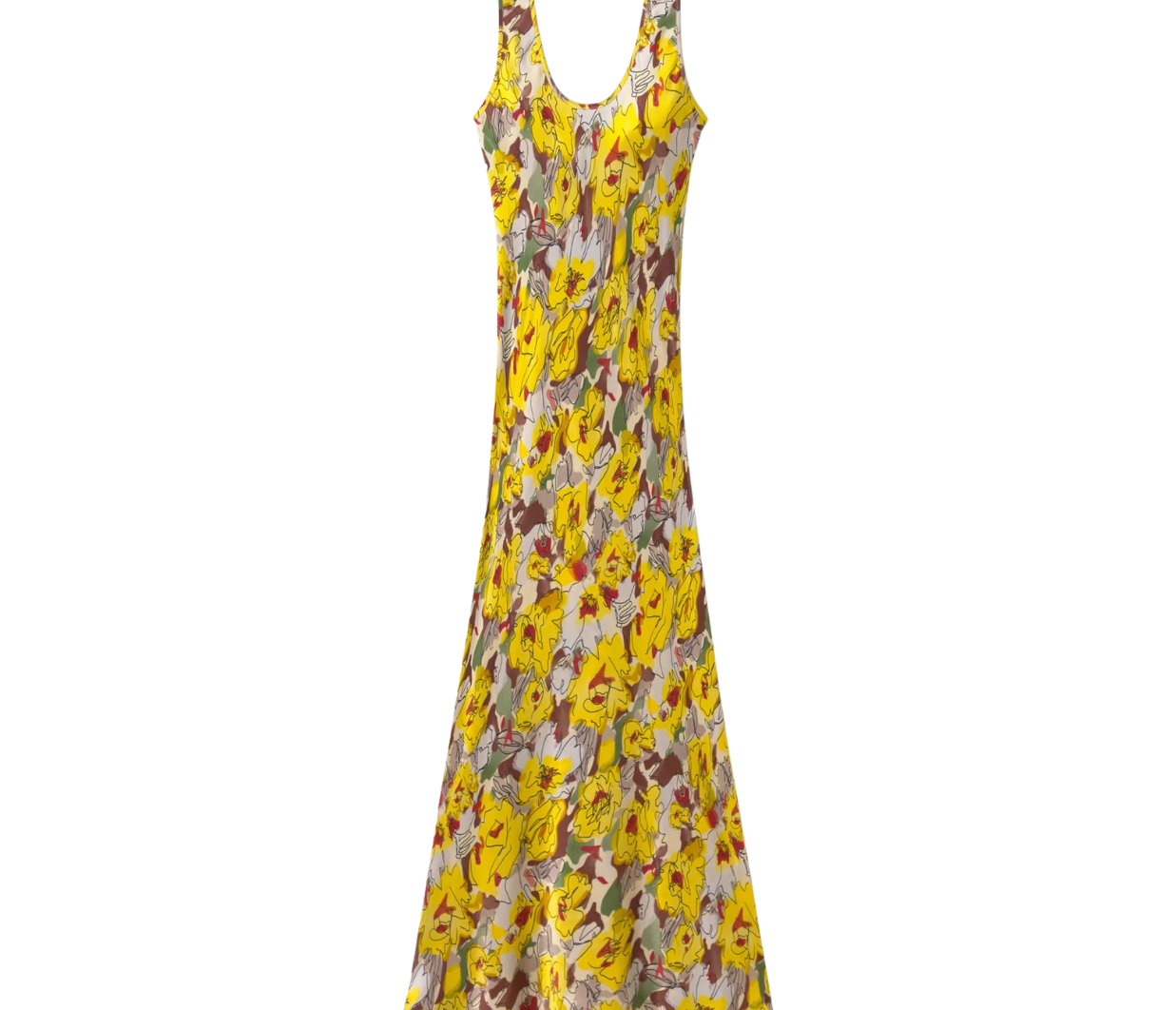 Introducing Silk Laundry's Scoop Neck Dress Sunflower Floral a midi slip dress in a light sky blue cornflower hue. Designed with a cut-bias silhouette in 100% silk, the Diamond dress features a V-neckline, ruched straps, and drapes to ankle length.
