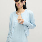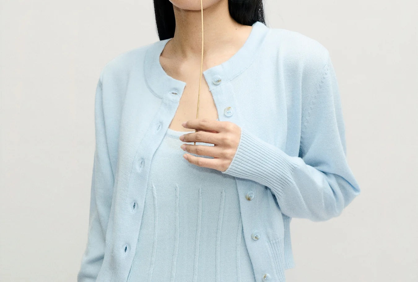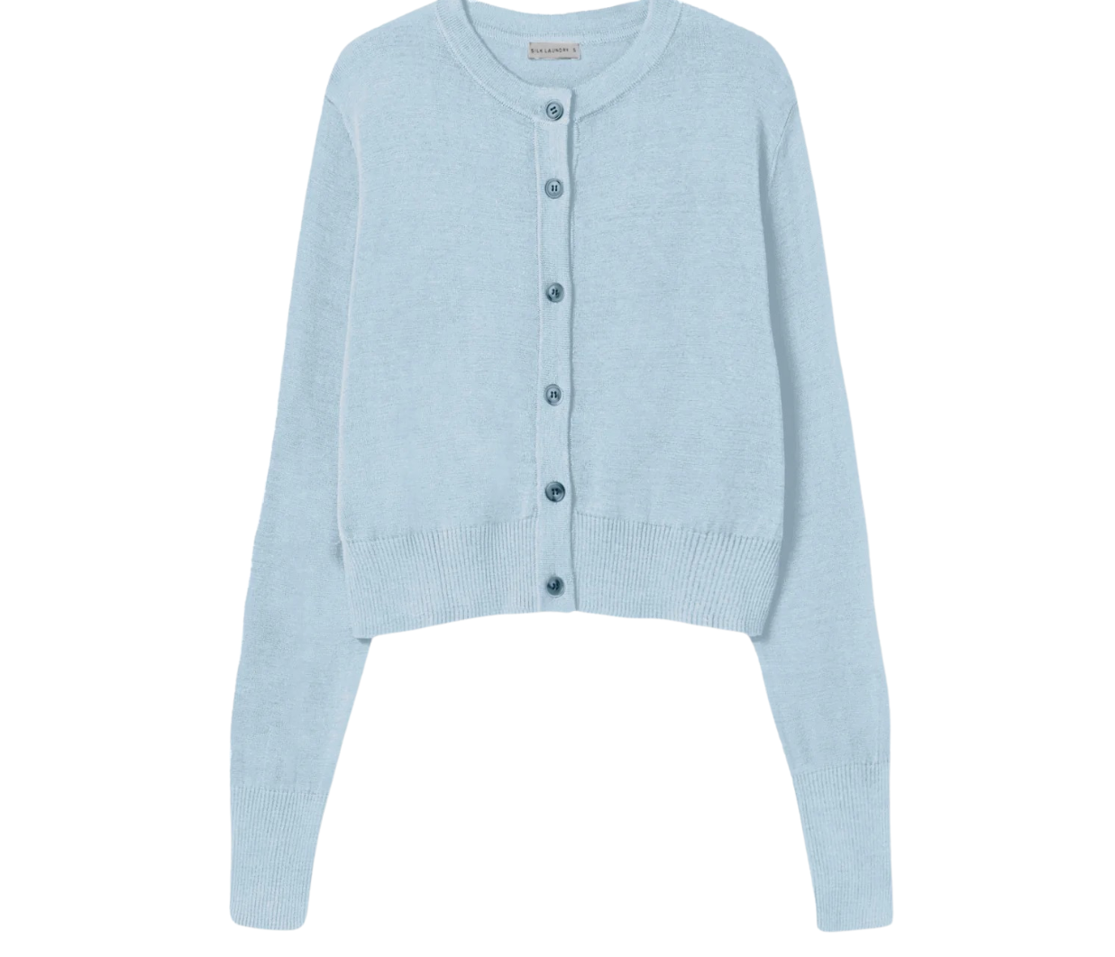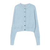 Introducing Silk Laundry's Wool Cropped Cardigan Cornflower, a cropped cardigan in light blue cornflower. Designed in 100% merino wool with cropped fit featuring a round neckline and ribbed cuffs. Perfect outerwear for a cool weather day.