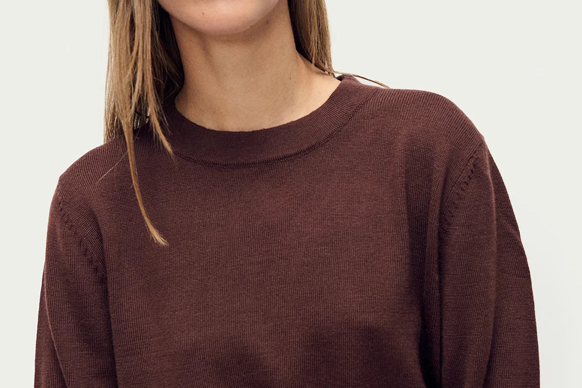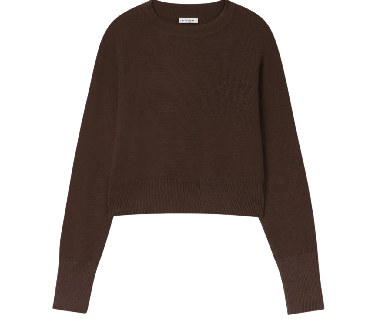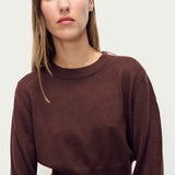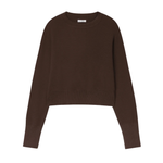 Introducing Silk Laundry's Cropped Crewneck Sweater in Root, a cropped sweater in brown. Crafted in 100% merino wool, the sweater features a crew neckline and is finished with a rib detail on the cuffs and waist.