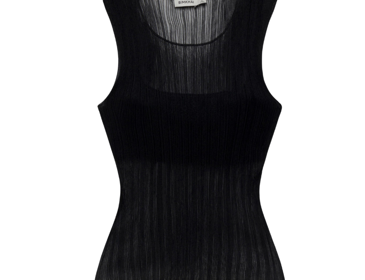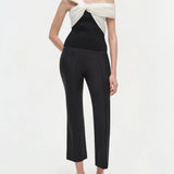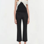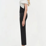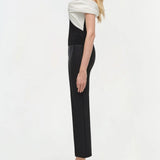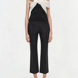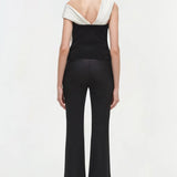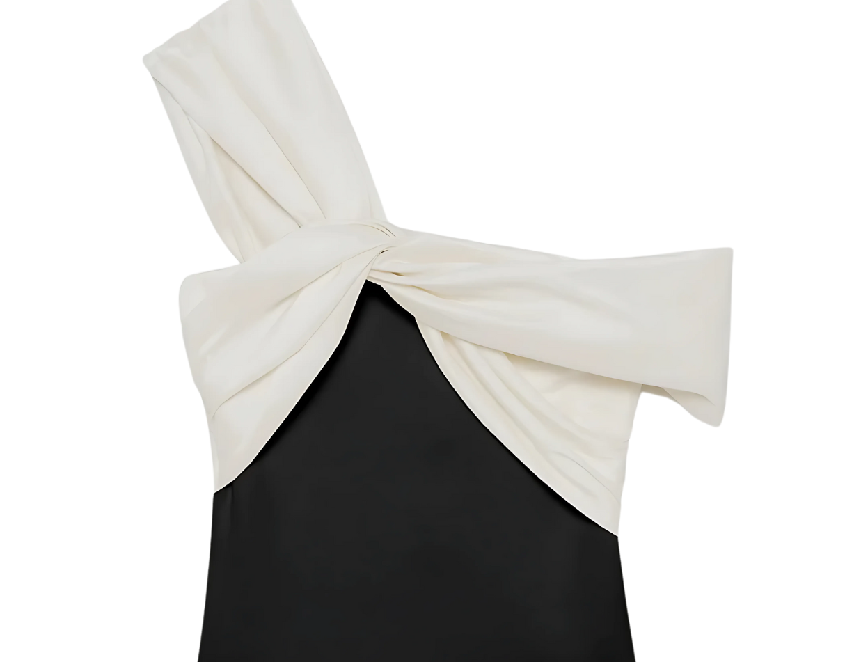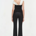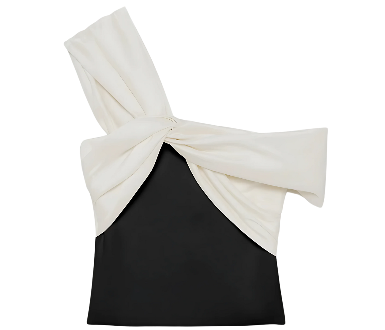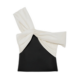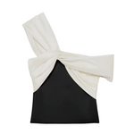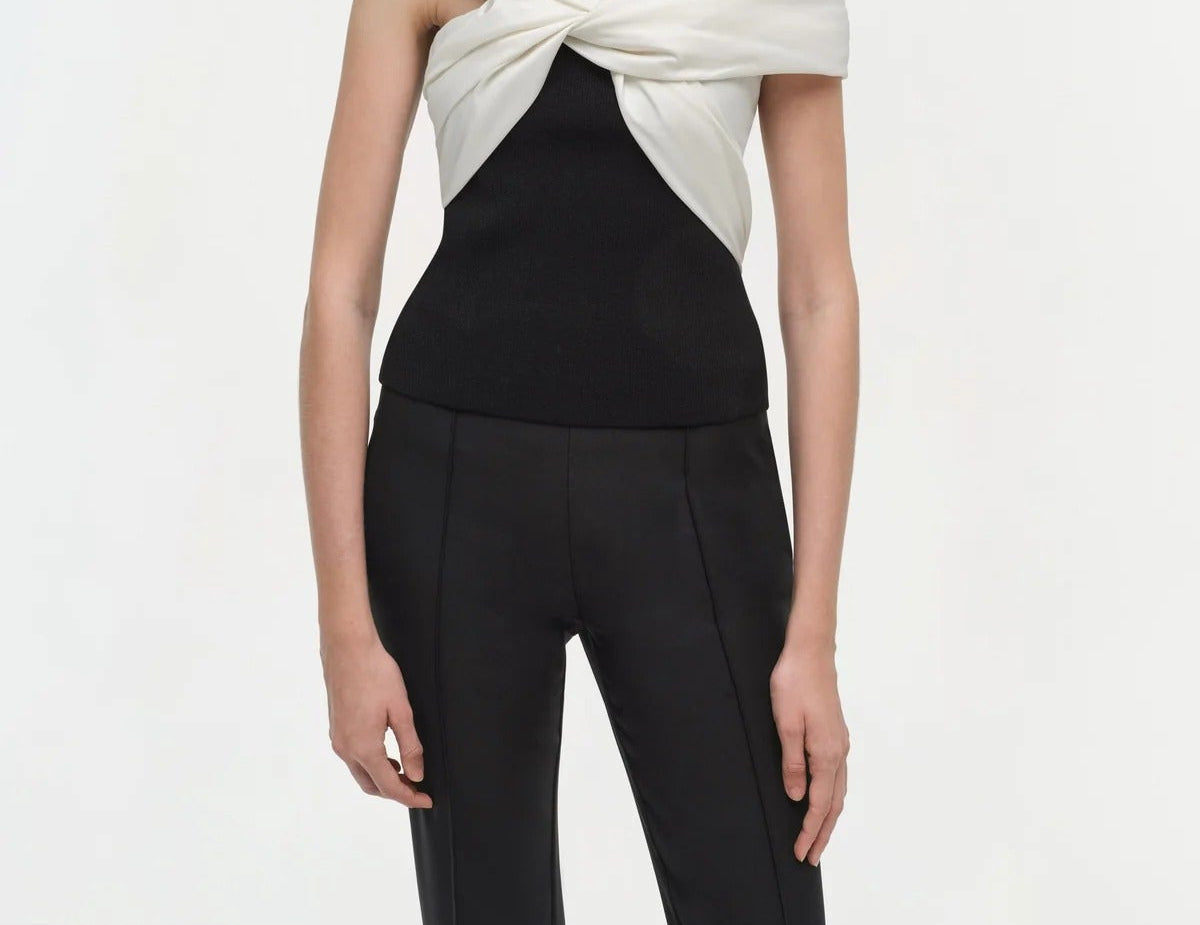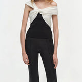 Introducing Simkhai's Celiana Top in Black Multi, an off-shoulder top silhouette featuring a twist-front crossover design in a knitted Black and White hue. The fitted top includes a concealed side zipper for a seamless finish and is unlined for light wear. Perfect for day to night elevated looks.