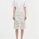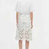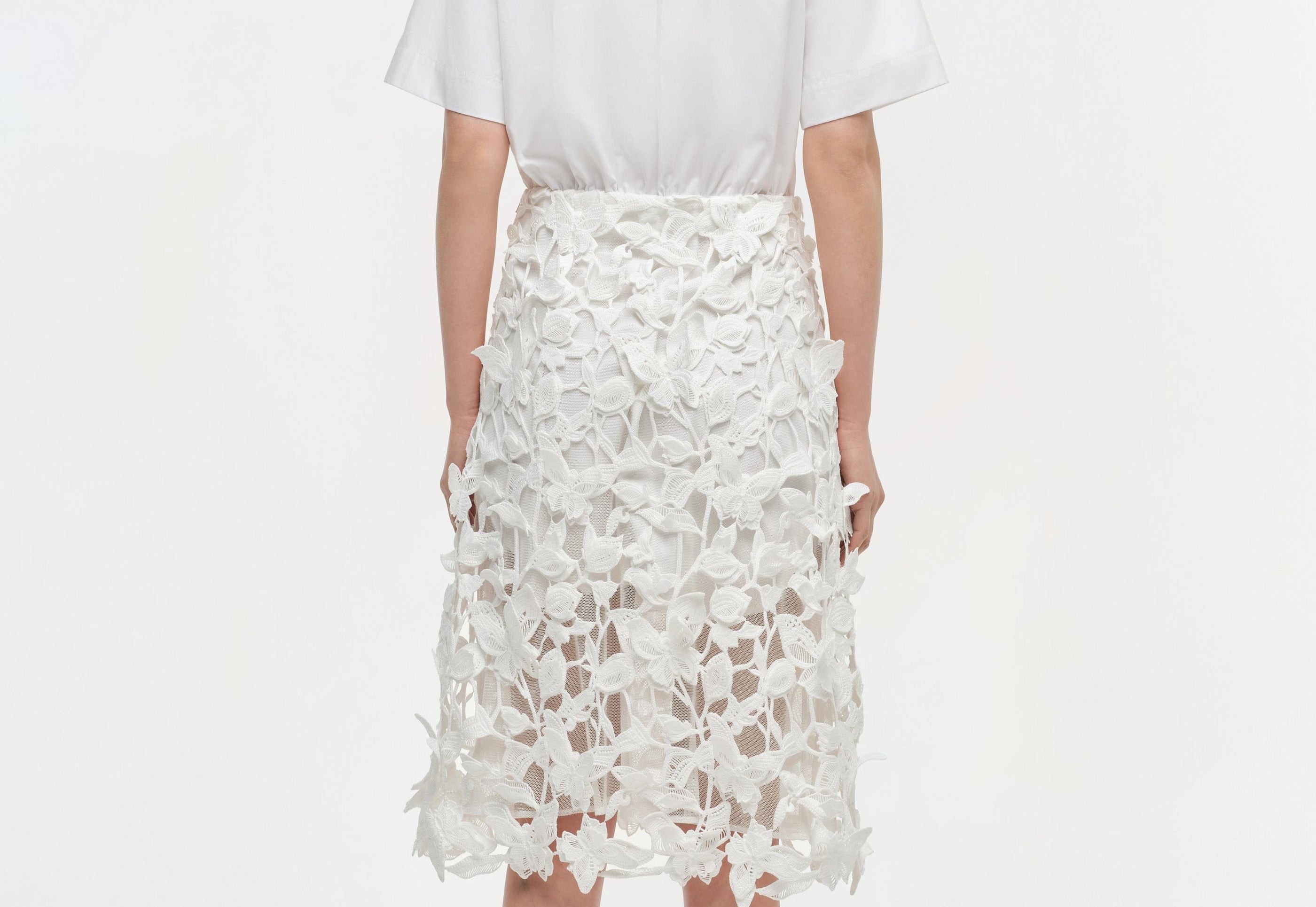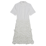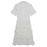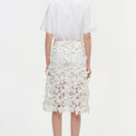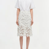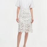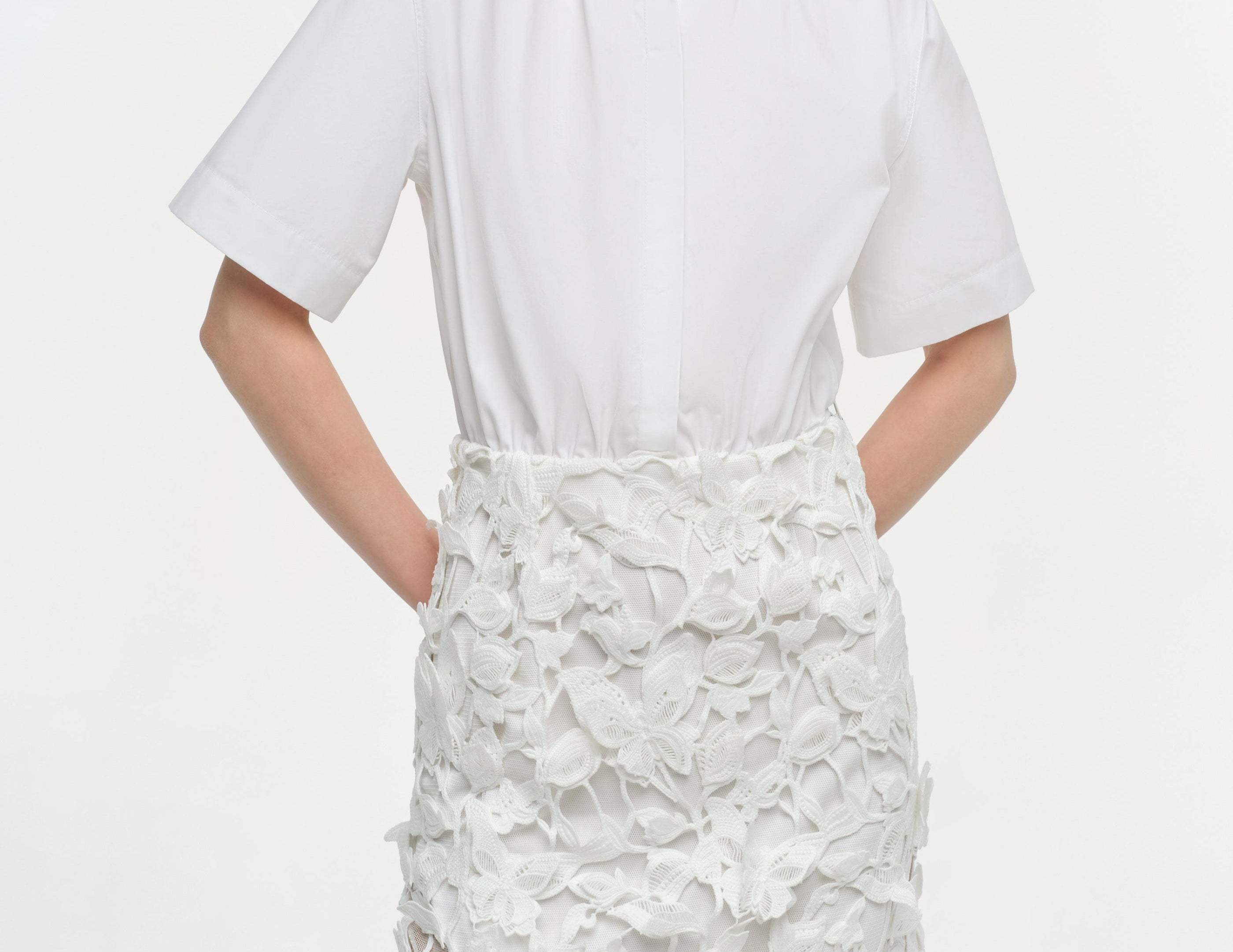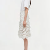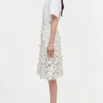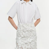 The Colette Applique Midi Dress in White. Featuring intricate 3D floral guipure detailing, this short-sleeve combo dress is expertly crafted to bring dimension and artistry to a contemporary silhouette.