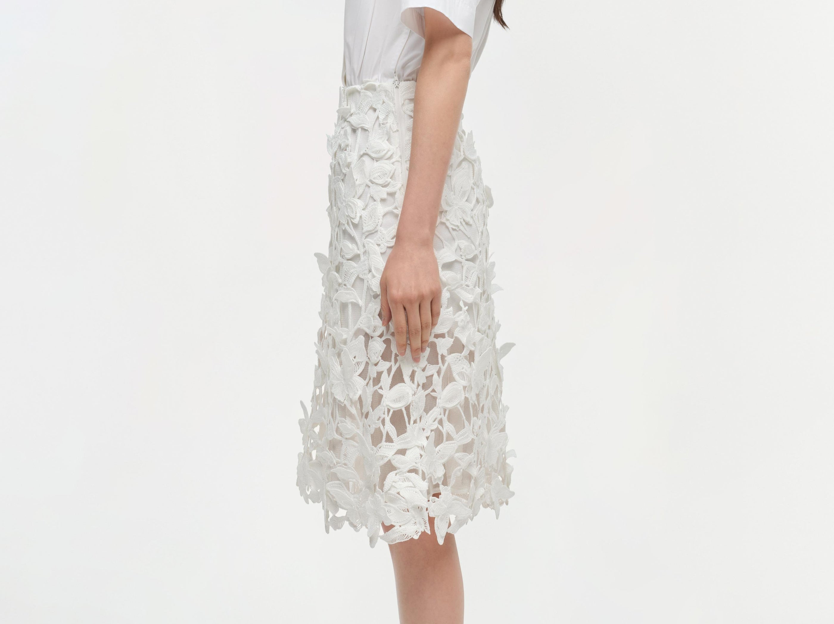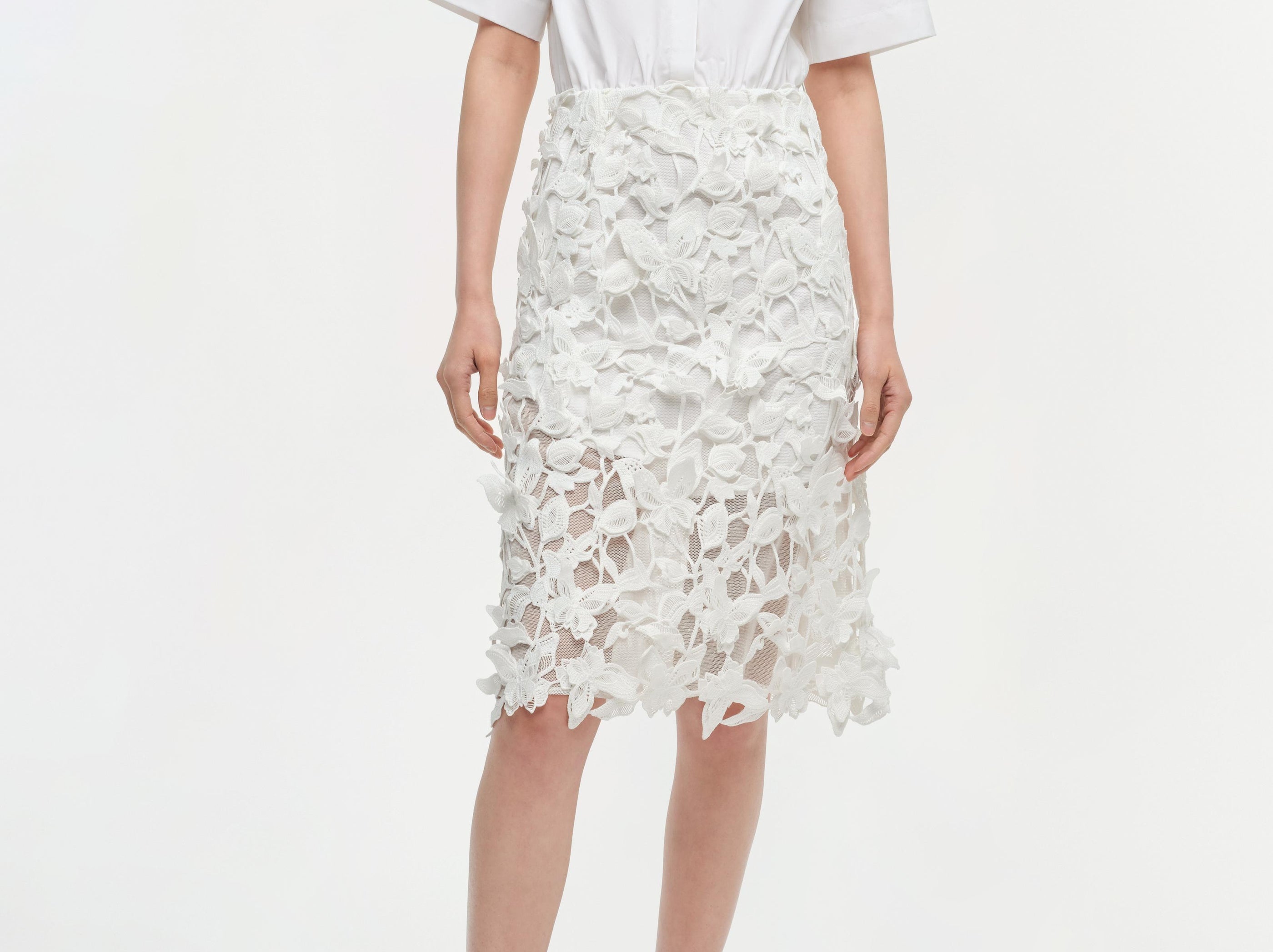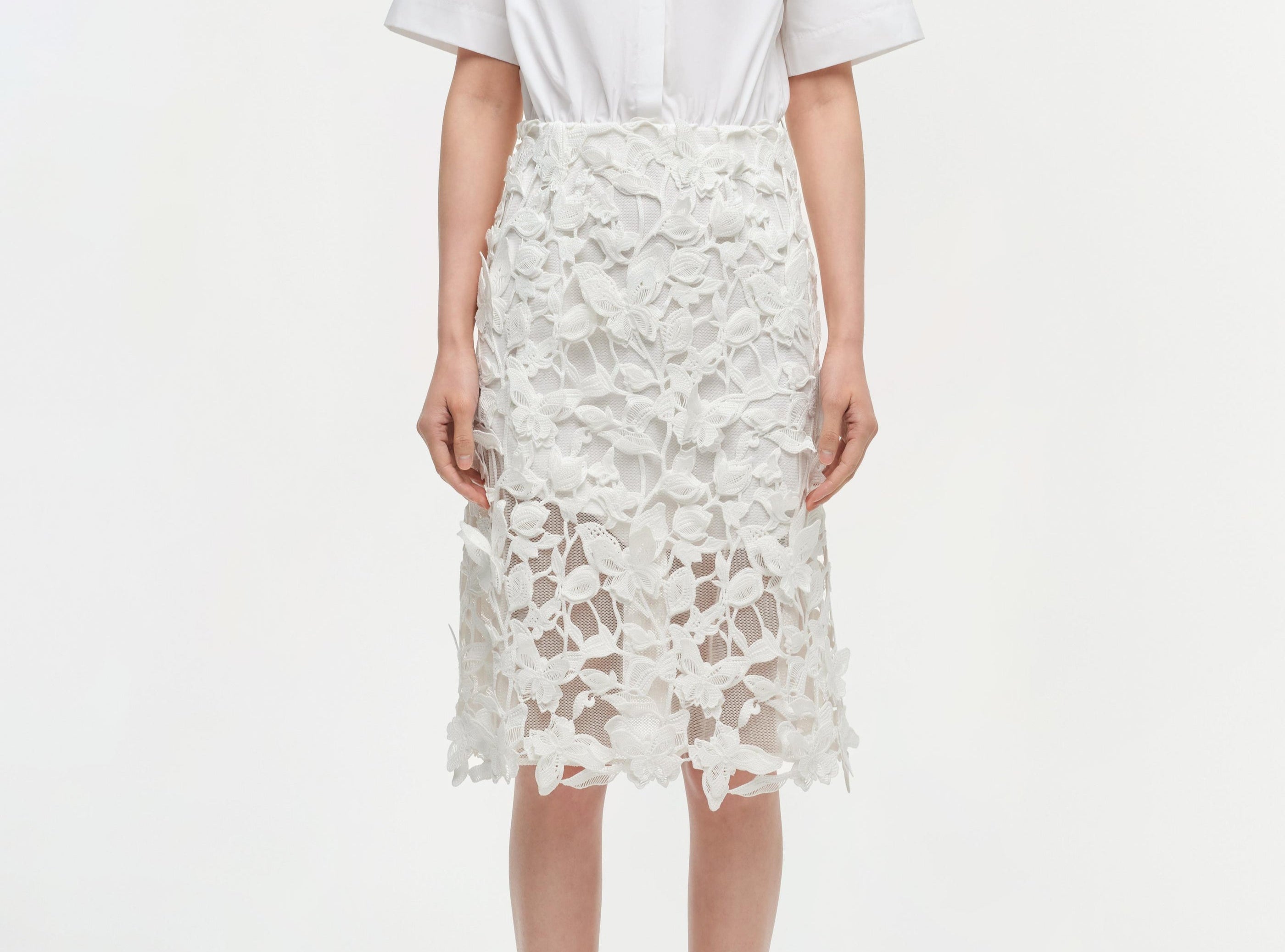 The Colette Applique Midi Dress in White. Featuring intricate 3D floral guipure detailing, this short-sleeve combo dress is expertly crafted to bring dimension and artistry to a contemporary silhouette.