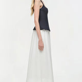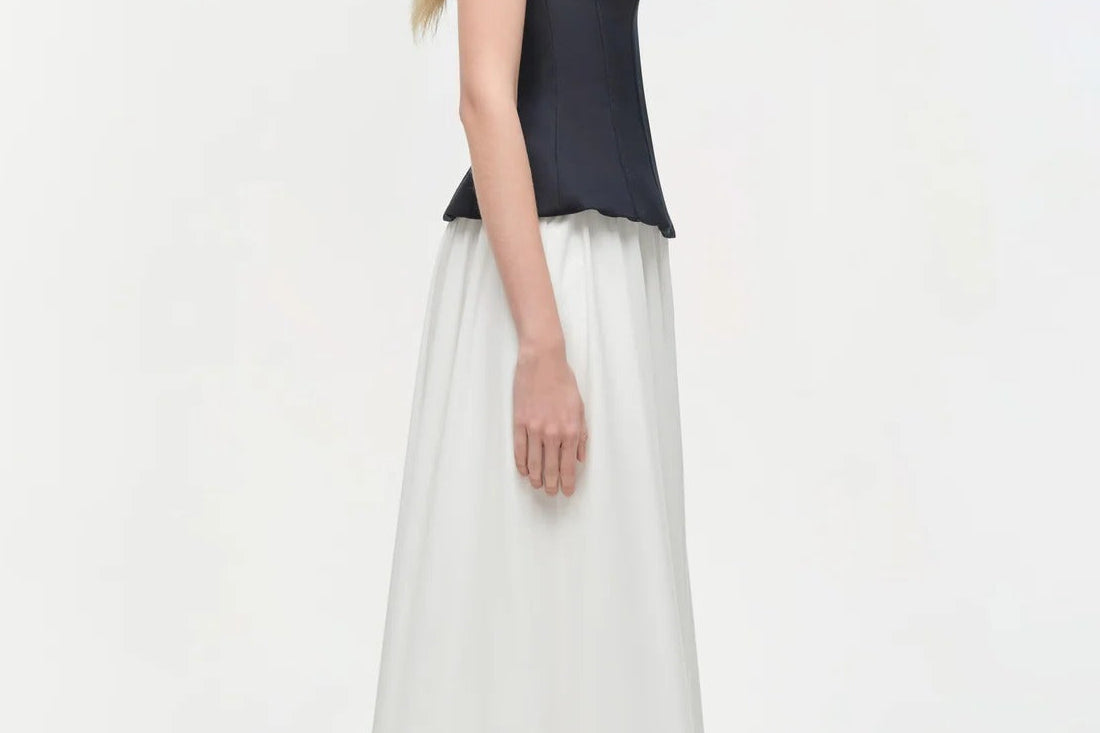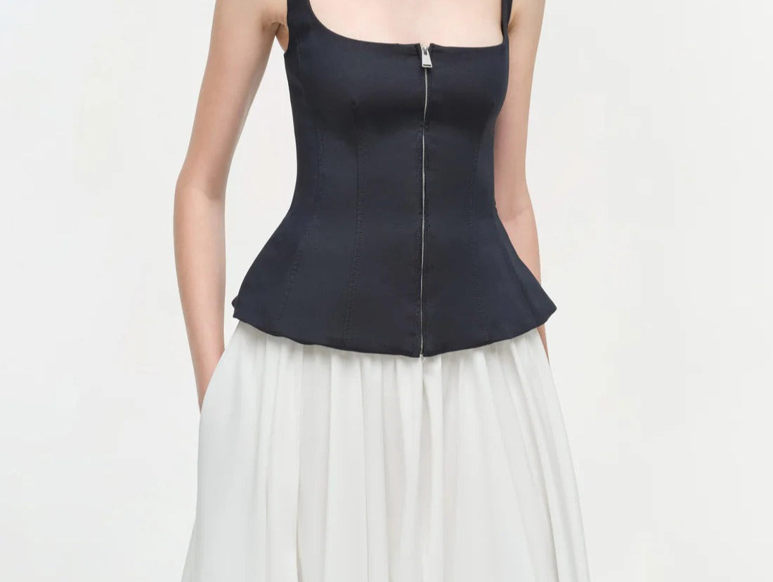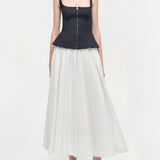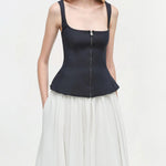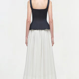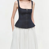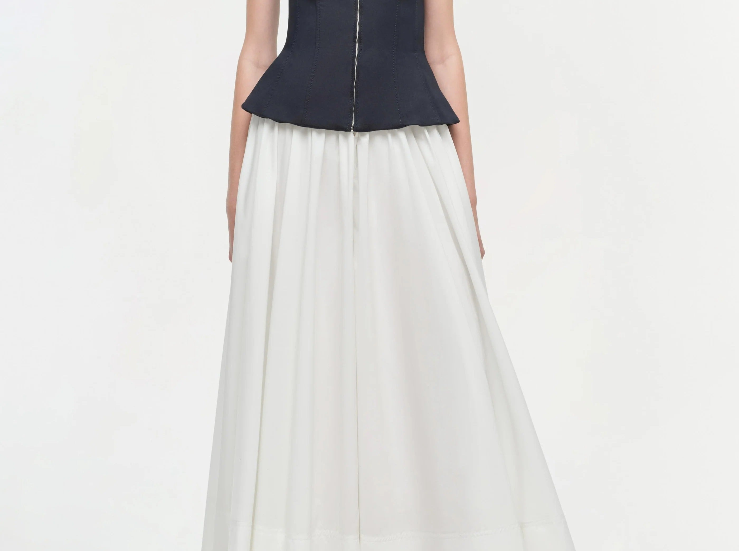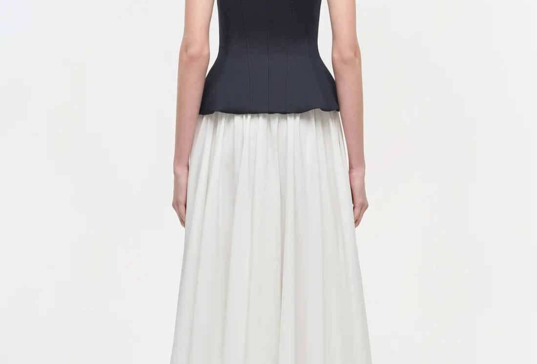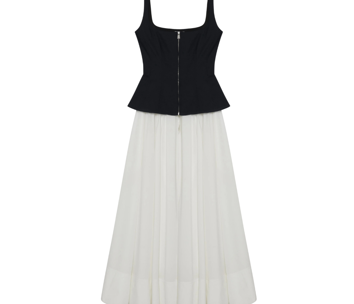 Introducing Simkhai's Jolynn Short Sleeve Midi Dress in Black. A statement silhouette with striking contrast. Designed with a wide neckline and functional zip-front bodice, the dress cinches at the waist before falling into a voluminous, midi-length skirt.
