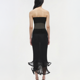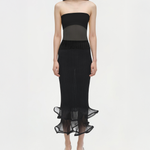 Introducing the Kelso Knit Midi Skirt in Black. Crafted from sheer plissé, this midi features a lightweight design with subtle texture and fluid movement.