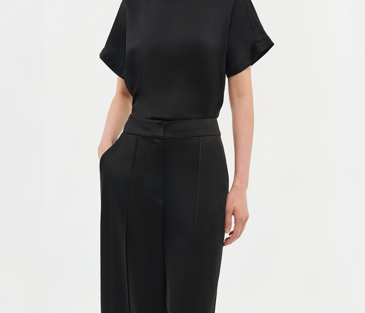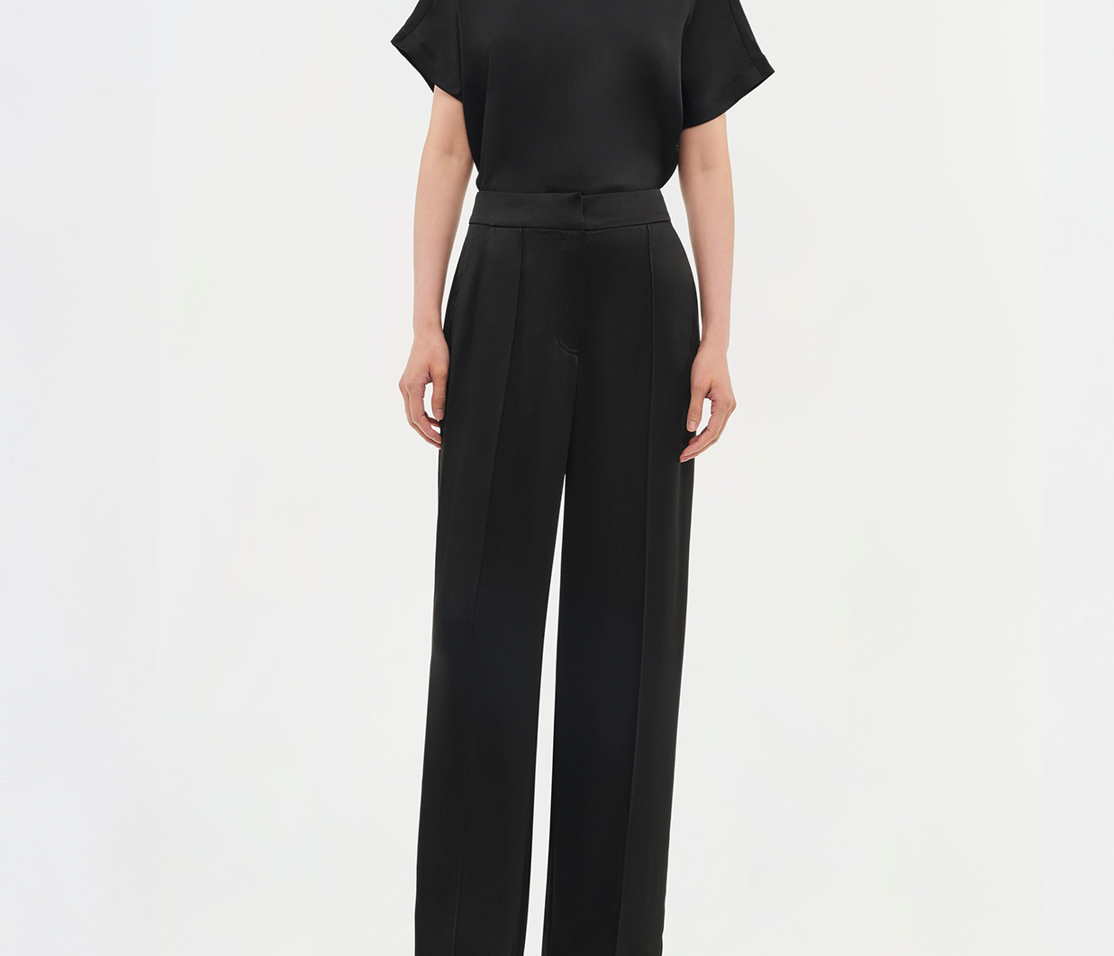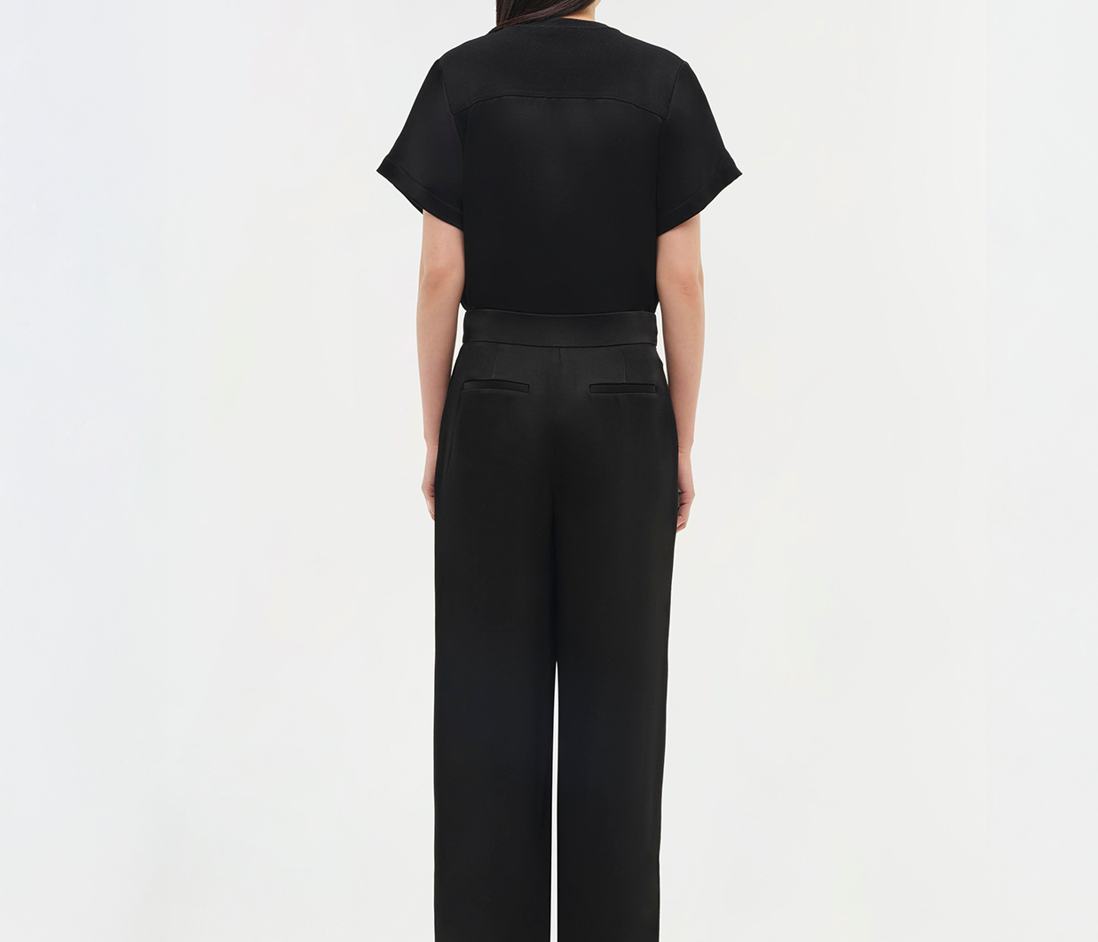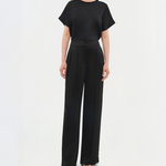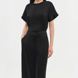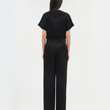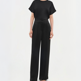 Introducing the Kyra Pant in Black. These wide-leg bottoms feature a relaxed, flowing silhouette with a tailored waistband for a polished finish. The clean lines and generous fit offer both comfort and style, making them a versatile addition to any wardrobe.