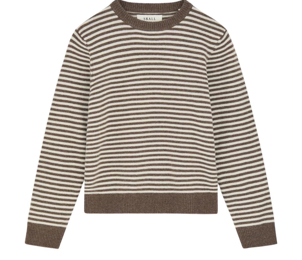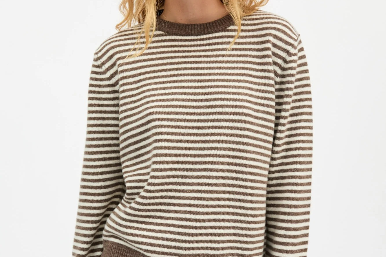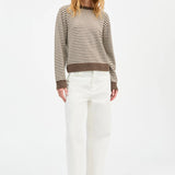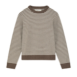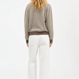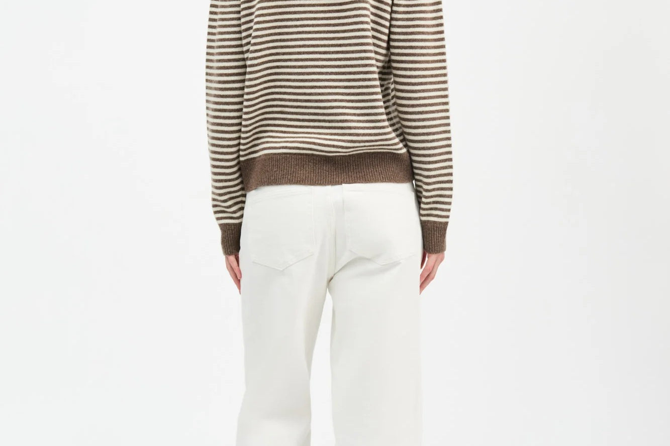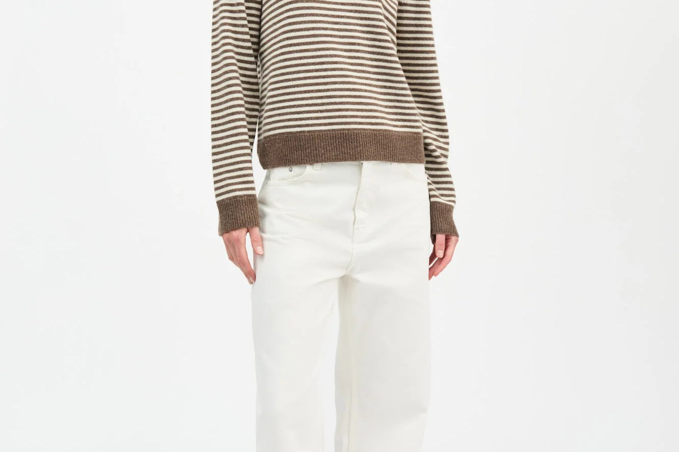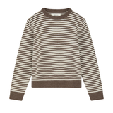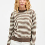 The Cameron Jumper in White Brown Melange Stripe is an elegant sweater with relaxed fit and ribbed edges at collar, hem and cuffs.