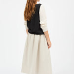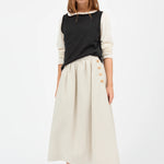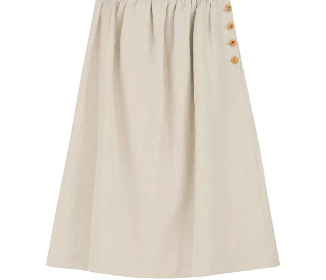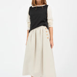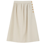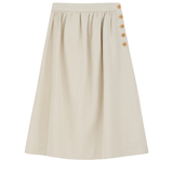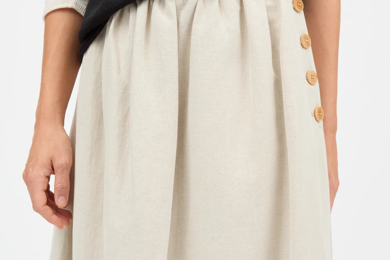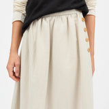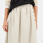 The Clementine Skirt in Natural, a mid-length skirt with waistband buttoned closure in the side.
