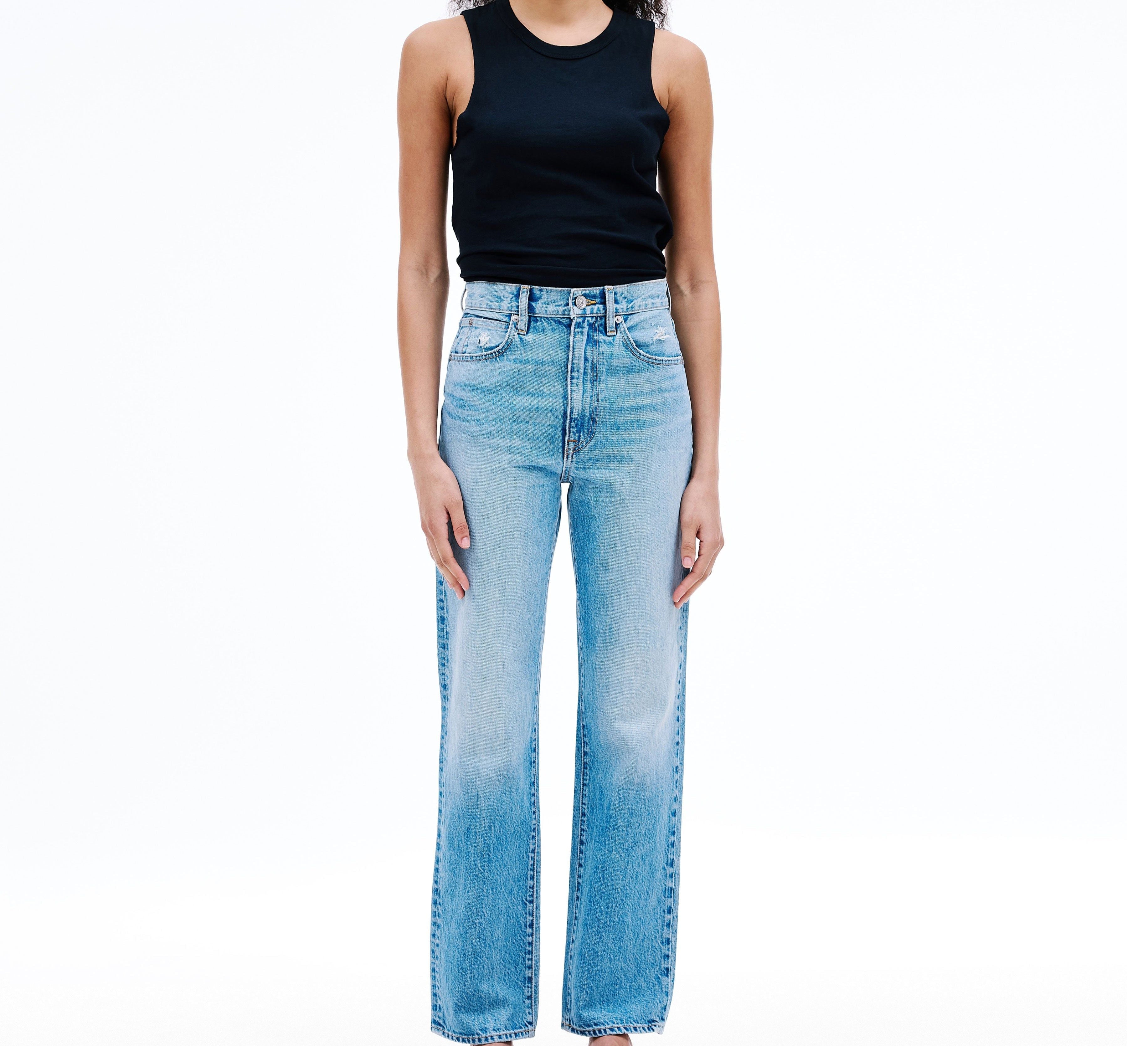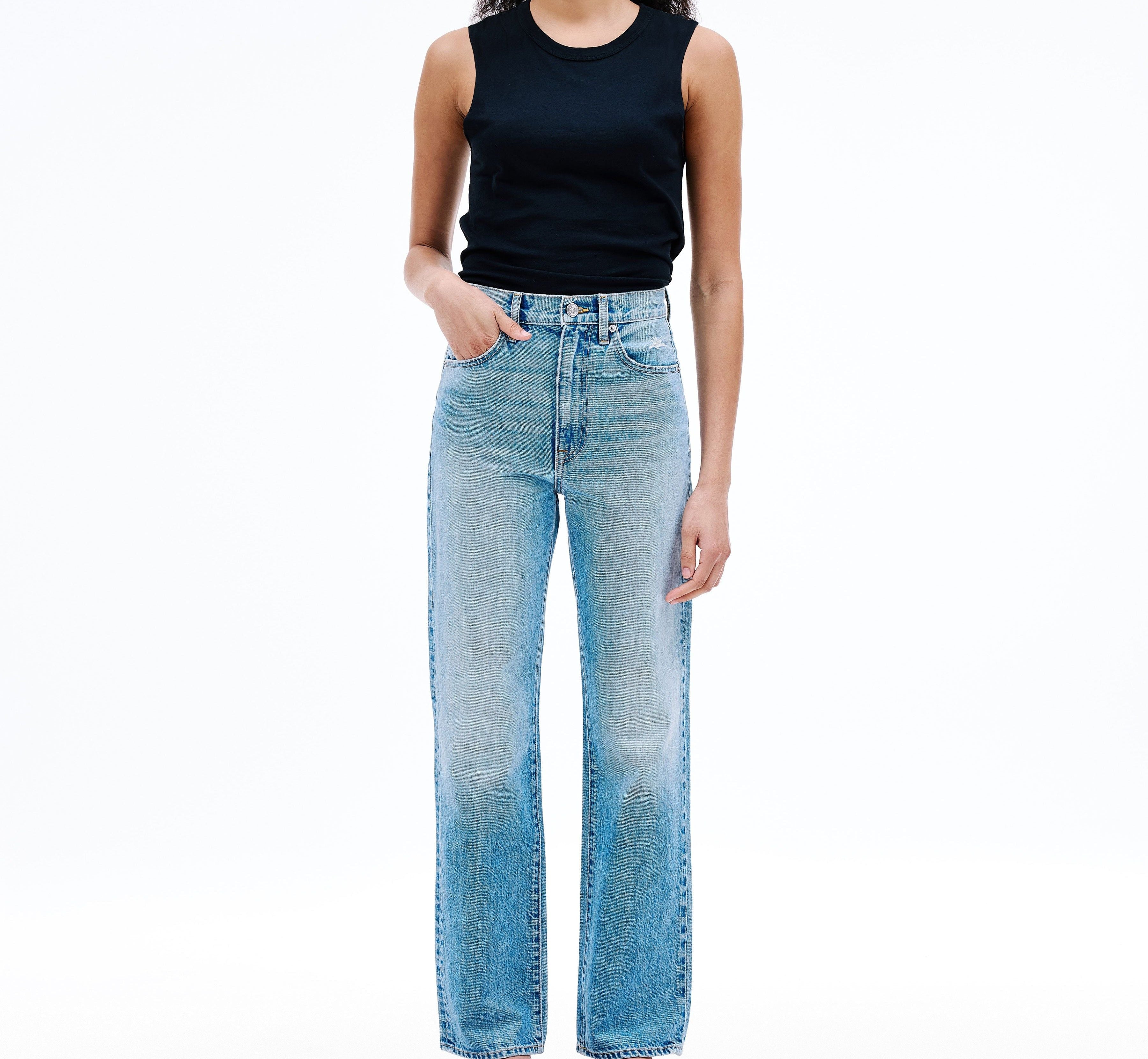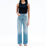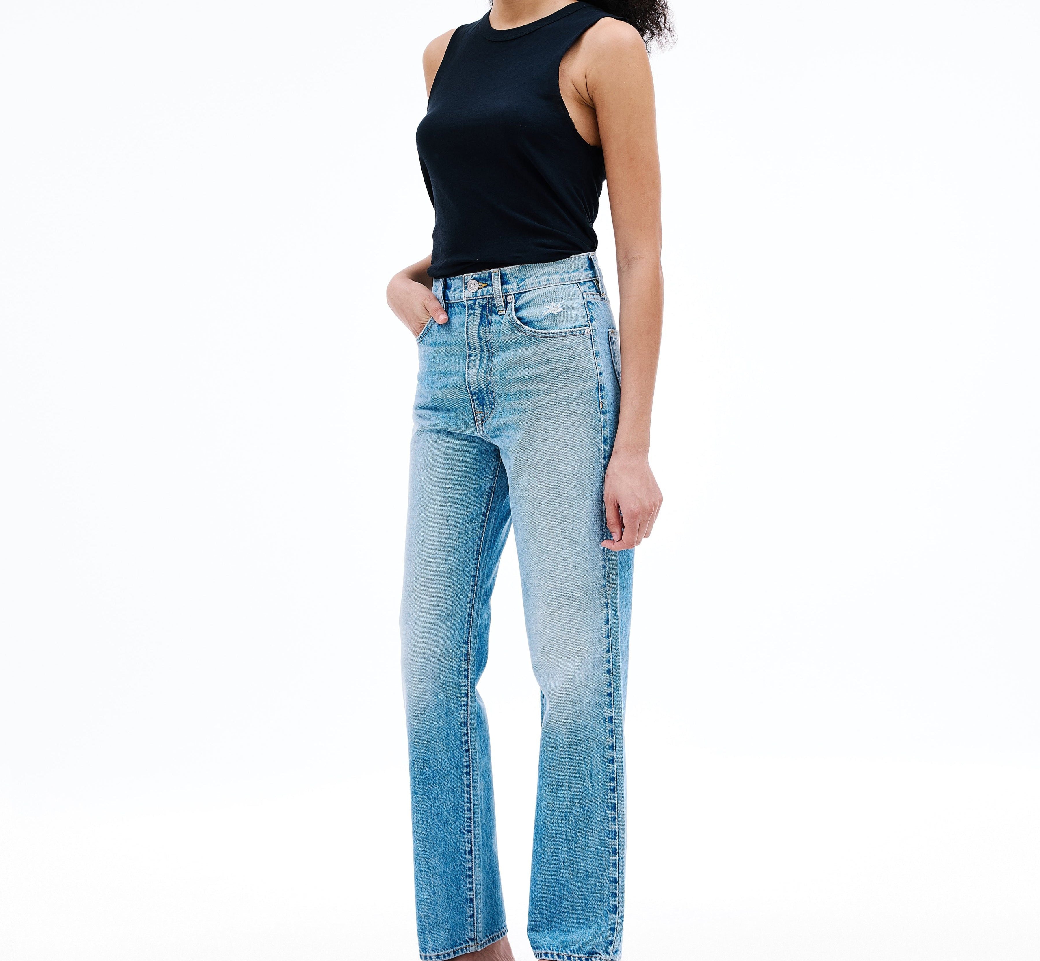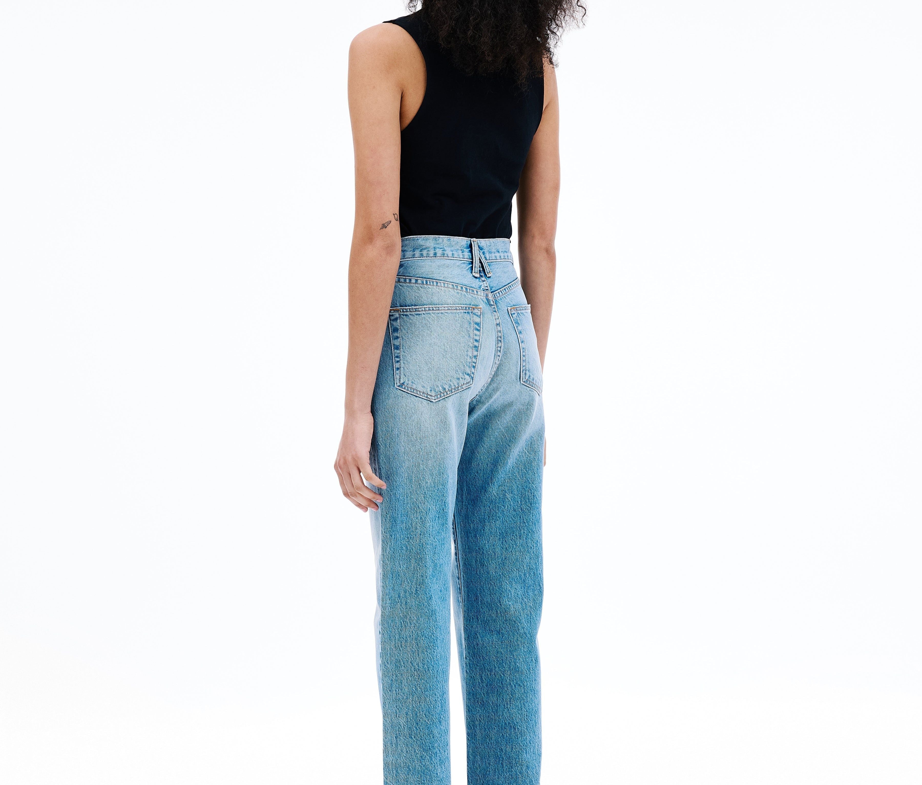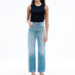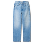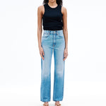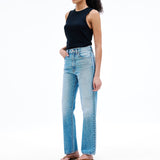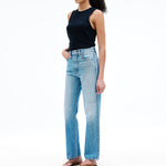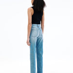 Introducing SLVRLAKE's London Straight High Rise Denim Jean in Trust Your Heart, crafted to enhance and flatter the feminine form, offering a straight leg silhouette and a high-rise fit that visually elongates the legs.