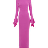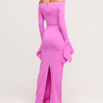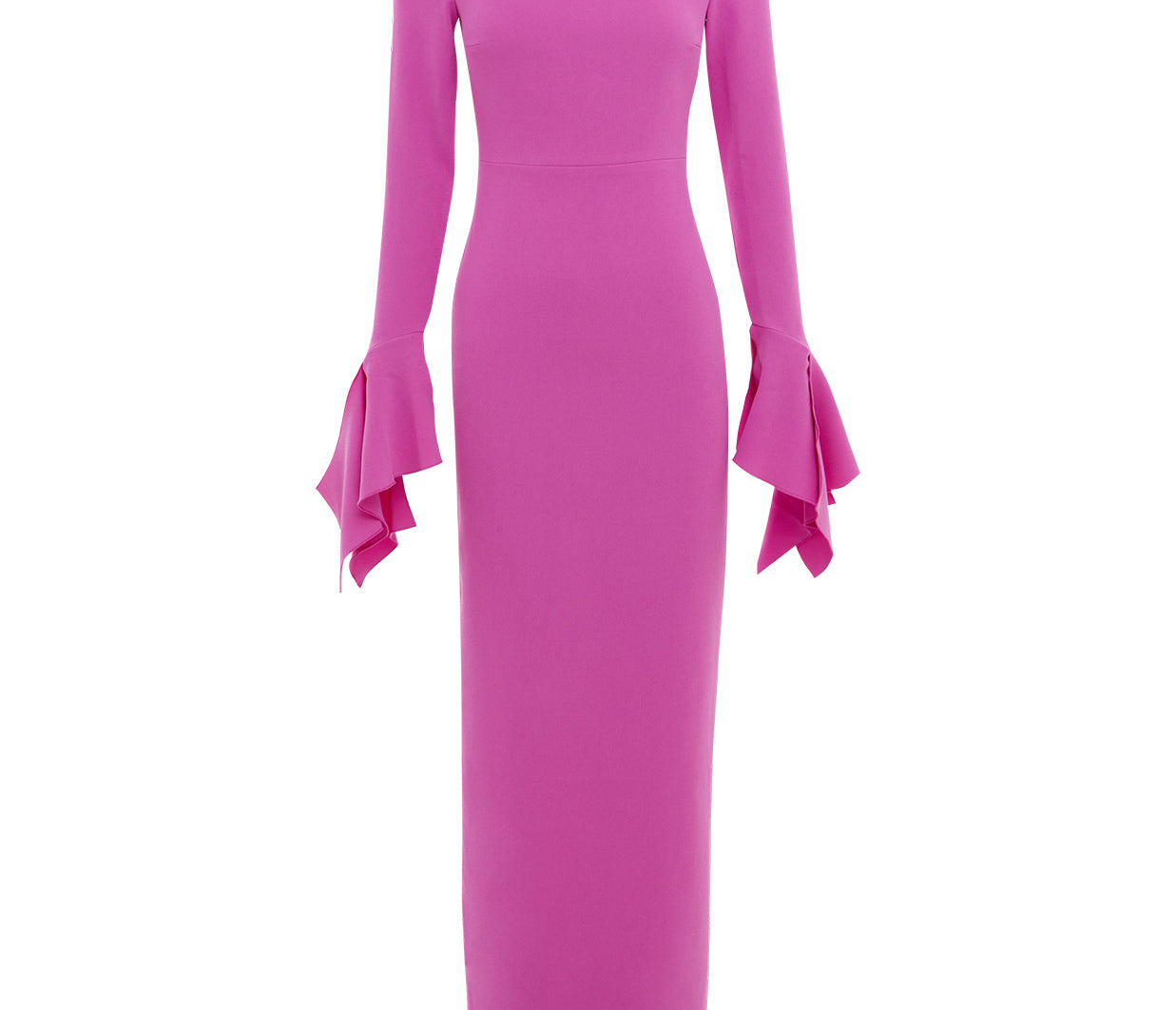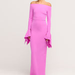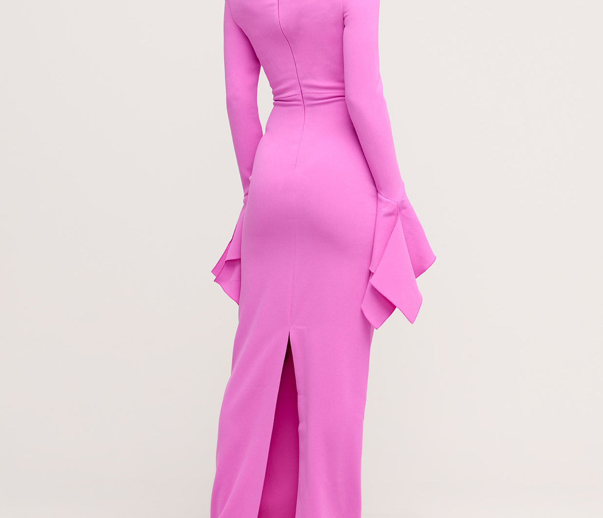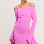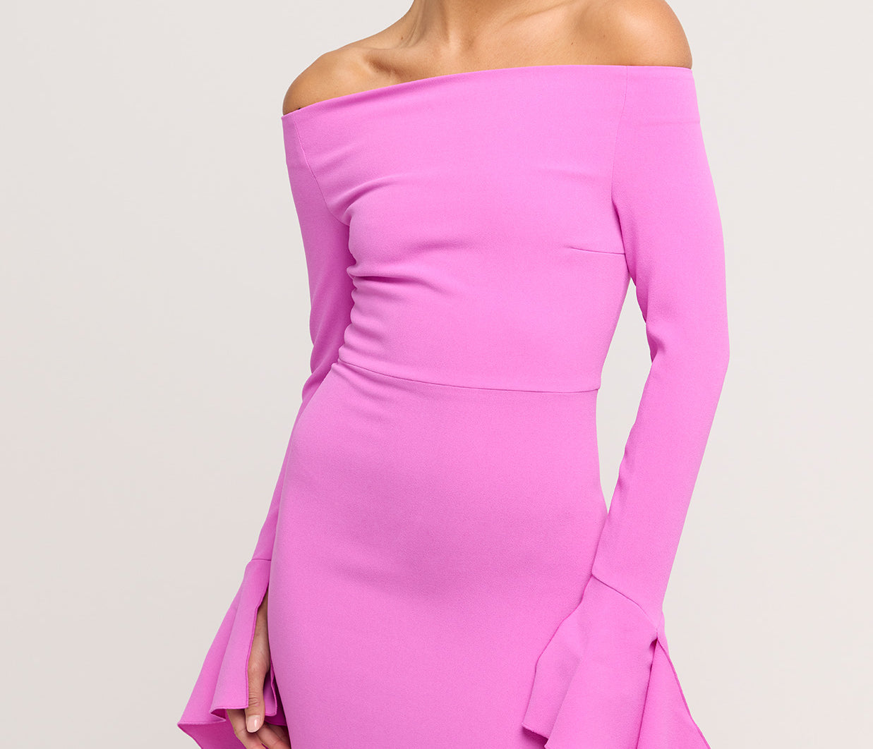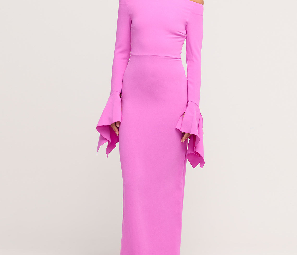 Solace London's creations are expertly crafted to seamlessly blend bold statements with practical wearability. Crafted from a body-contouring crepe fabric, the 'Amalie' gown features a gracefully sweeping off shoulder neckline and delicate bell sleeves that flutter with every step. Pair yours with a gold heel and statement earring for your next event.