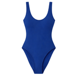 Introducing Solid and Striped's Hailey One Piece in Cloud Terry Maritime Navy, a classic one-piece swimsuit in blue hue. Crafted from a textured cable jacquard fabric, this classic one-piece features a flattering scoop neckline, low back, and high-cut legs that elongate the silhouette. With a built-in shelf bra for added support, it’s the perfect companion for sun-soaked summer days.