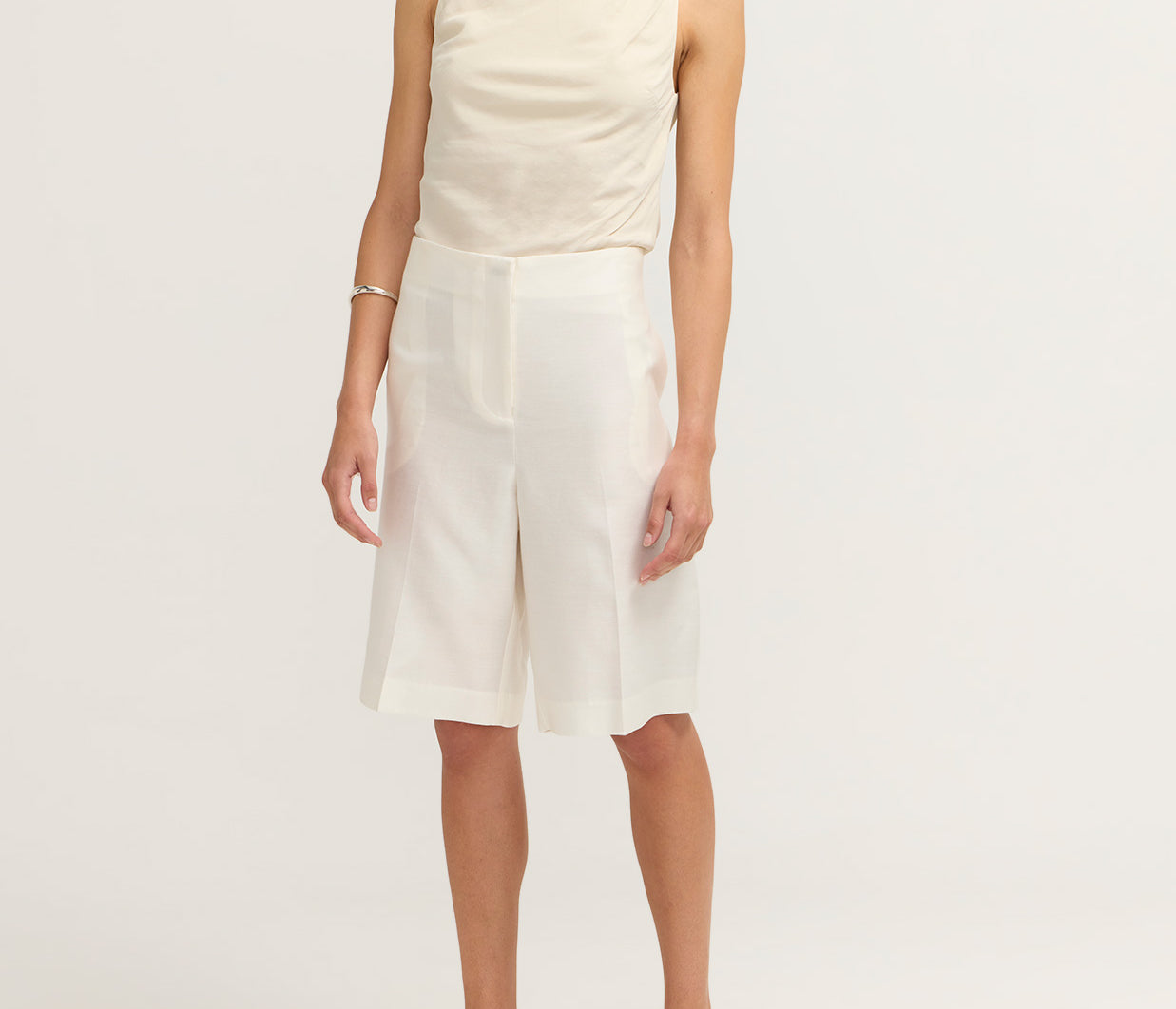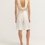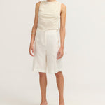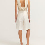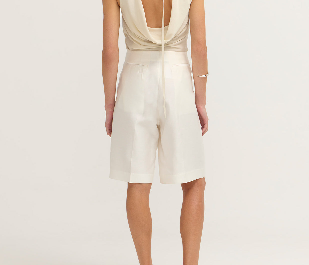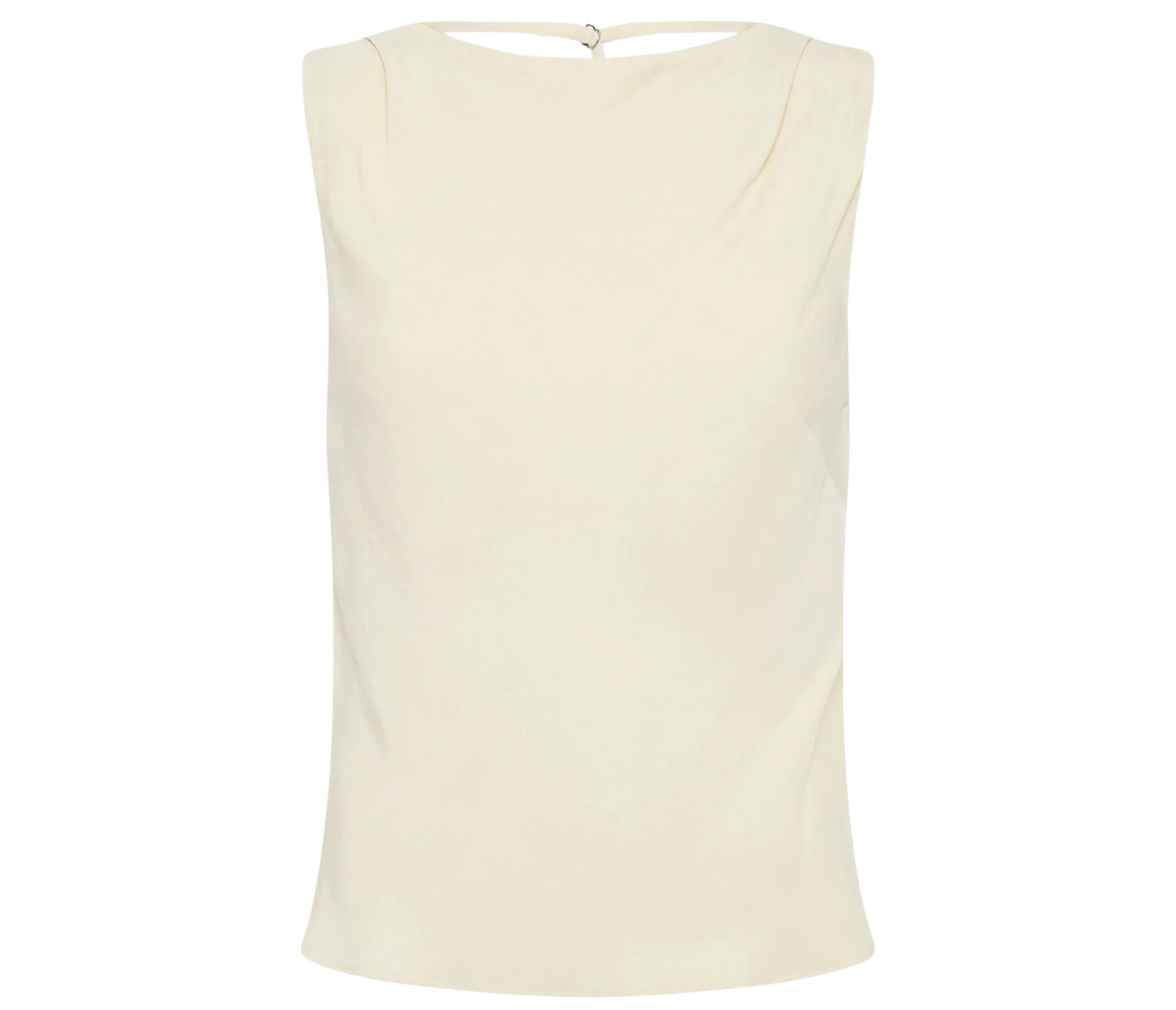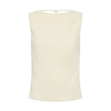Introducing the Draped Cowl Top in Dove. This top features an adjustable neck strap, ensuring a perfect fit for every wear. The invisible side zip maintains a sleek silhouette, while the low-draped cowl back adds a daring touch, revealing just a hint of skin.