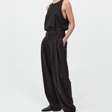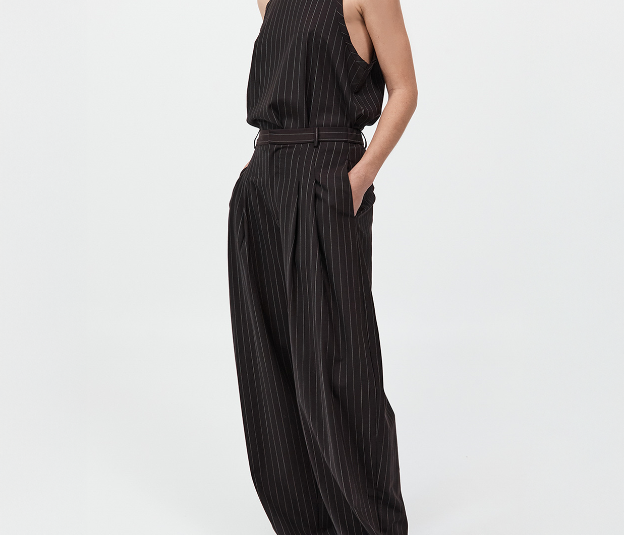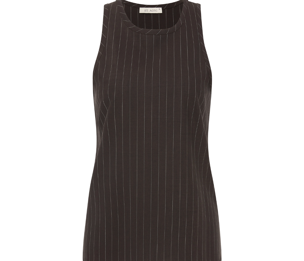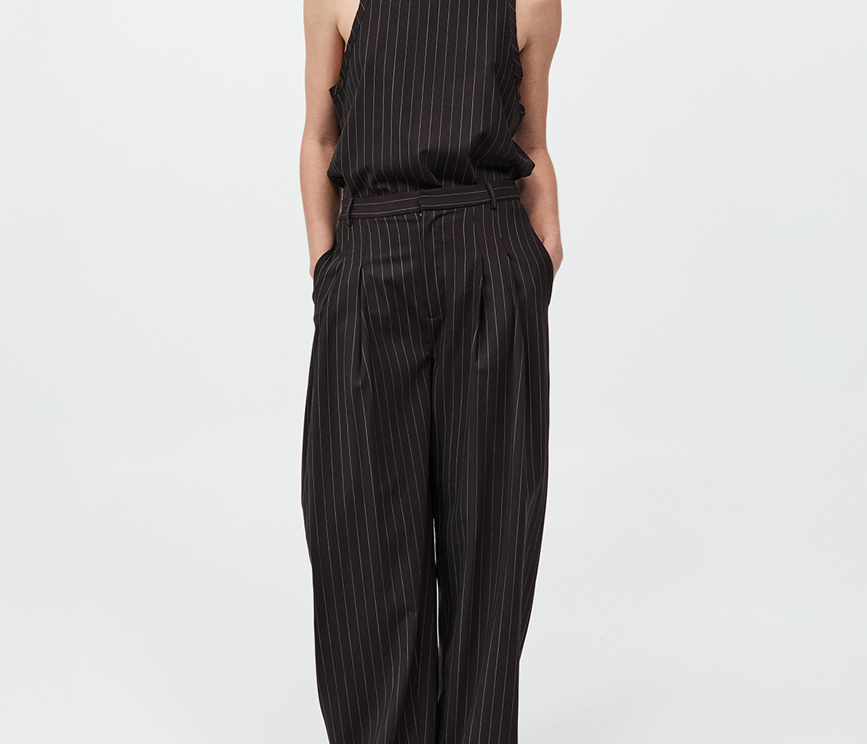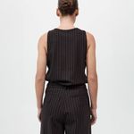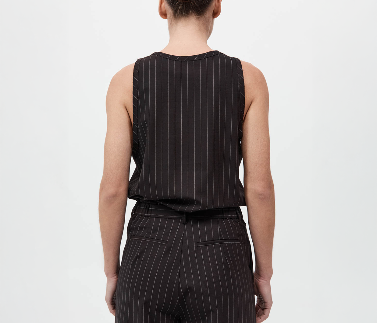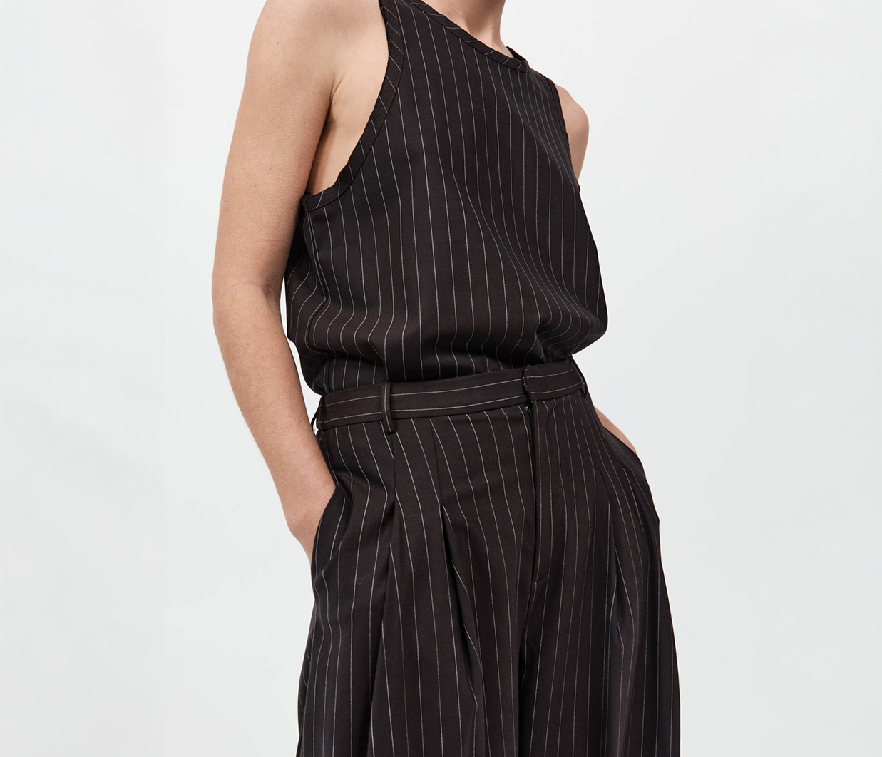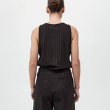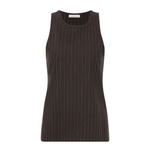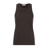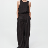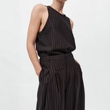 Introducing the Wool Pinstripe Tank in Mahogany Stripe a refined take on everyday essentials. Crafted from soft, responsibly sourced wool, this sleeveless design features a classic crew neckline with subtle binding details at the armholes and neck for a clean, tailored finish. Pair with the Wool Pinstripe Tapered Pants for a coordinated look.