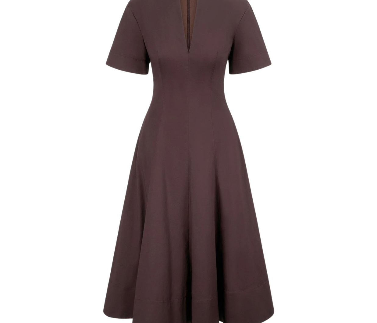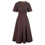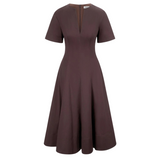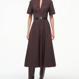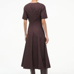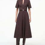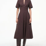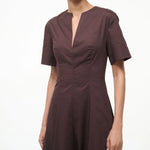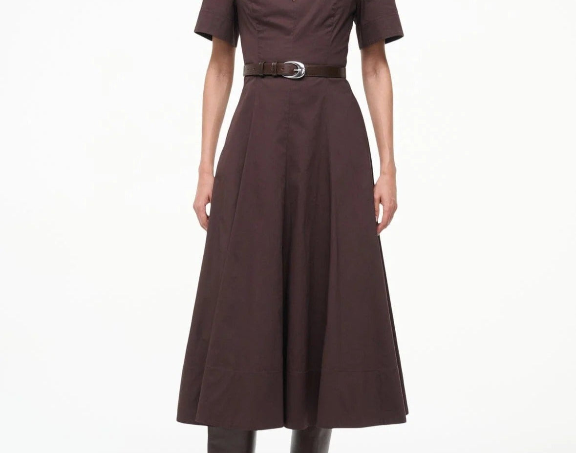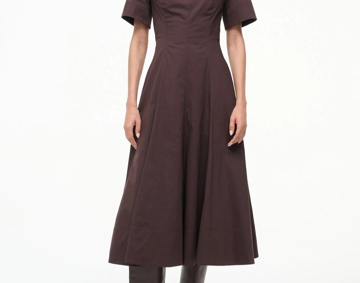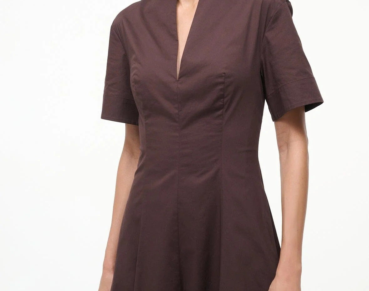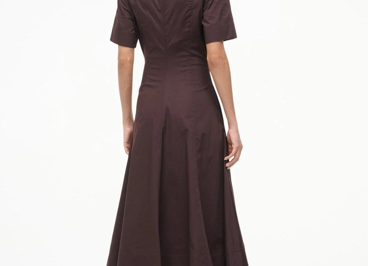 Introducing Staud's Frances Dress in Earth a short-sleeved shirt dress silhouette in a chocolate brown hue. Crafted in cotton poplin, this short-sleeve dress features a flattering split neckline and an A-line skirt for effortless movement. The rich Sangria hue adds a bold yet versatile touch, making it the perfect cotton poplin dress to wear from day to evening.
