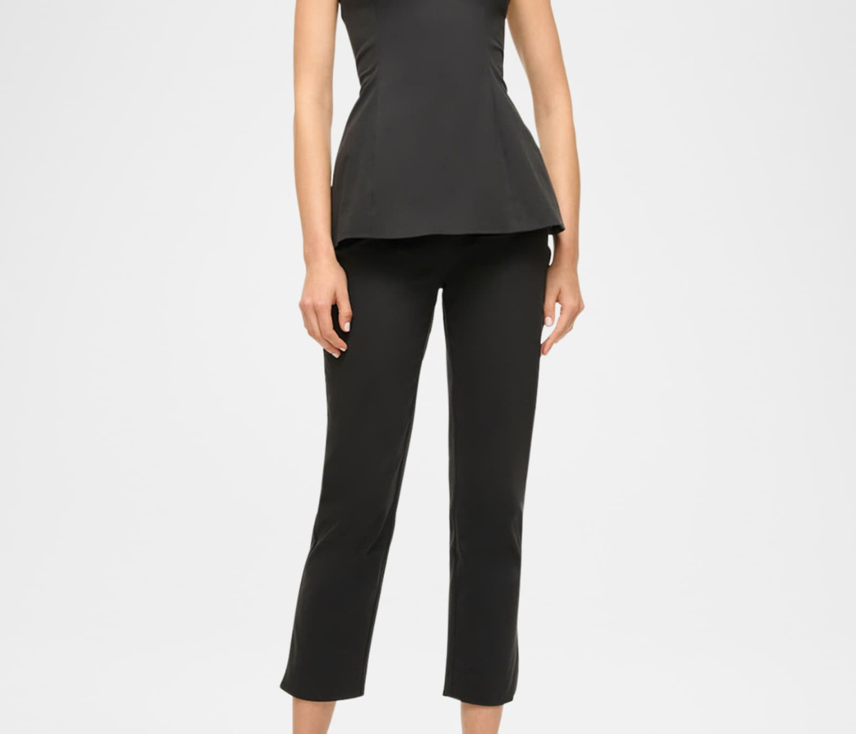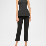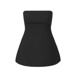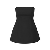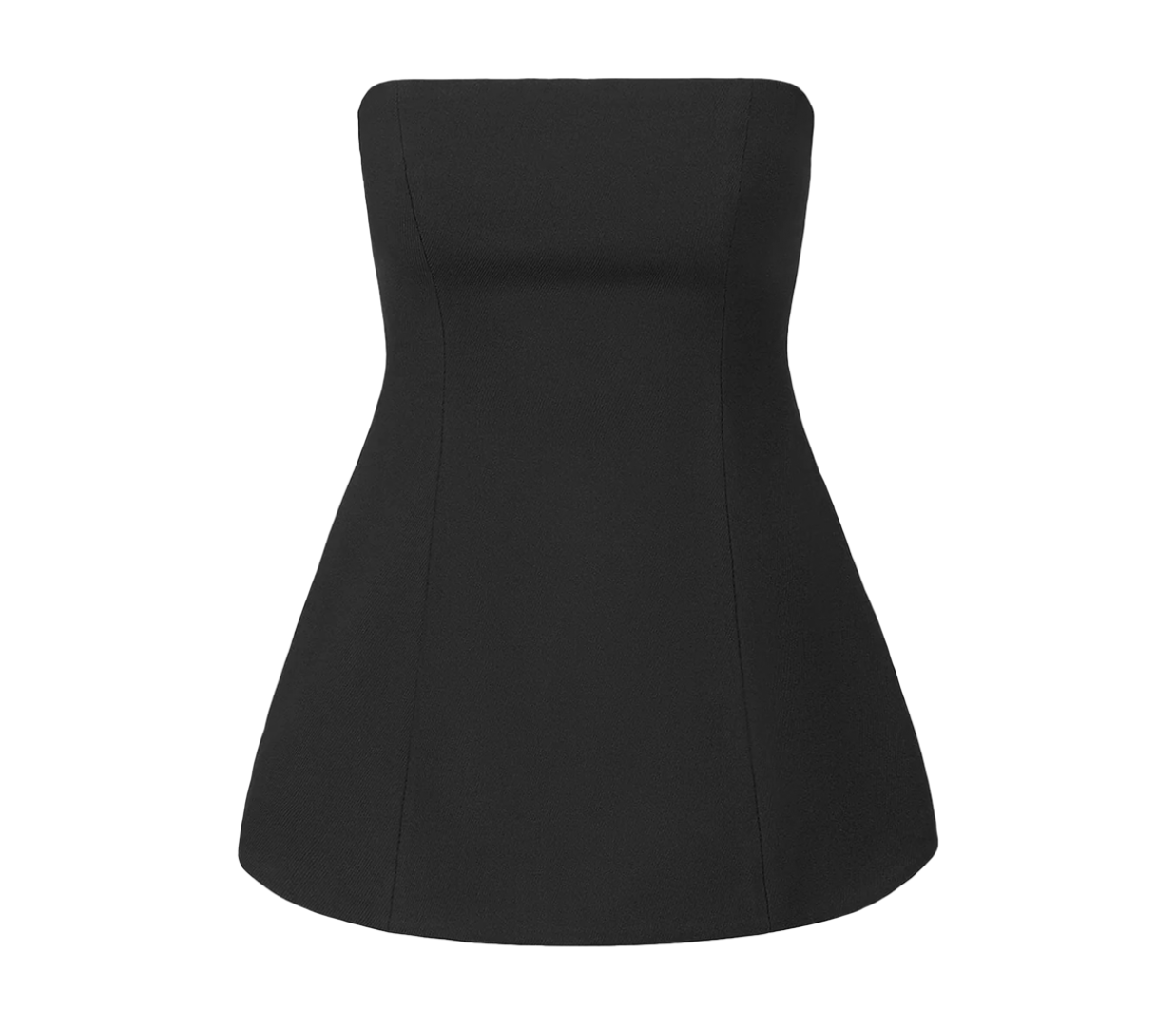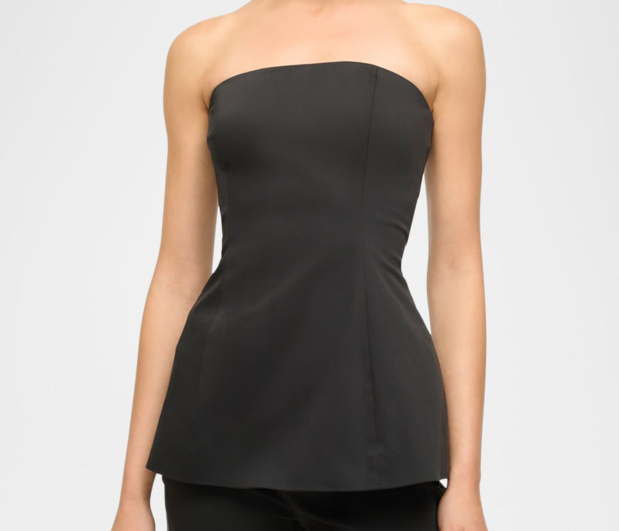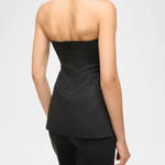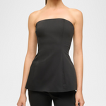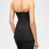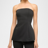 The Silvia Top in Black is a strapless peplum-style top designed with flattering shaping at the hips. It features a center-back zipper for a secure fit and a sleek, structured silhouette.