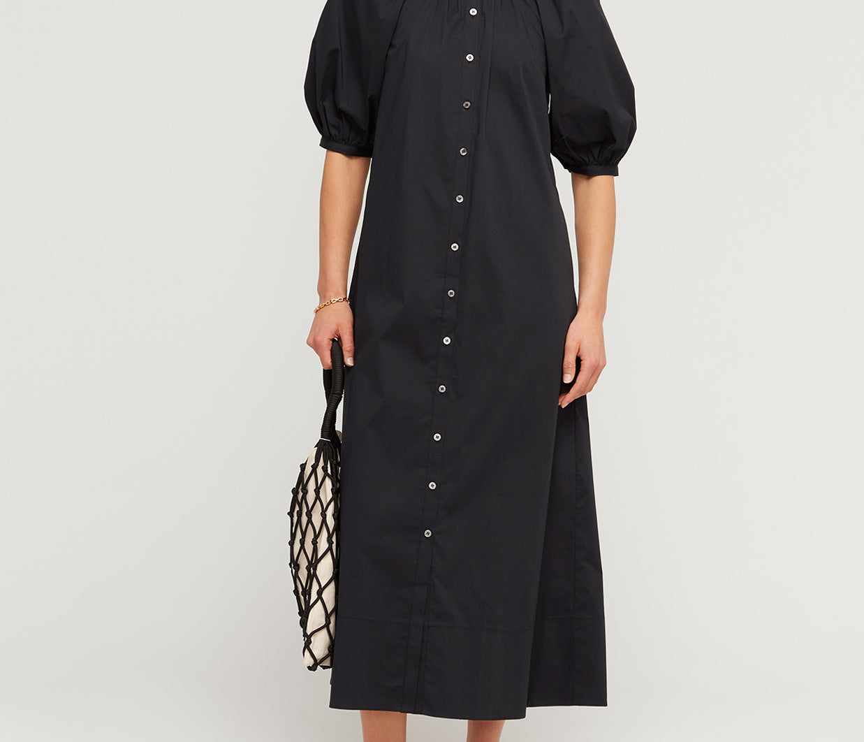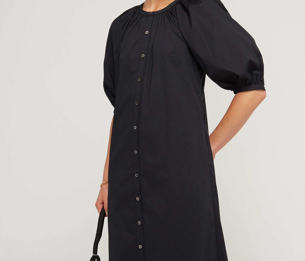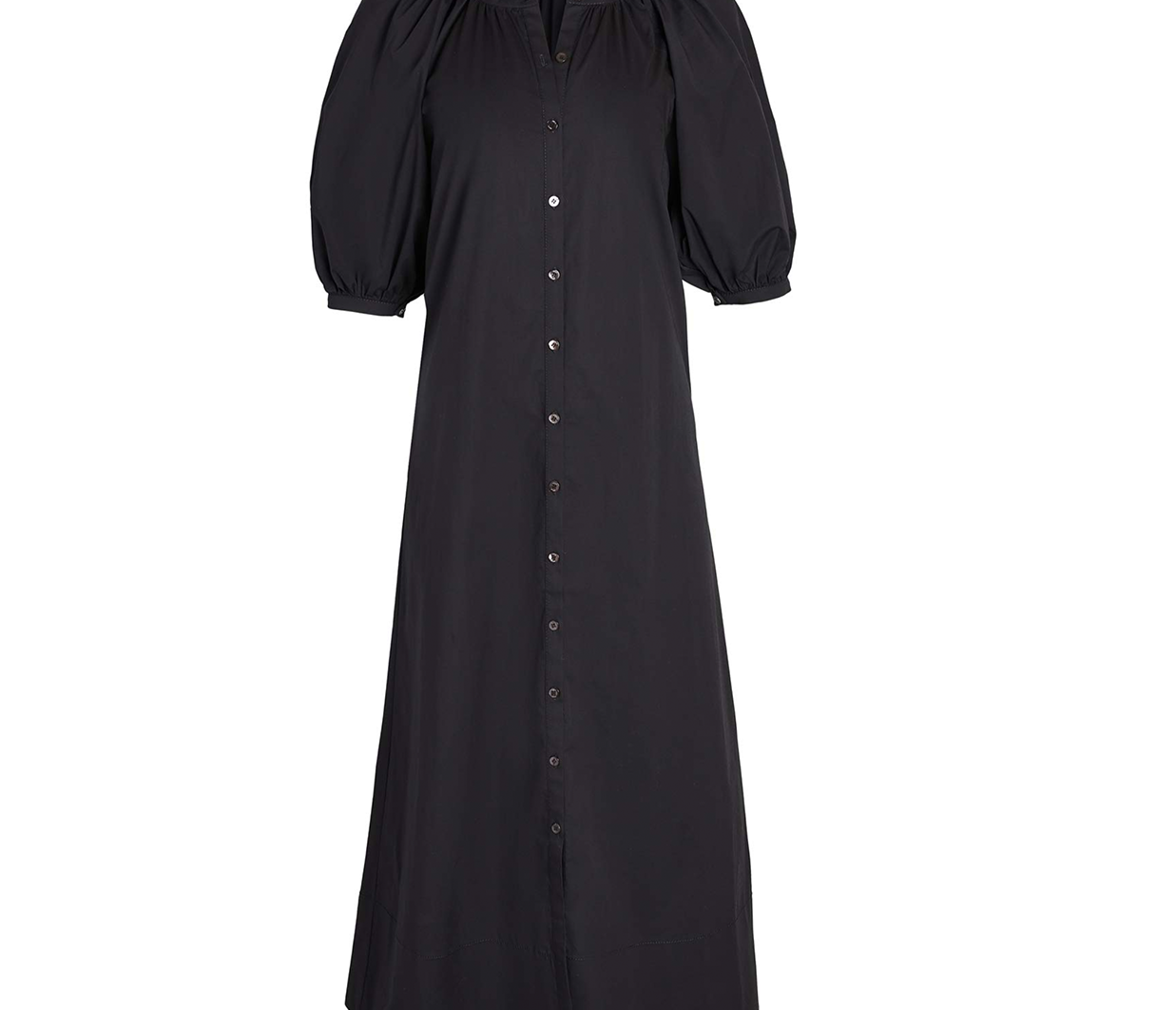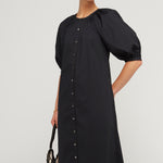 A generously proportioned, airy dress crafted from a timeless cotton poplin fabric. This dress showcases voluminous balloon sleeves, convenient side seam pockets, and a button-front closure. Style it with your preferred belt for a personalised touch or wear it as it is for effortless chic.