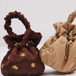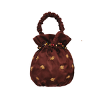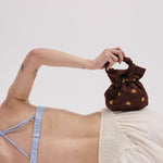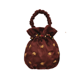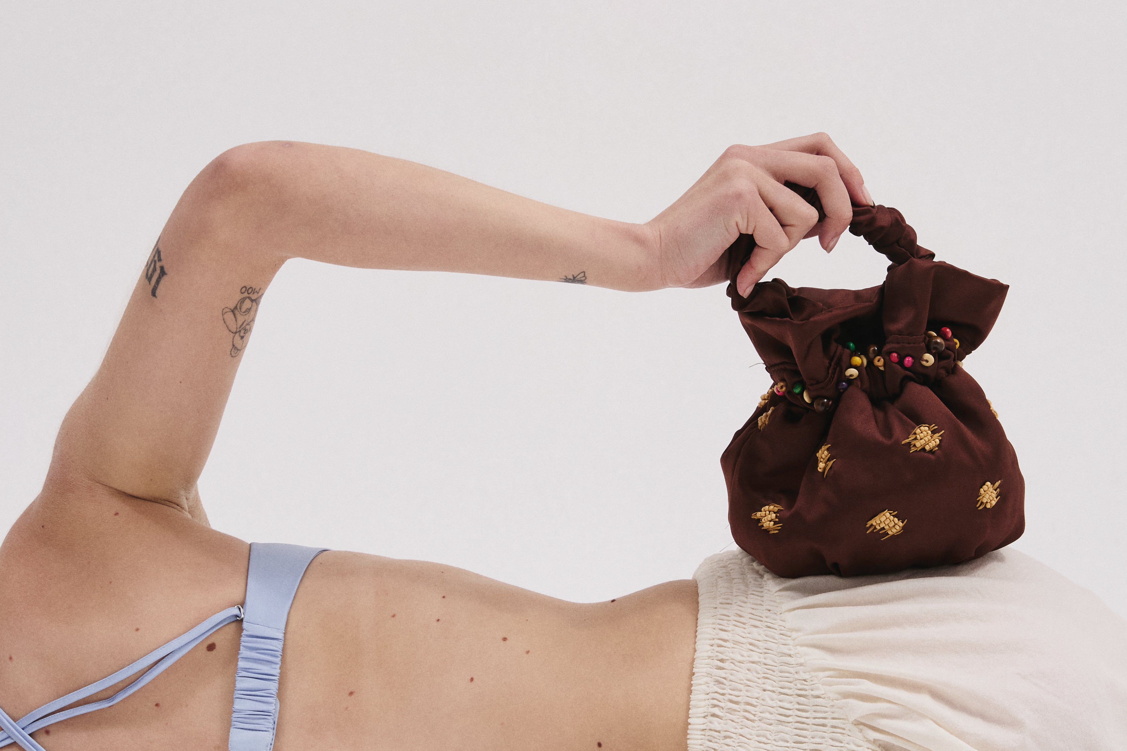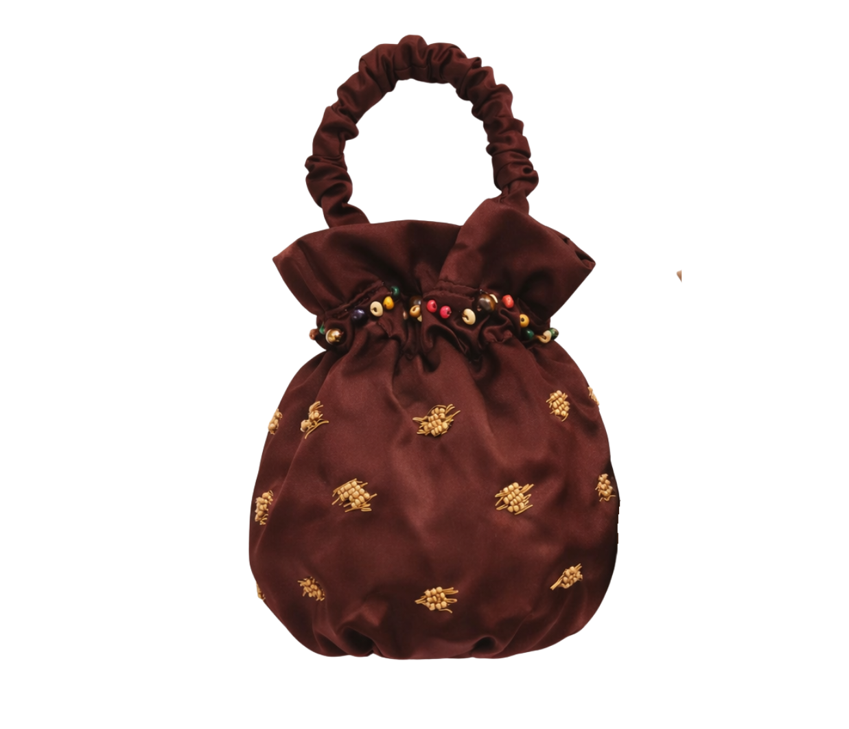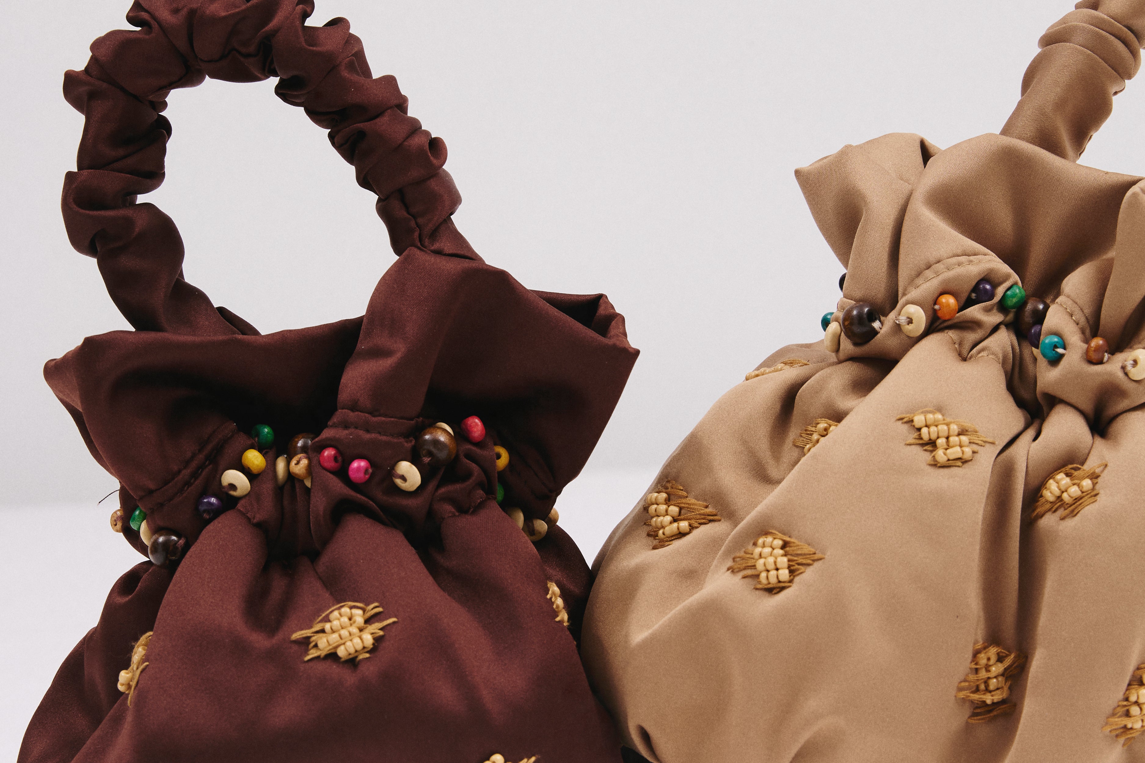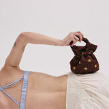 Introducing Suryo's Archive Dumpling in Chocolate, a handbag in brown chocolate. The Archive Dumpling bag is designed with gathered silky folds held tight, inspired by the shape and make of a dumpling, with a ruffled handle and sprinkled wooden and glass beads to create a traditional Balinese motif. Perfect accessory to complete your look.