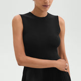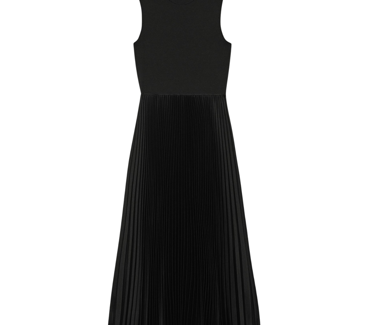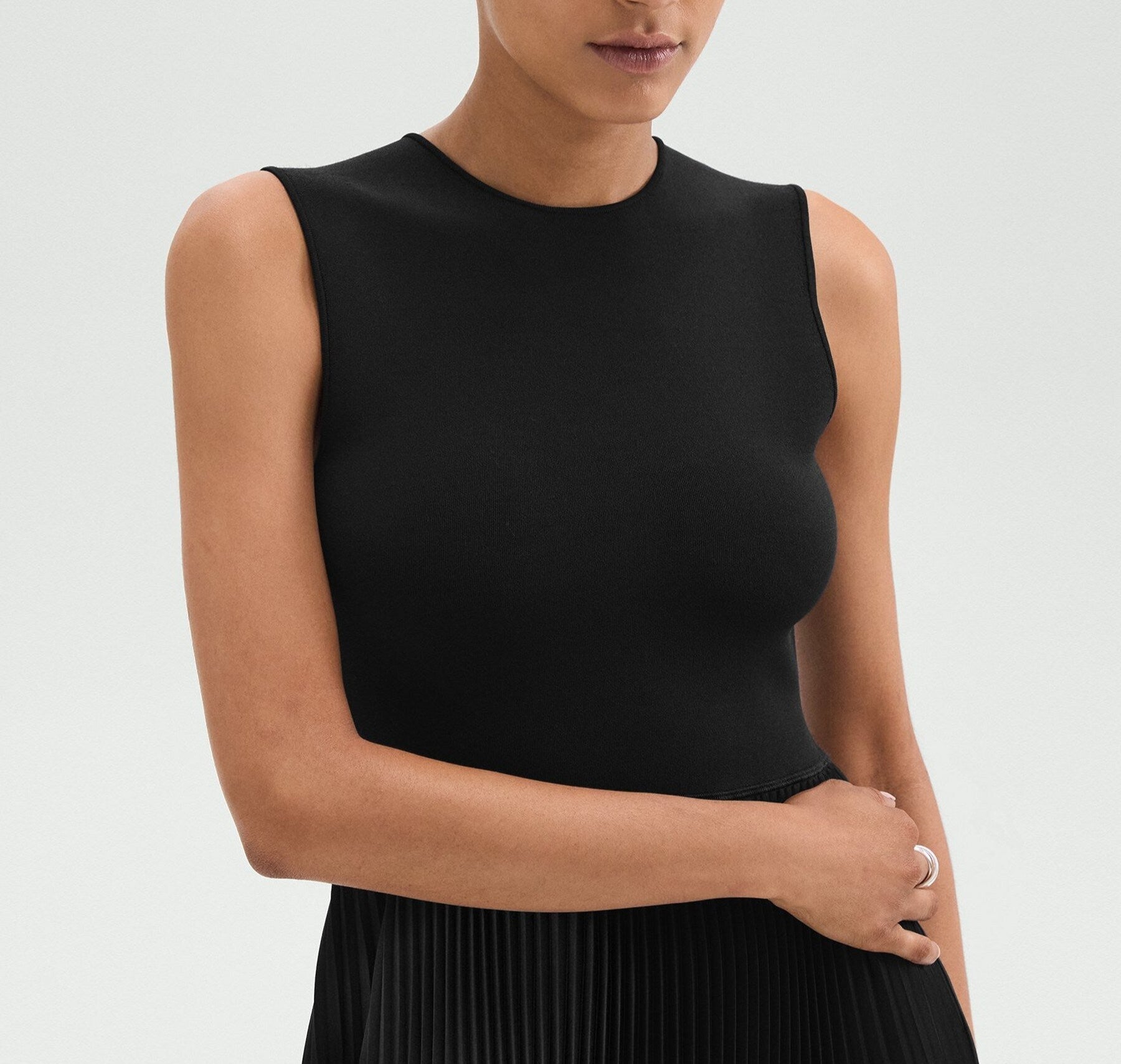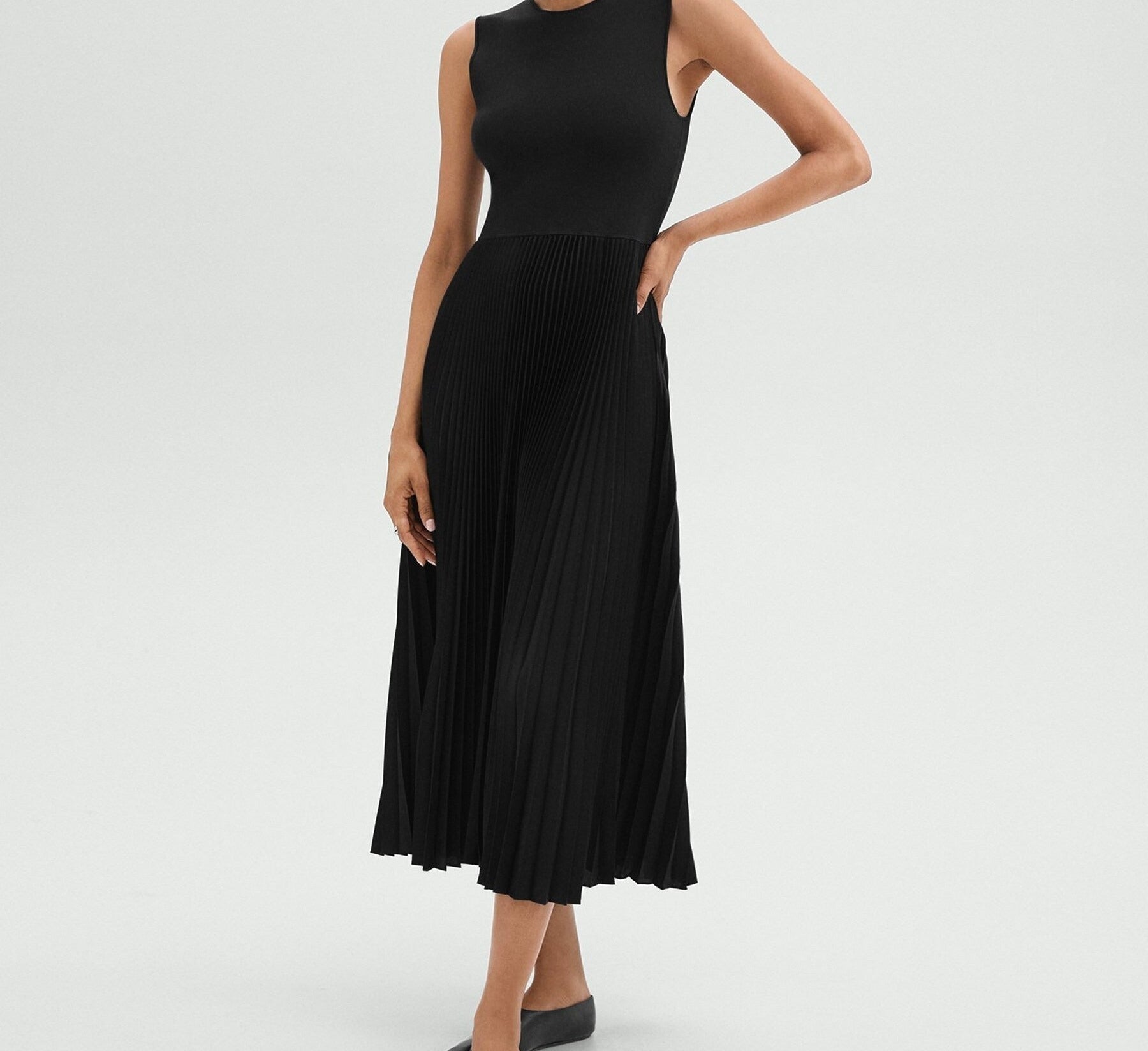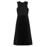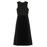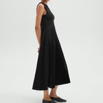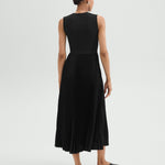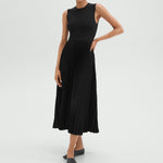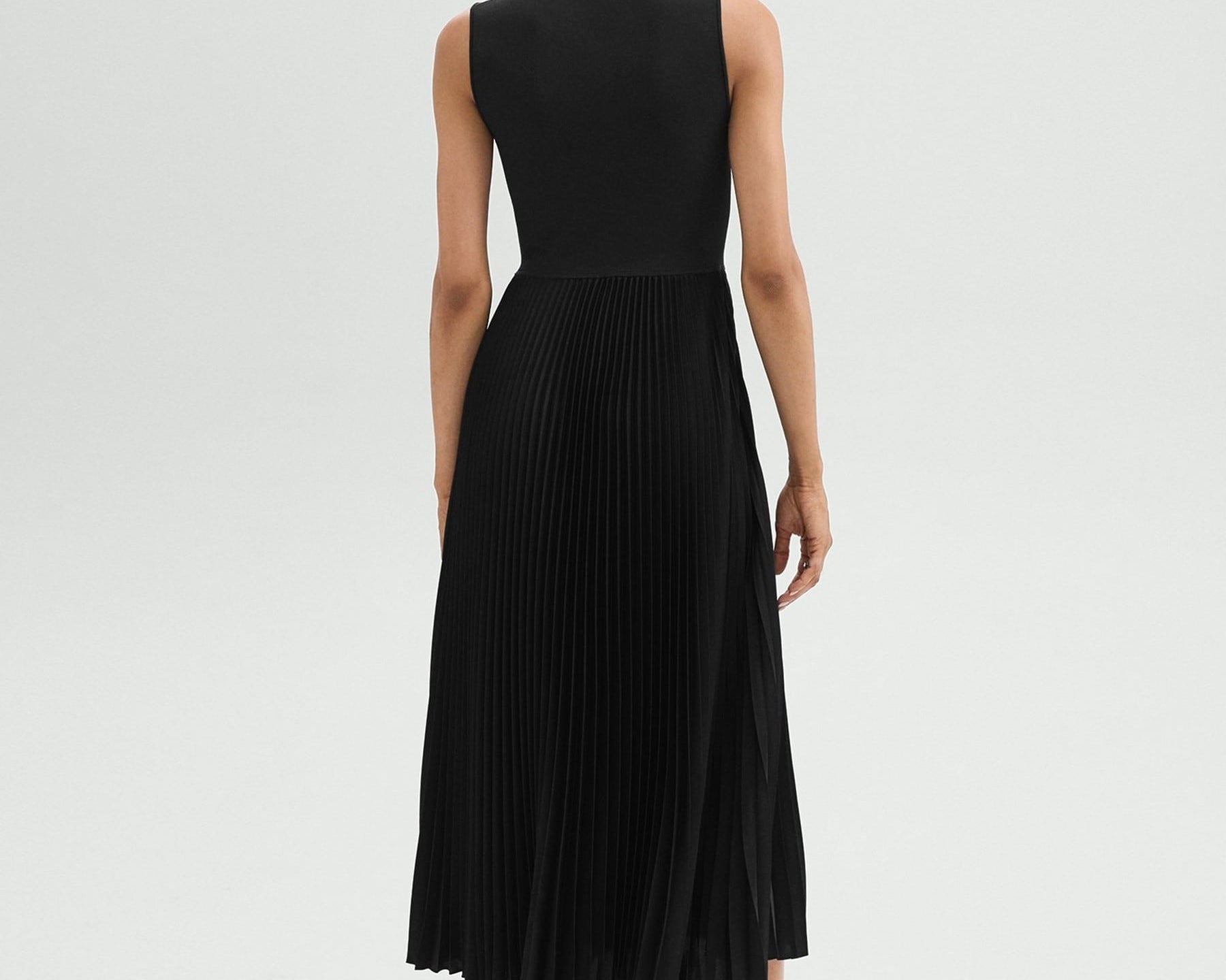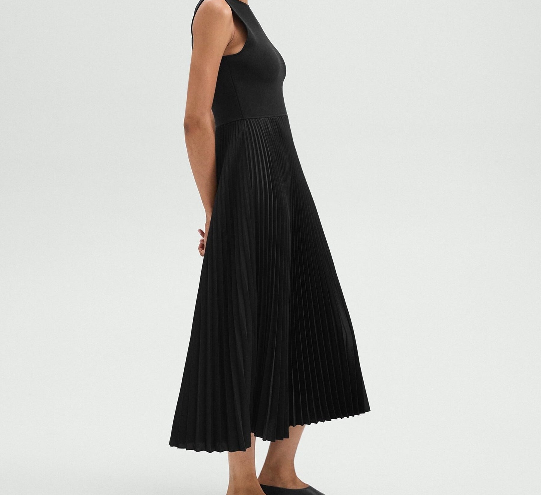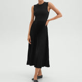 Introducing Theory's Pleated Satin Dress in Black, a sleeveless, midi length dress silhoutte in the color black. The sleeveless dress is detailed with a crewneck shell in rayon knit for a second-skin fit and tailored with a pleated midi skirt that is constructed with Theory's textured satin with a subtle sheen and luxurious hand-feel. Perfect for office wear and formal day to evening events.