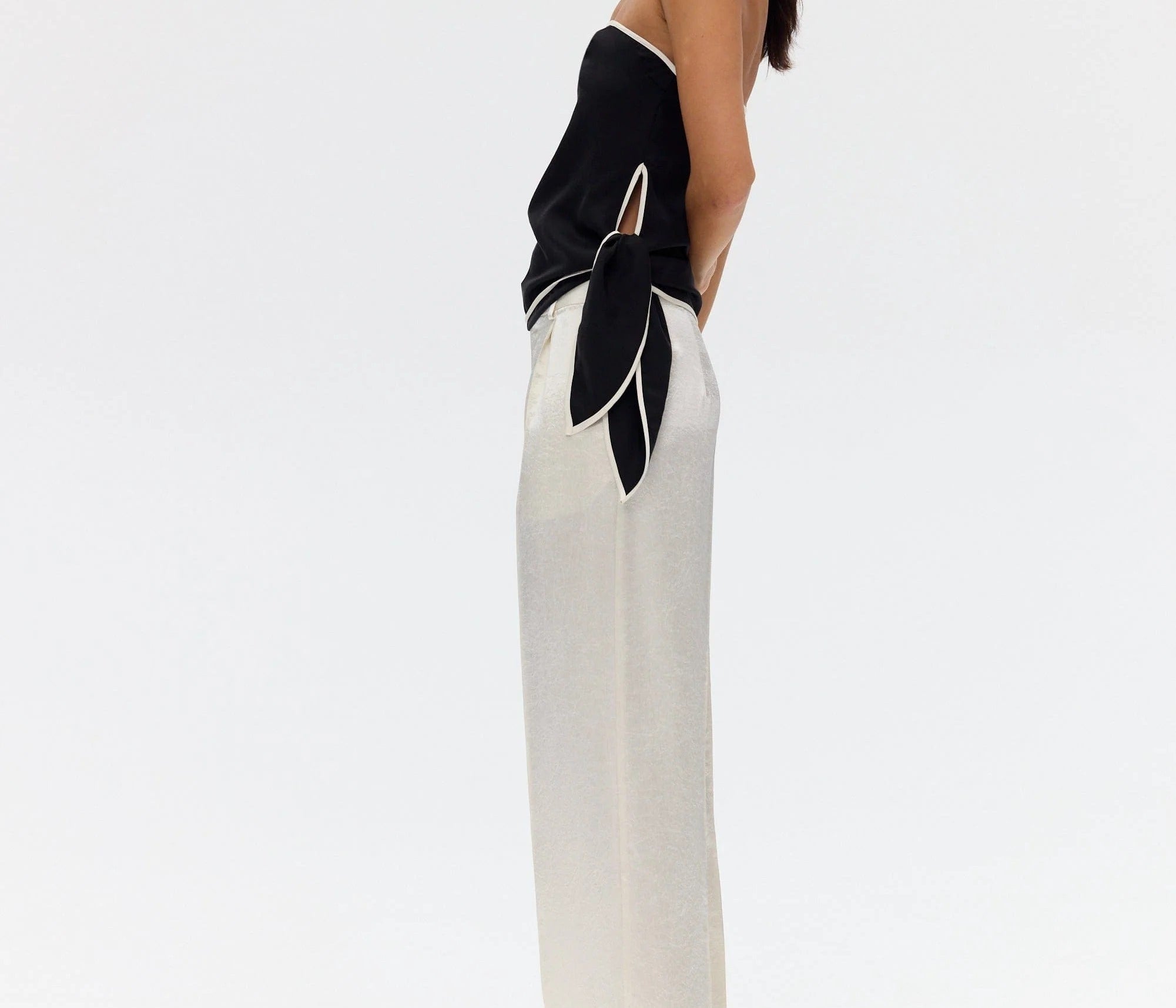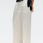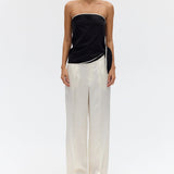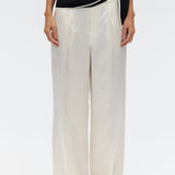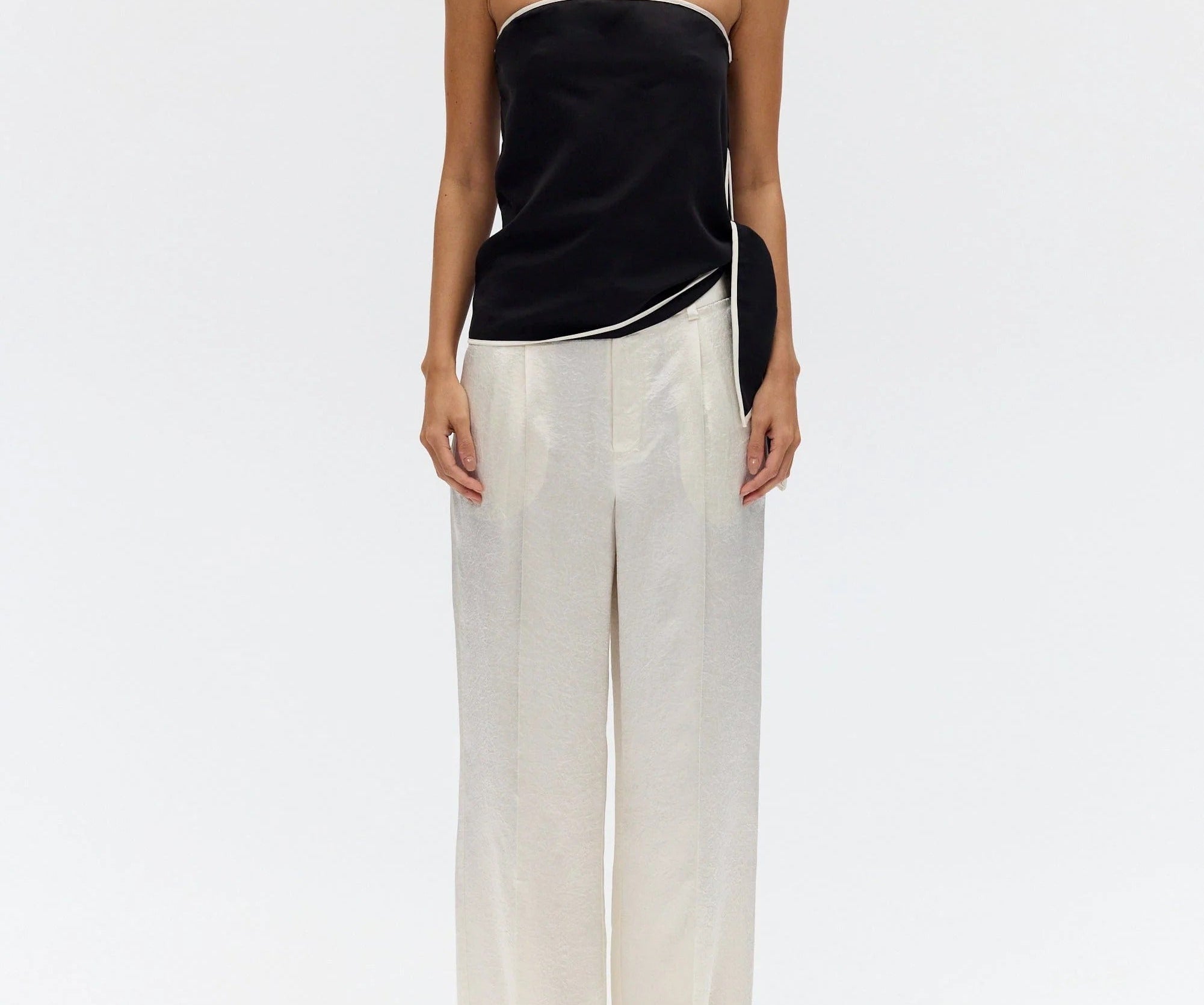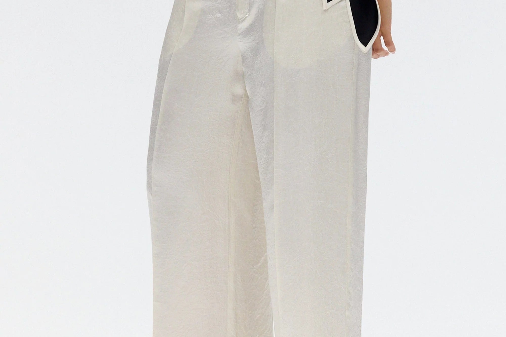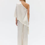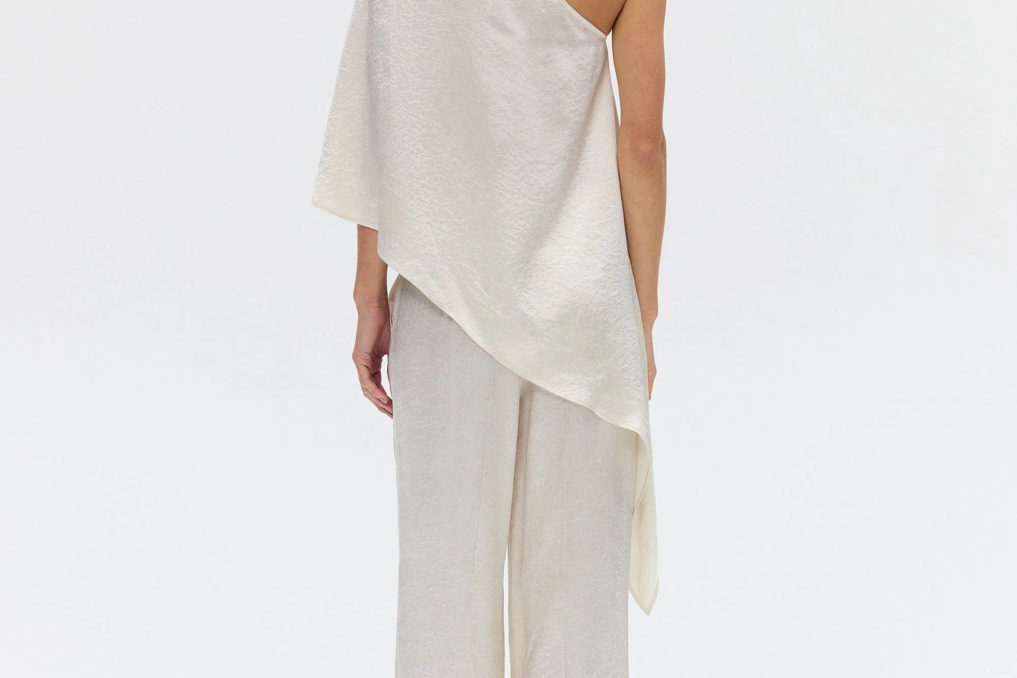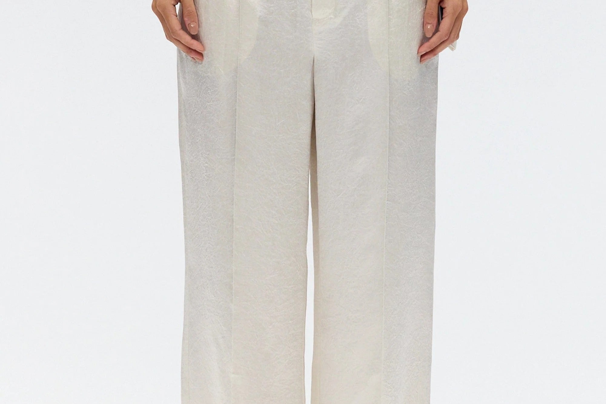 Introducing Third Form's Crush Tailored Trouser in Cream, a wide-leg tailored trouser pant silhouette in cream. Designed to sit mid-waist, the silhouette falls into a fluid, wide leg, featuring soft front pleats with gentle structure and finished with side pockets. Style it with the Crush One Shoulder in Cream for an elevated, coordinated look.