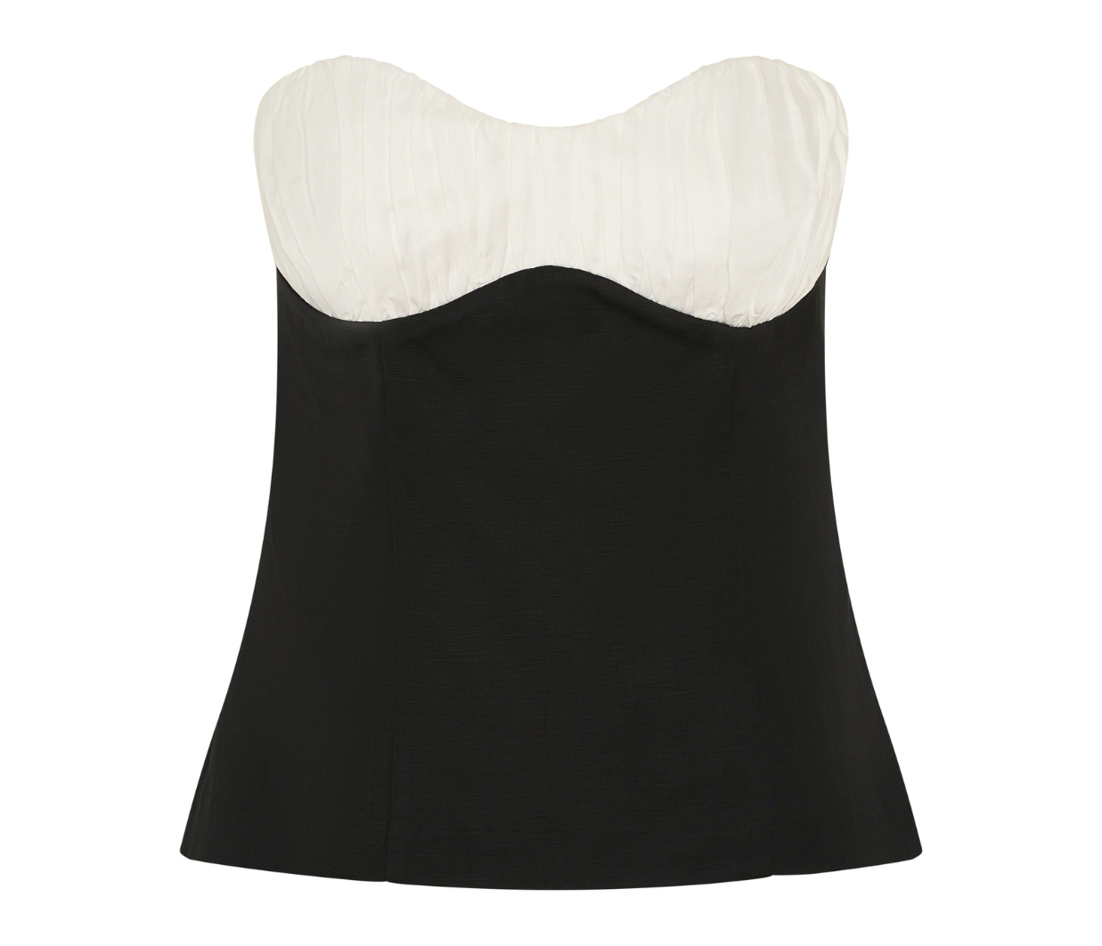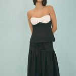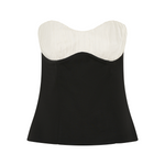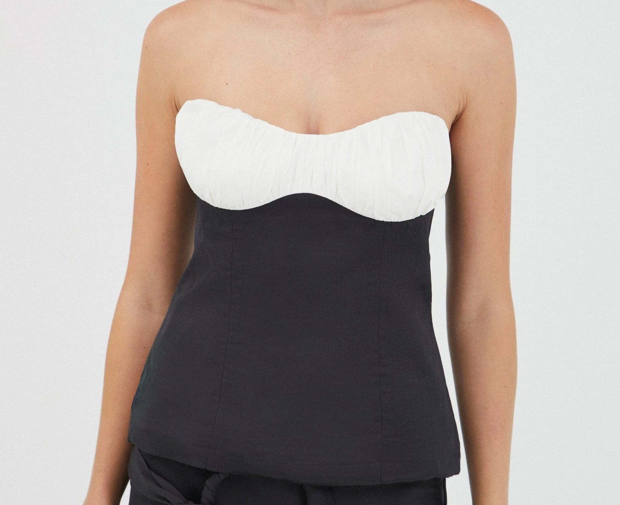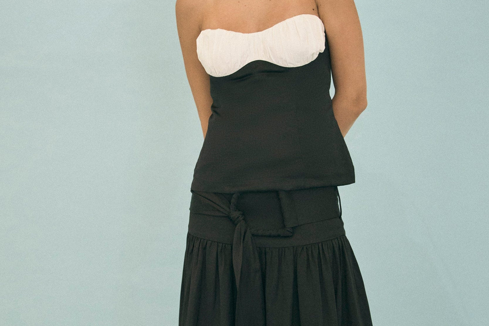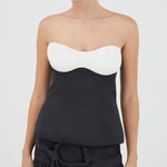 Introducing Third Form's Elysian Strapless Bodice Top in White Black, a strapless corset-style top with a structured, form-fitting silhouette. Designed with a contrasting colour block composition in white and black hues. The strapless top features a softly gathered bra detail that adds dimension through the bust and panels throughout to create a close, sculpted fit, balancing structure and fluidity.