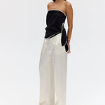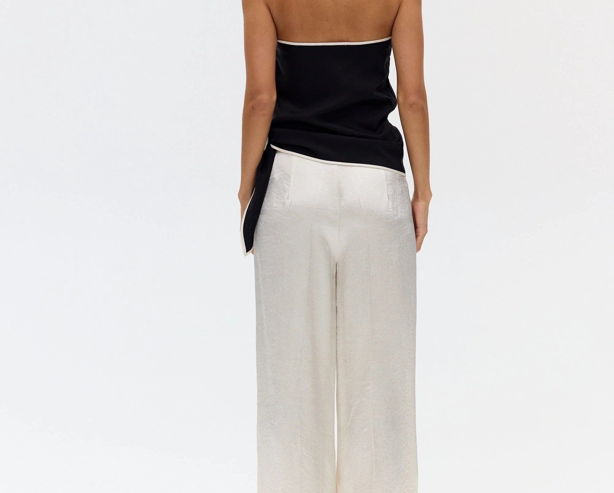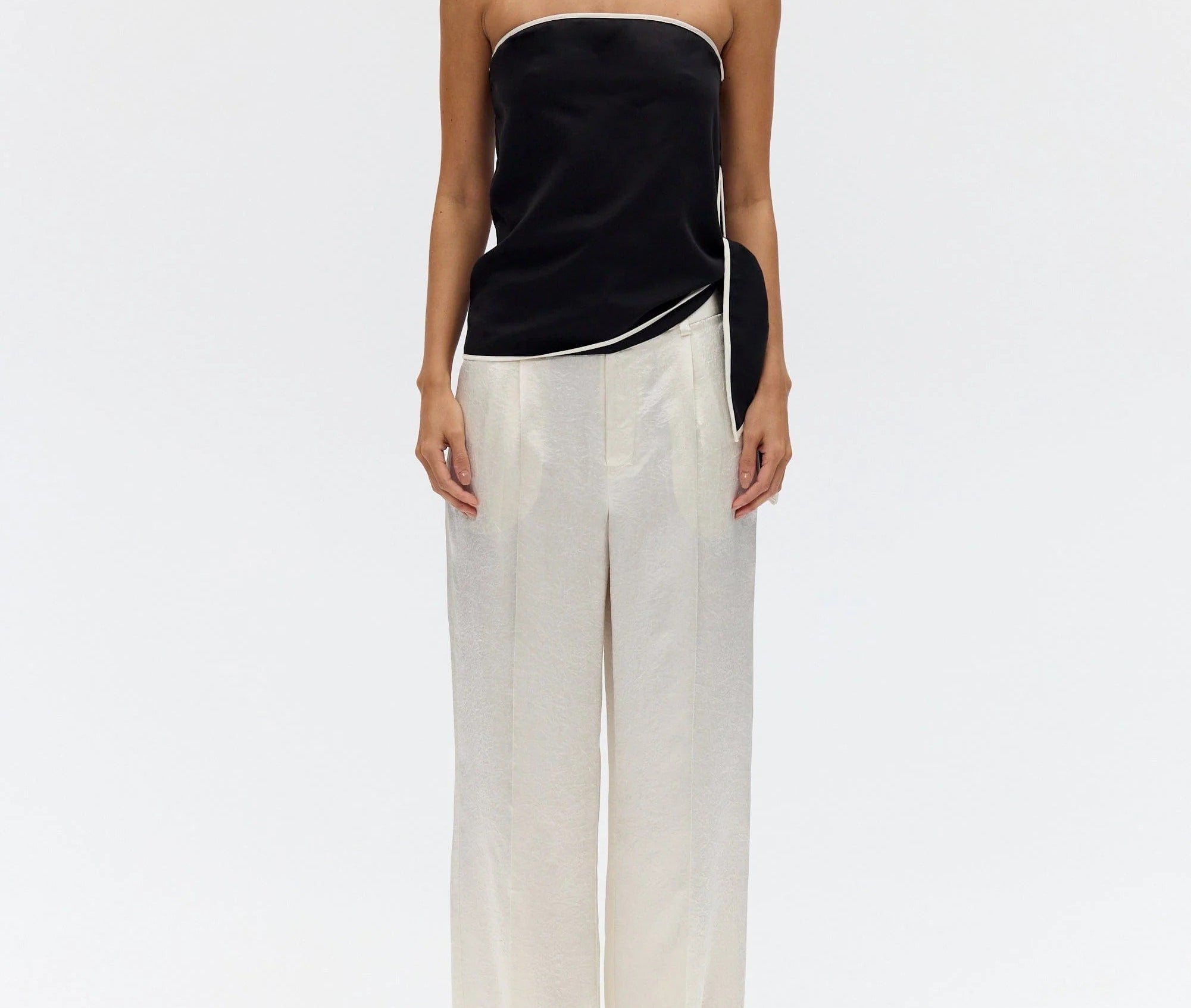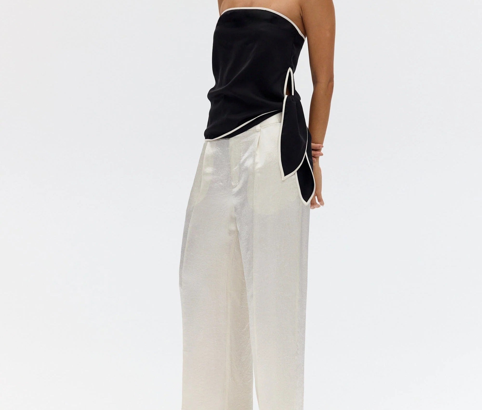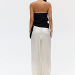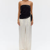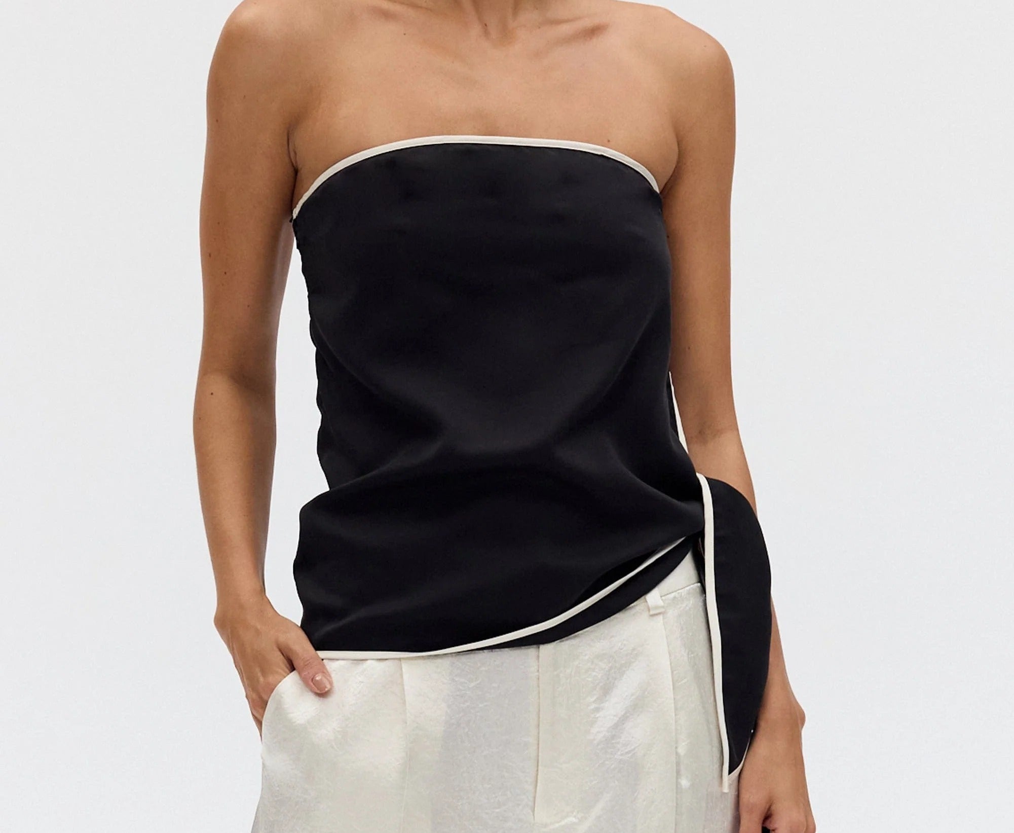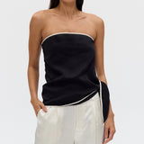 Introducing Third Form's Linger Strapless Top in Nocturne, a strapless top silhouette in black with a contrasting white edge. Designed with a straight neckline with contrast binding along the edge and hem, the silhouette falls softly over the body with an effortless drape. A subtle tie detail at the side adds ease and movement.