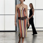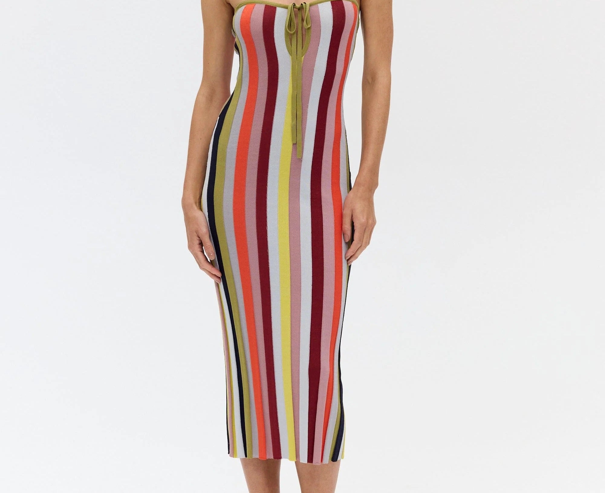Introducing Third Form's Rhythm Knit Strapless Midi Dress in Mirage Stripe, a strapless midi dress silhouette in a mirage stripe pattern. Designed in a fitted silhouette accentuating the figure, it features a tie-front keyhole neckline that can be styled multiple ways. Perfect for a day-to-evening occasion.