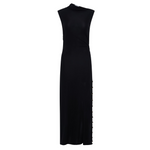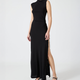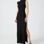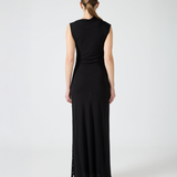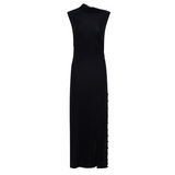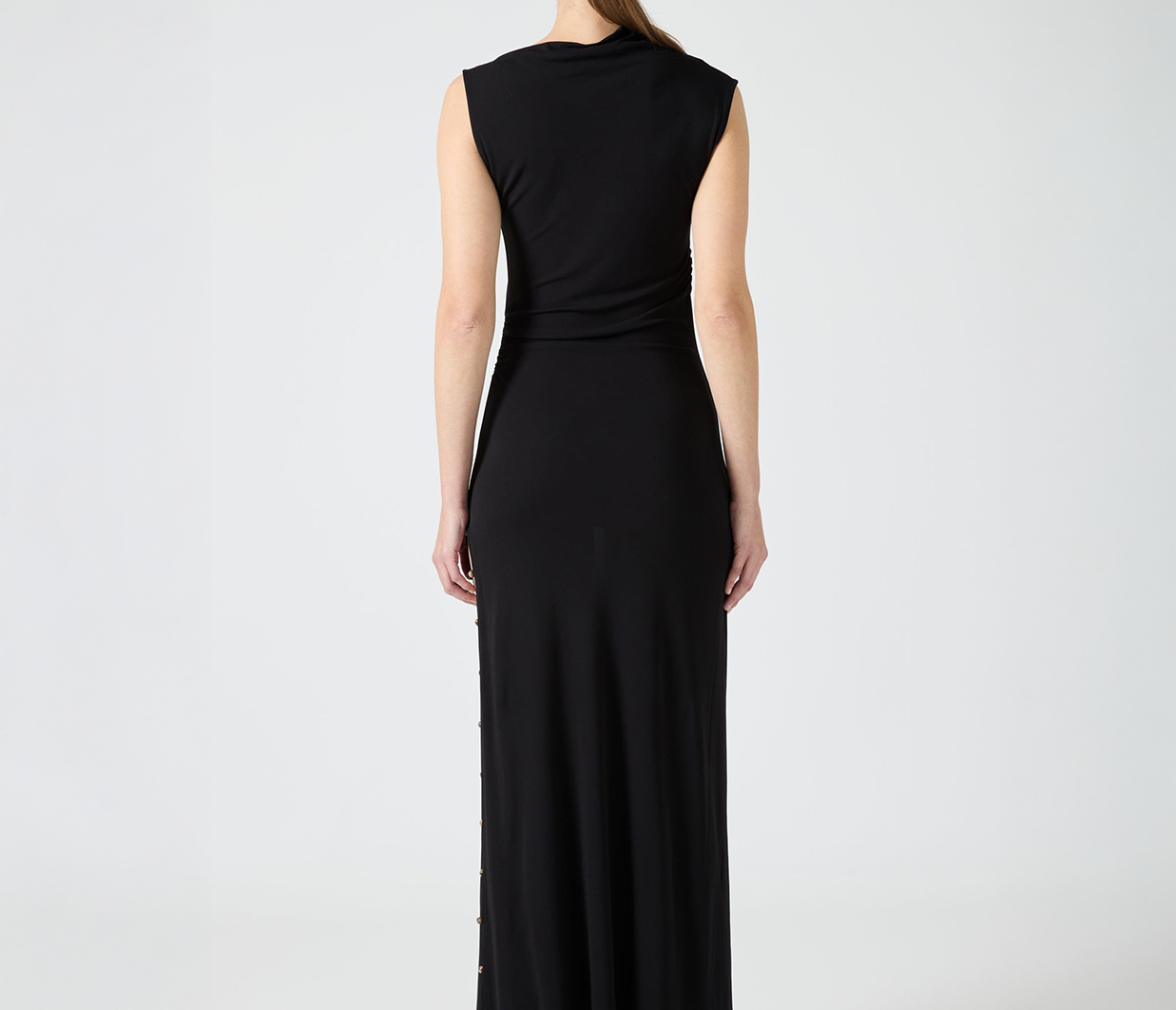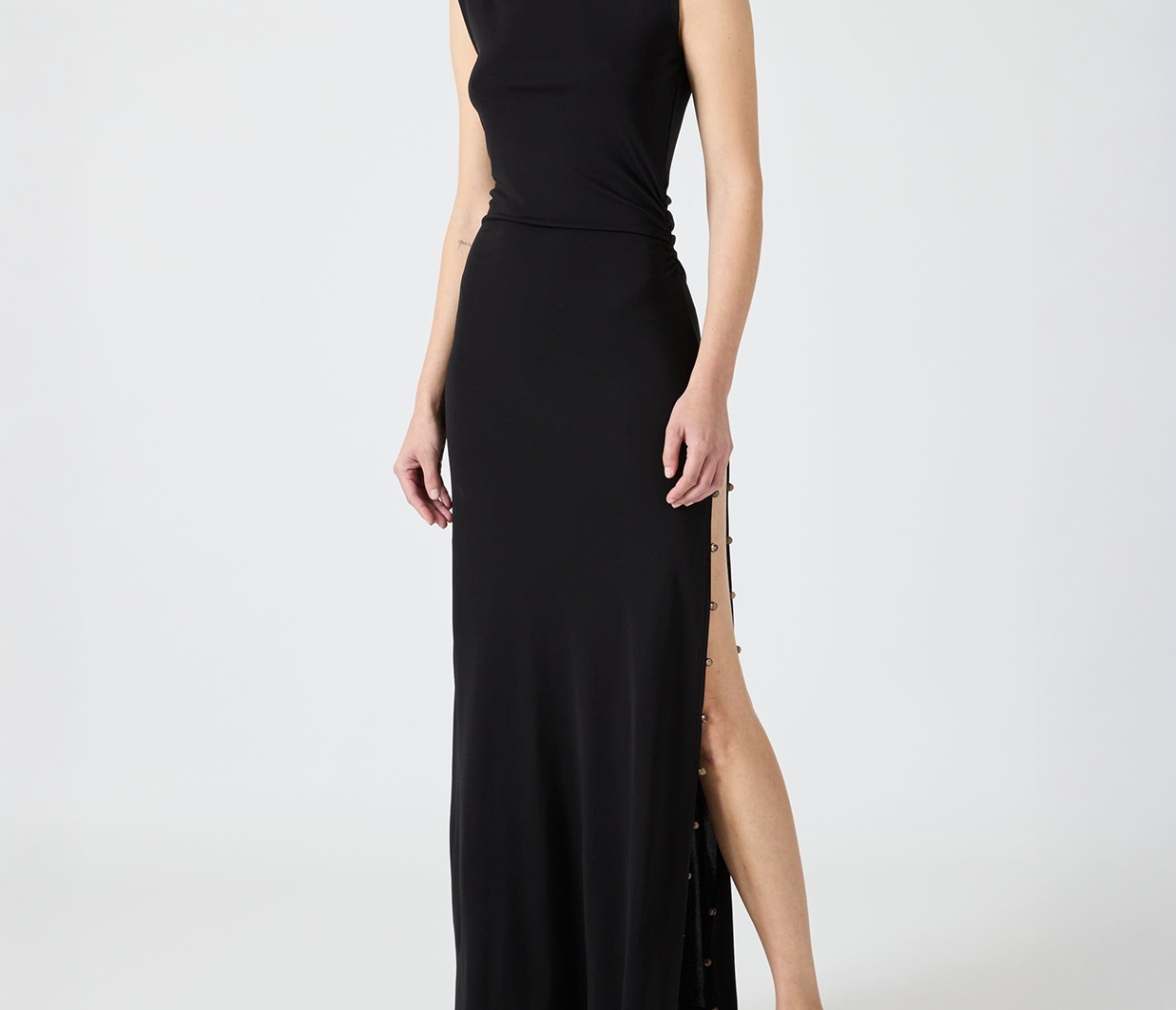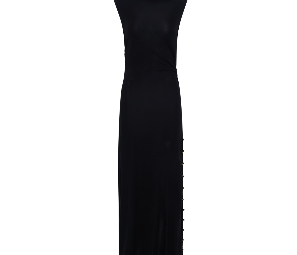 Introducing the Rolling Stone Maxi Dress in Black a fitted maxi crafted from high-stretch viscose jersey with a semi-sheer finish. Featuring an asymmetric neckline, gathered detailing through the body, and a side split adorned with hand-sewn beads.