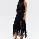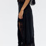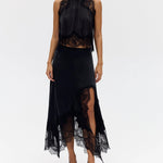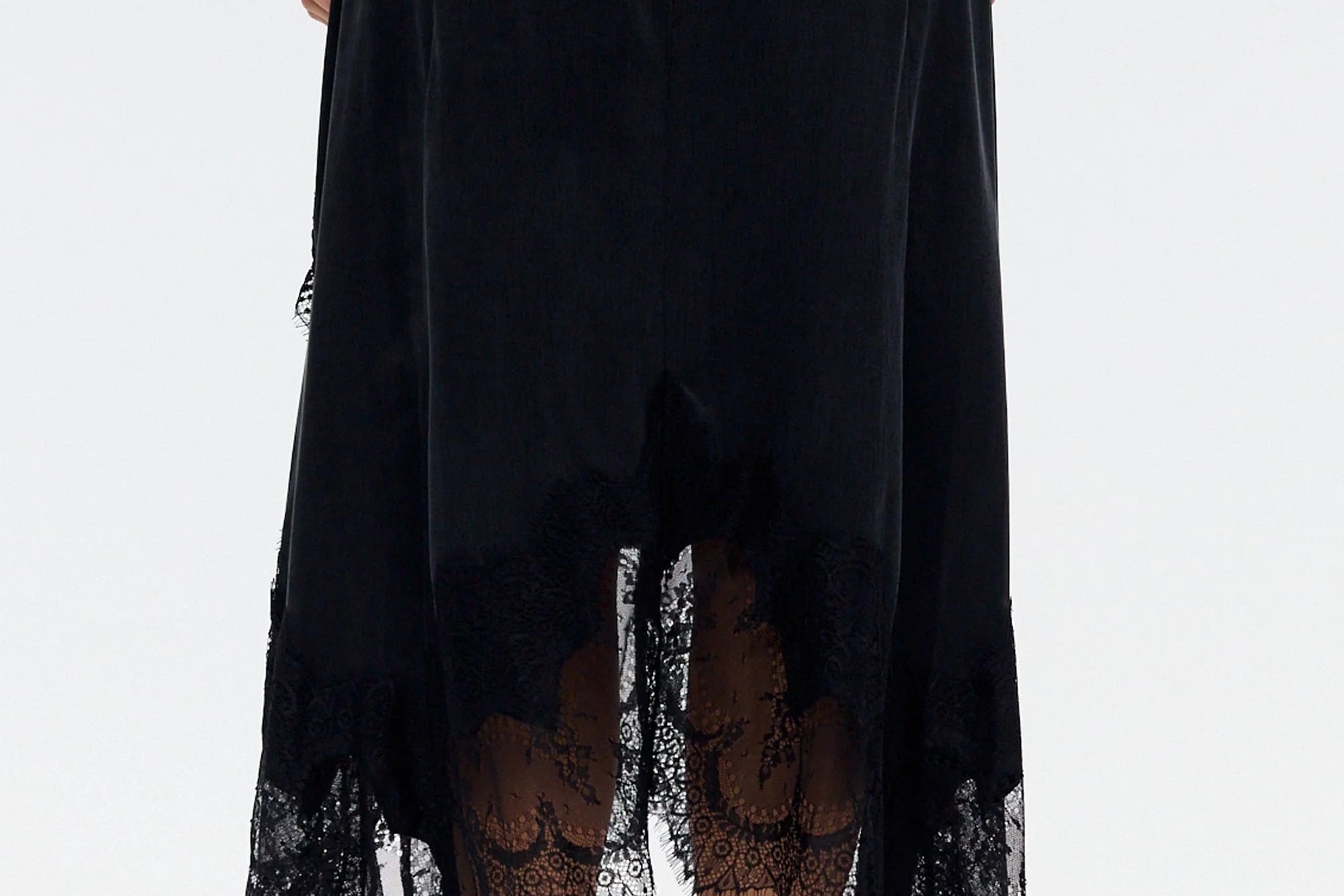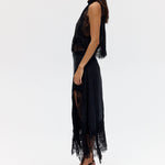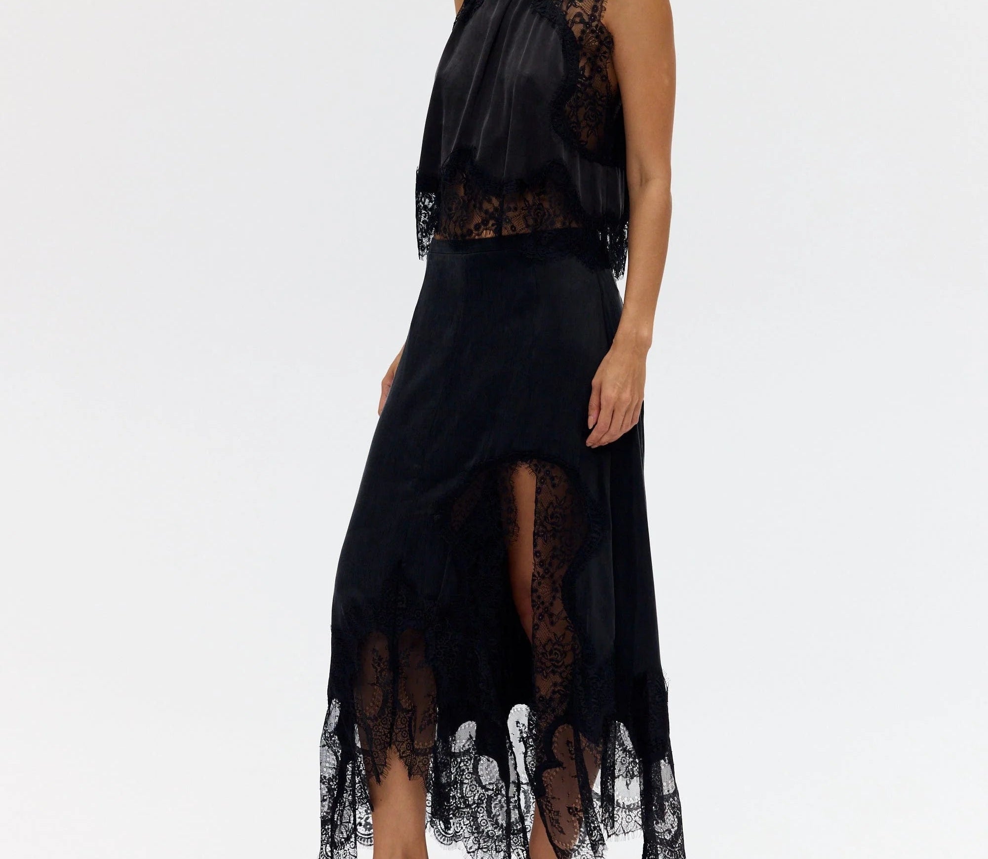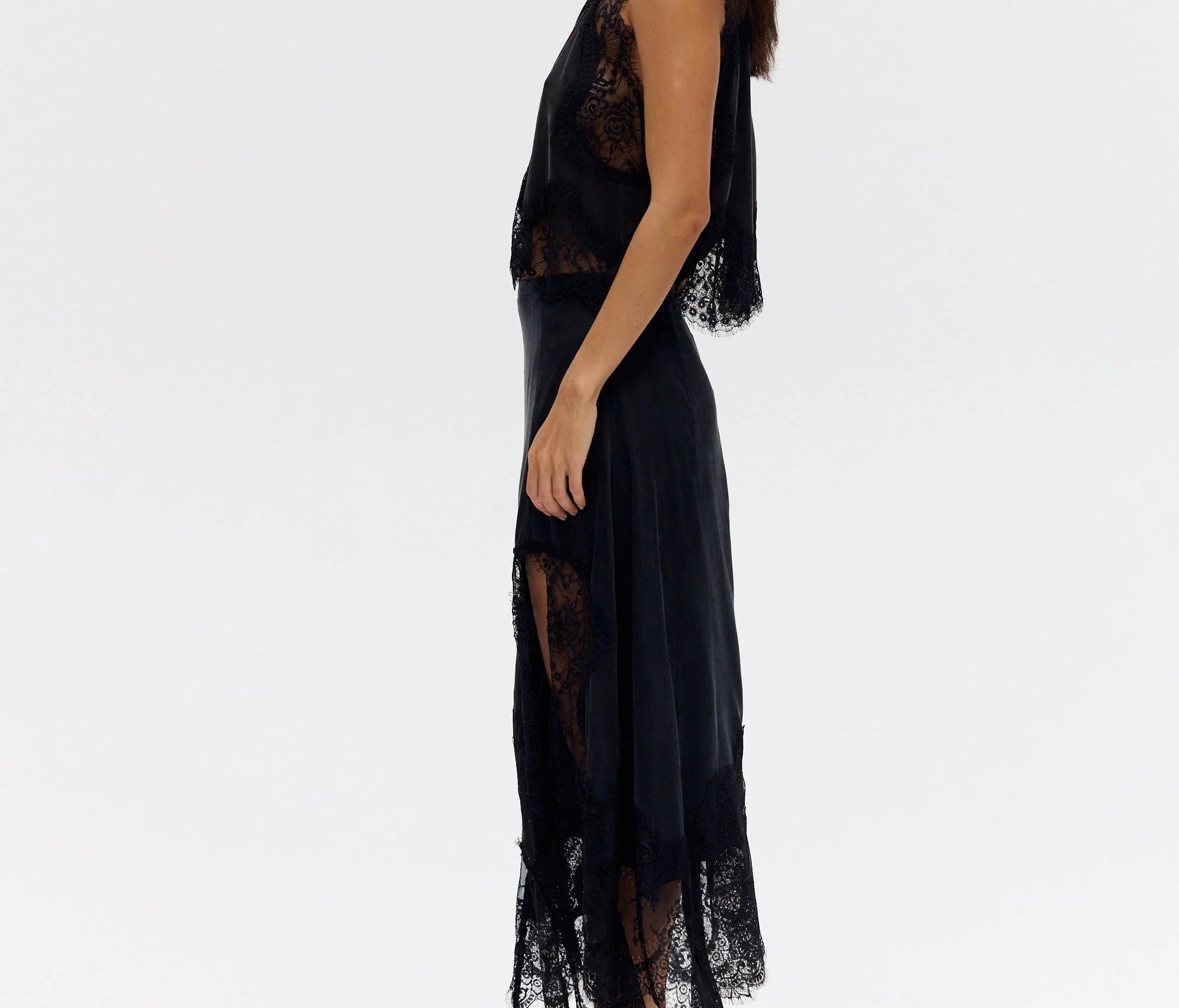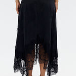 Introducing Third Form's Visions Lace Hankerchief Skirt in Ebony, a midi-length lace skirt in the color black. Designed in a midi-length silhouette, the Visions Lace Hankerchief Skirt cascades into a voluminous handkerchief hem, framed by intricate lace detailing. The sheer lace inserts lend an air of refinement, while the relaxed fit ensures graceful drape and wearability. Style it with the Visions Lace Top for a seamlessly coordinated ensemble.