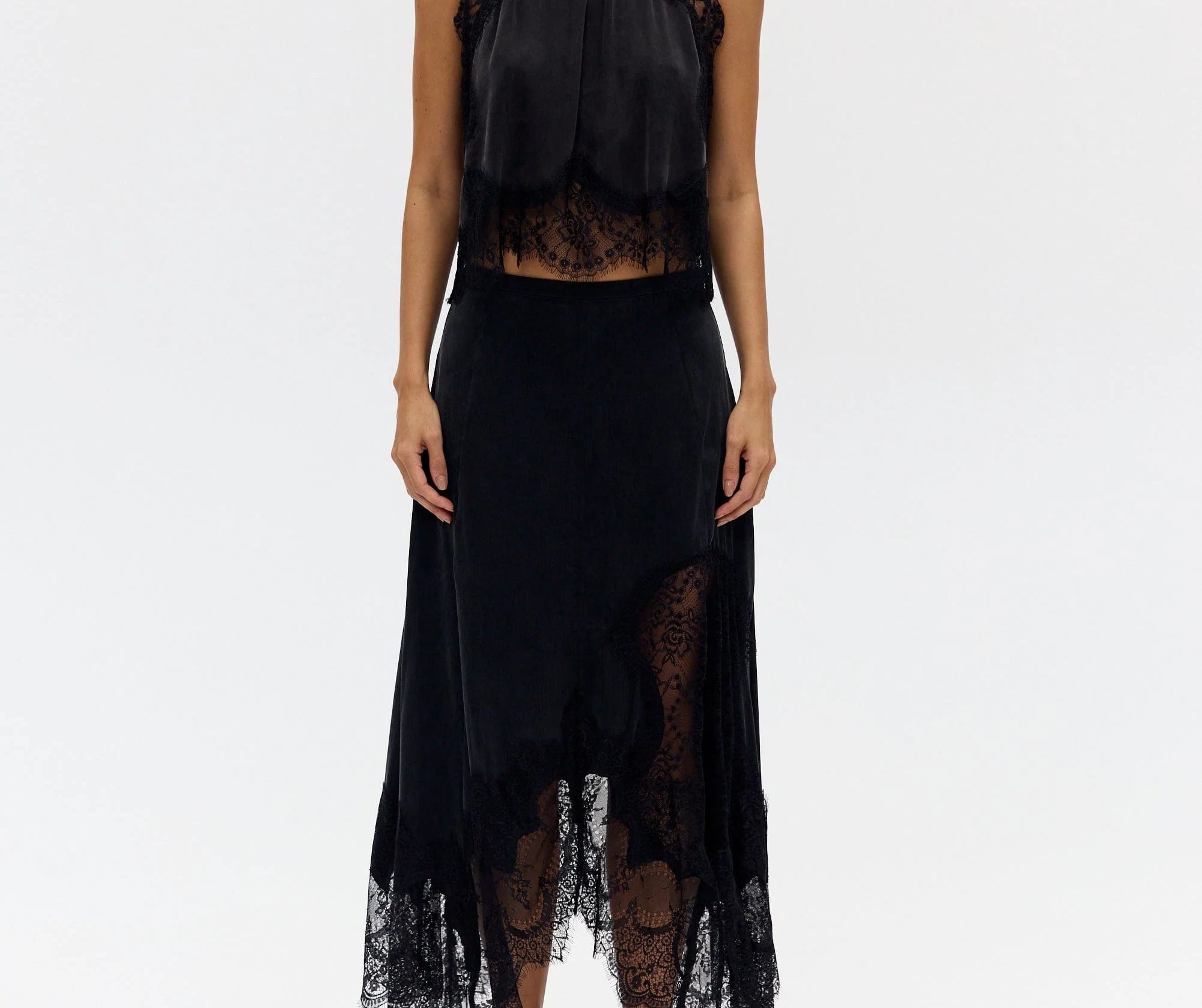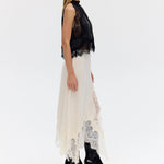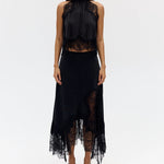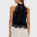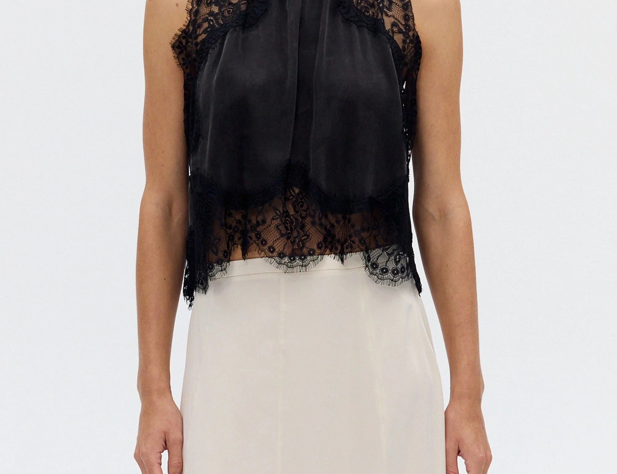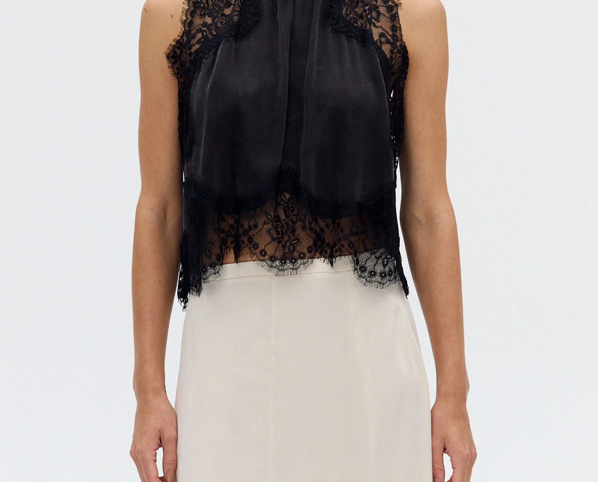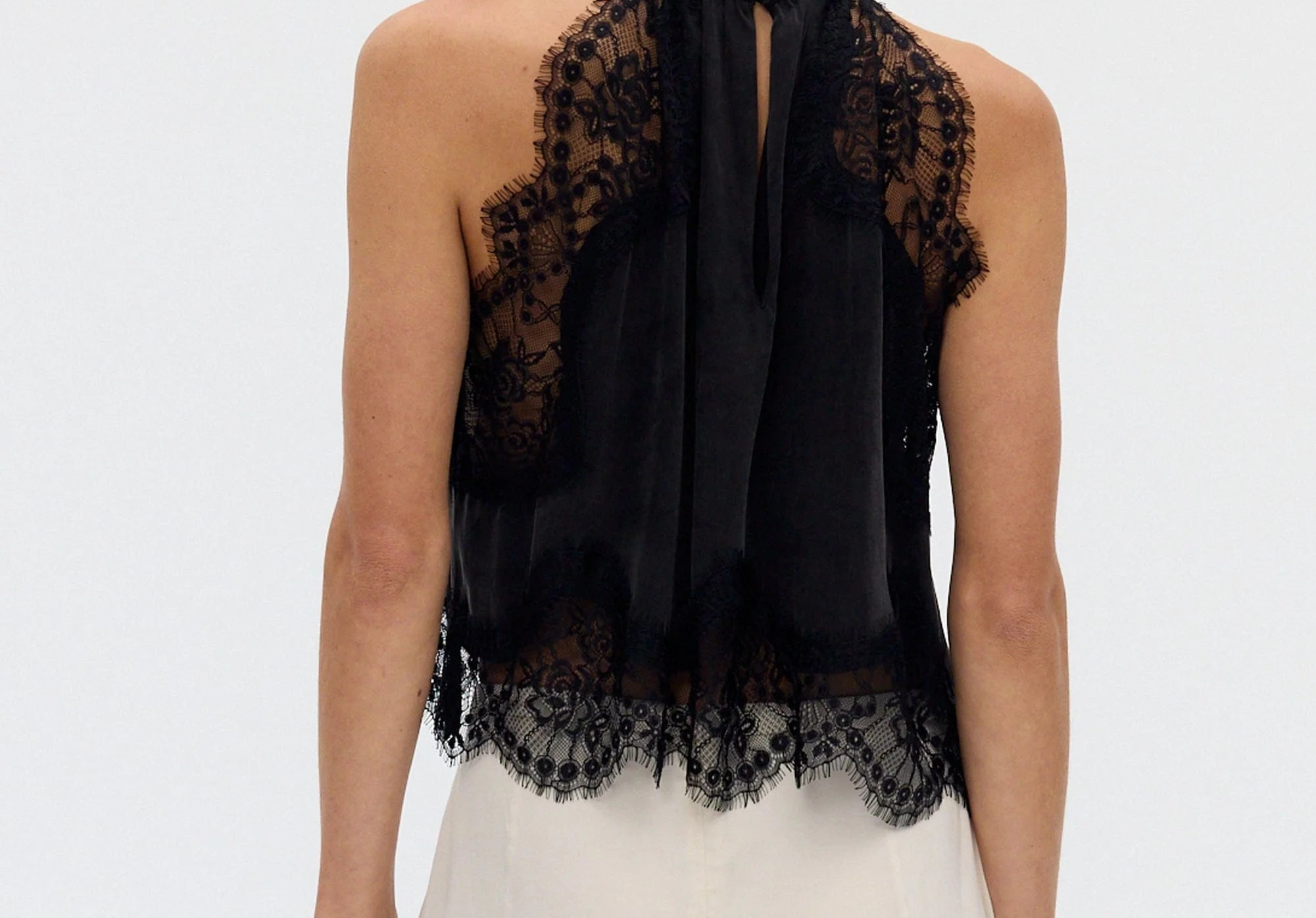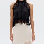 Introducing Third Form's Visions Lace Top in Ebony, a sleeveless high-neck top silhouette in a black hue. Designed with a high neckline, featuring a softly gathered bodice creating a fluid drape, and intricate lace paneling tracing the shoulders and hem. The Vision Lace Top's sleeveless silhouette flows effortlessly, making it the perfect pairing for both tailored and relaxed separates.
