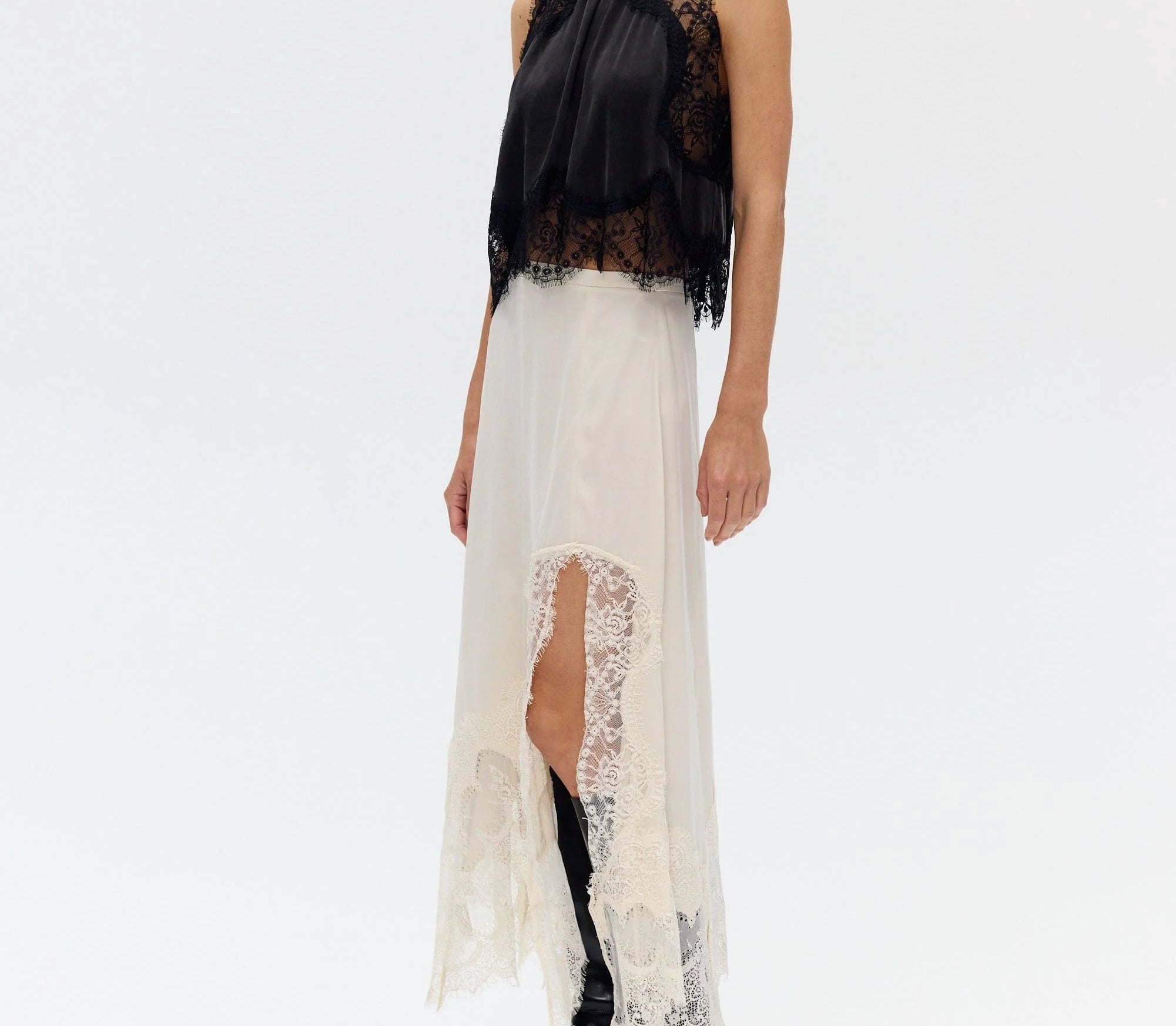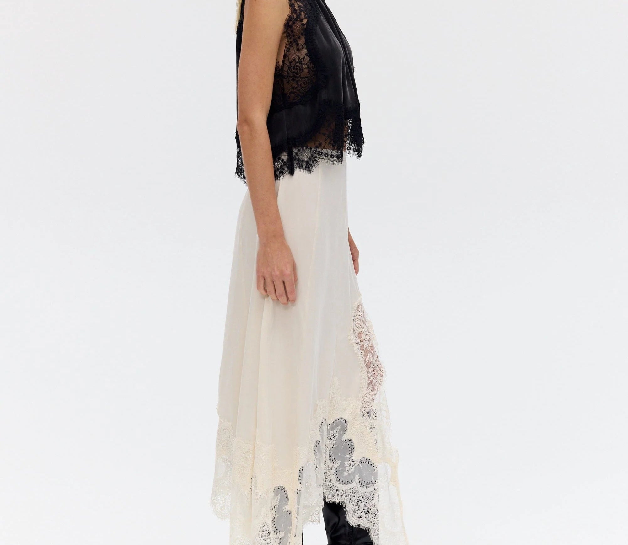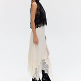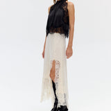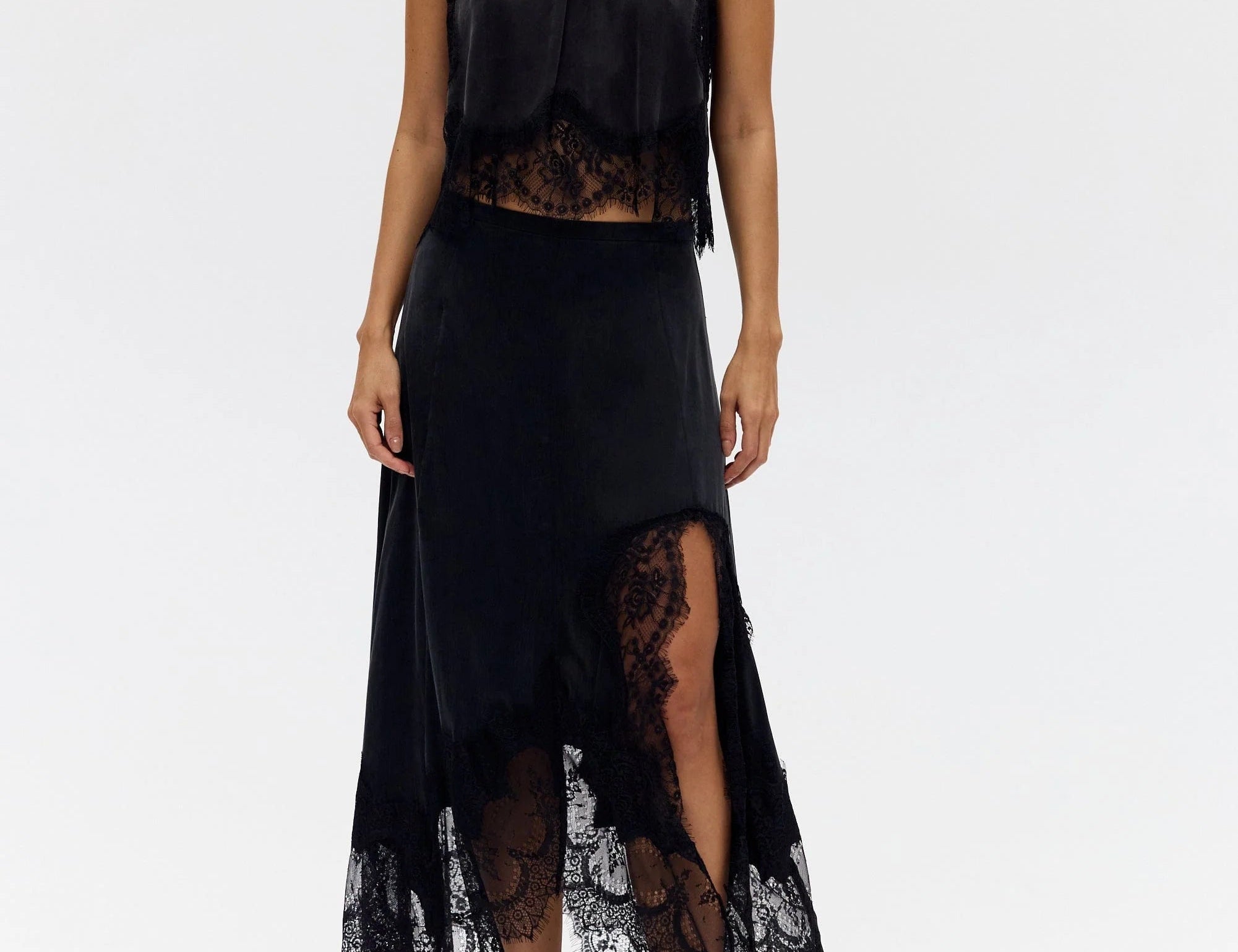 Introducing Third Form's Visions Lace Top in Ebony, a sleeveless high-neck top silhouette in a black hue. Designed with a high neckline, featuring a softly gathered bodice creating a fluid drape, and intricate lace paneling tracing the shoulders and hem. The Vision Lace Top's sleeveless silhouette flows effortlessly, making it the perfect pairing for both tailored and relaxed separates.