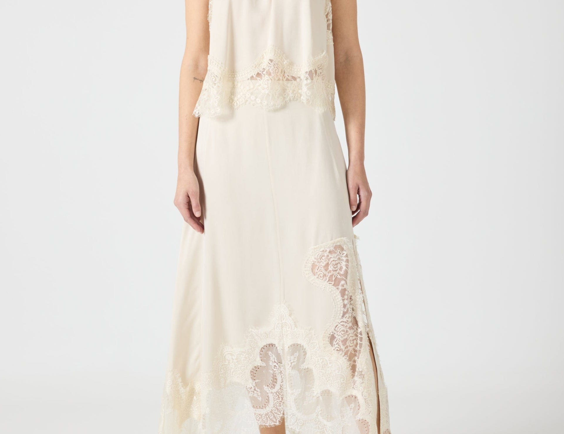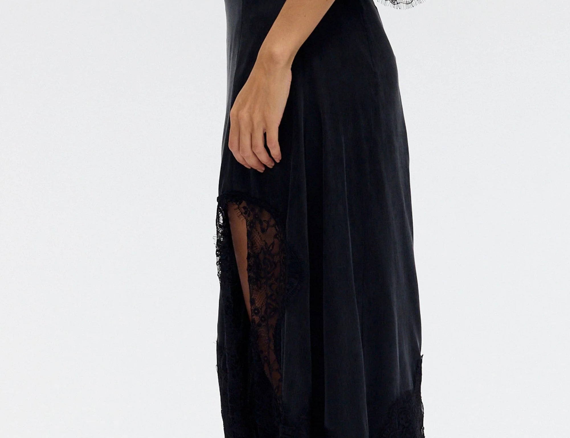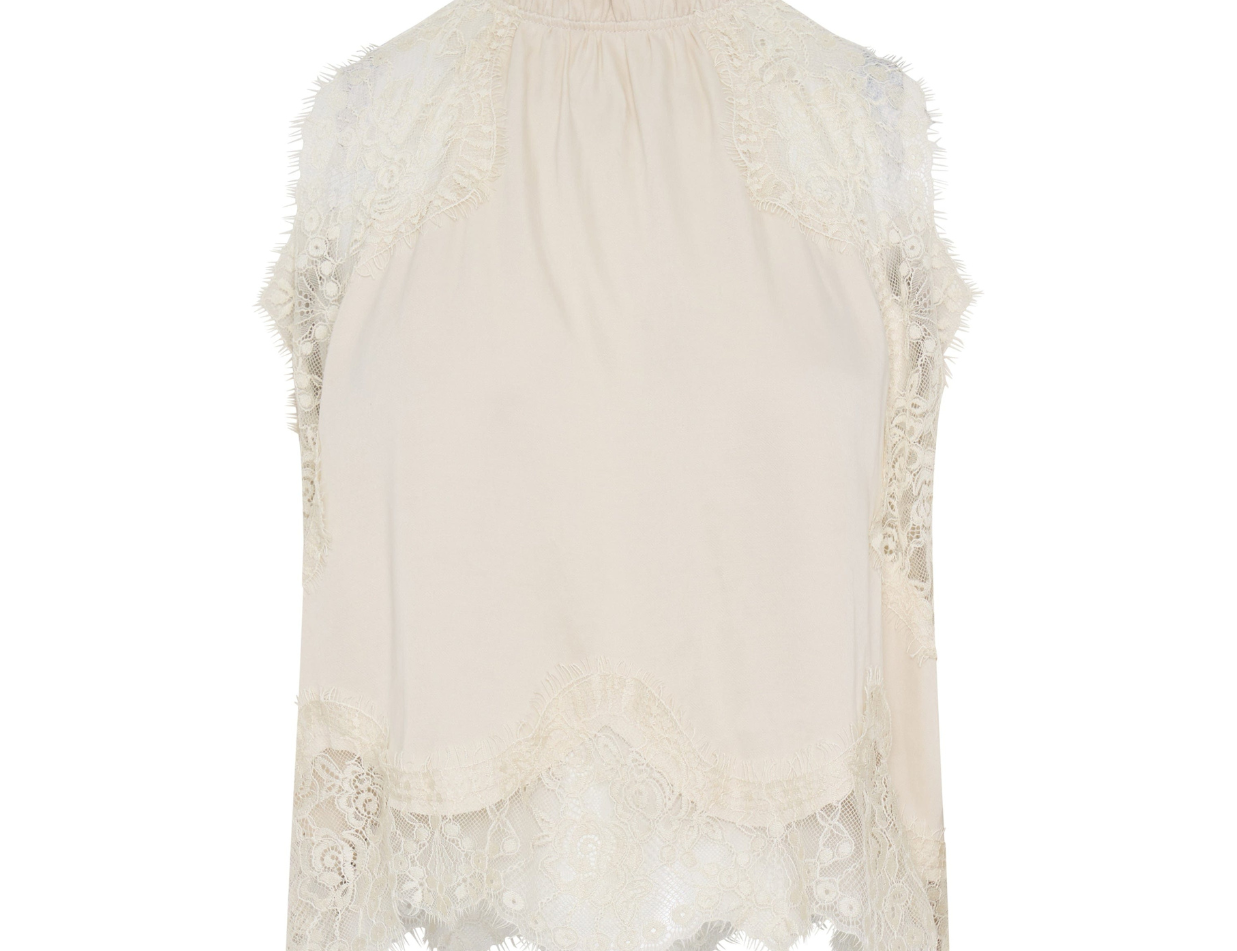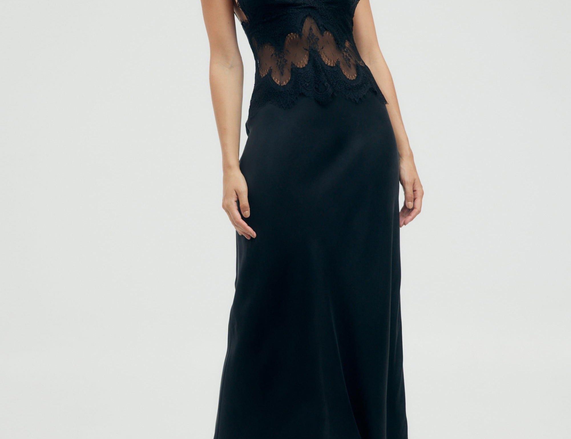 Introducing Third Form's Visions Lace Top in Ebony, a sleeveless high-neck top silhouette in a black hue. Designed with a high neckline, featuring a softly gathered bodice creating a fluid drape, and intricate lace paneling tracing the shoulders and hem. The Vision Lace Top's sleeveless silhouette flows effortlessly, making it the perfect pairing for both tailored and relaxed separates.