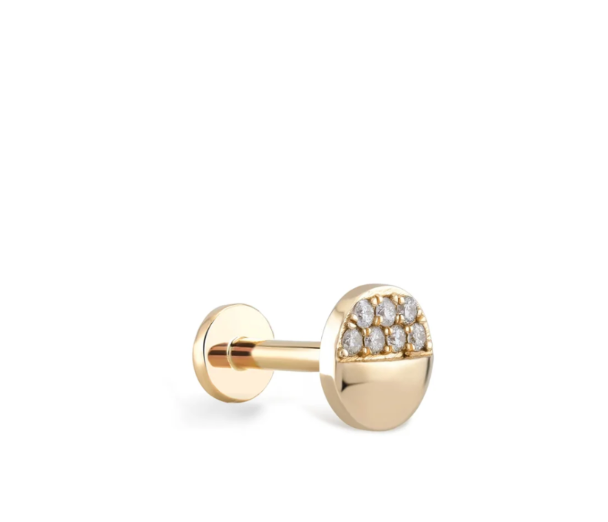 Introducing Tilla's Eva Earring, a round stud earring. The Eva earring is designed in solid 14k yellow gold, half made with white crystal setting stones for a minimalist touch. The earring features a post closure and is a perfect addition to any ear stack.