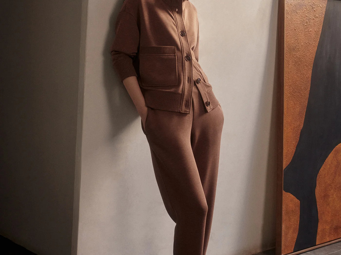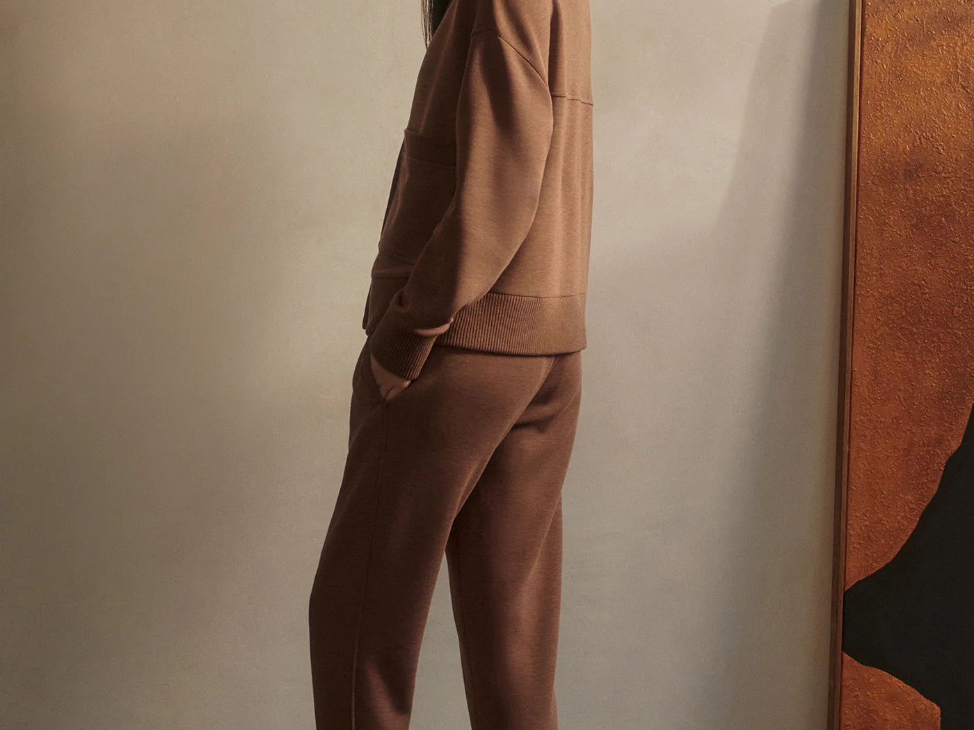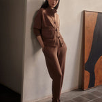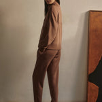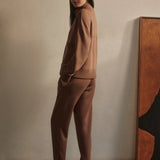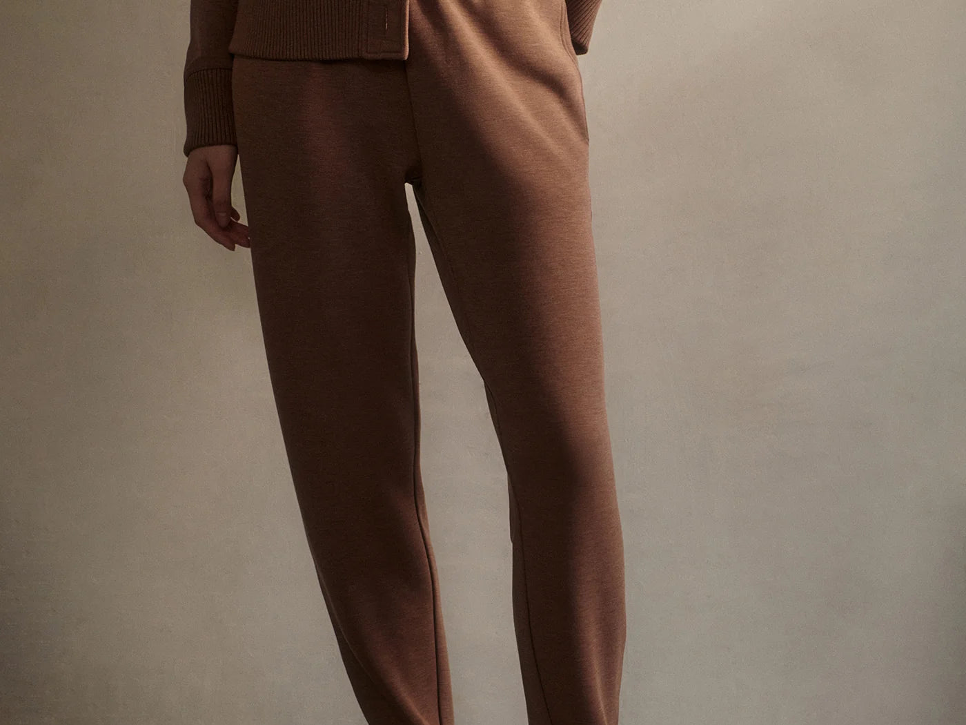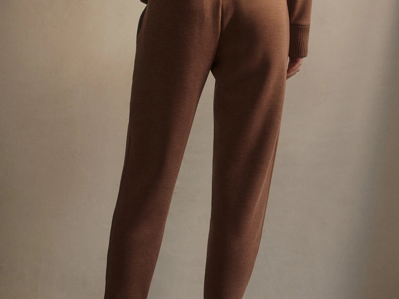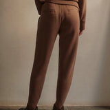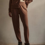 Introducing Varley's Slim Zip Hem Pant 29.5 in Golden Brown Marle, a slim-fit pant silhouette in the color golden brown marle. Designed to flatter the figure and hemmed and cuffed at the ankle. The Slim Pant features an elasticated waistband and internal drawcord to provide a personalized fit, while the side and back pockets offer practicality. Perfect for pairing with our DoubleSoft® sweaters.