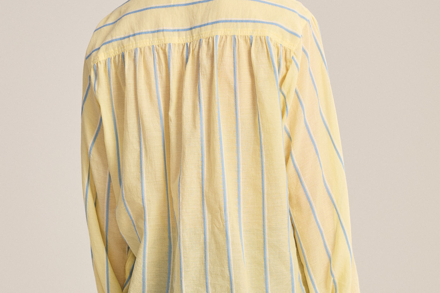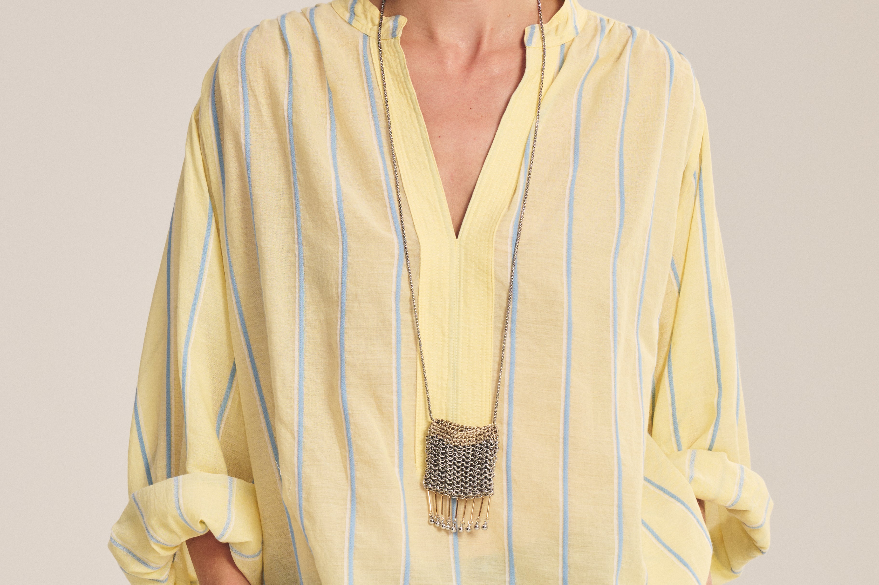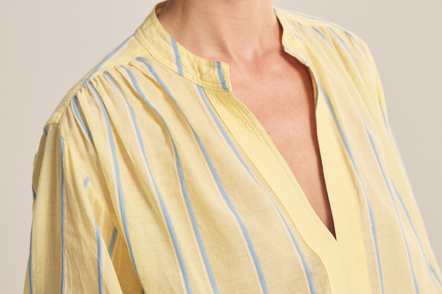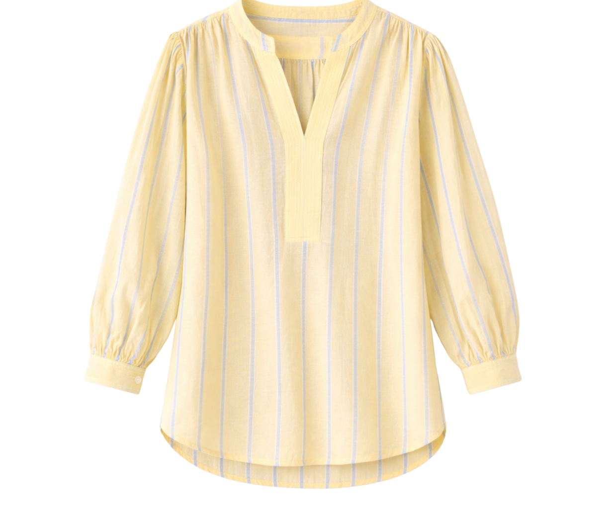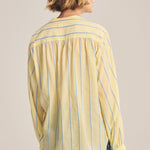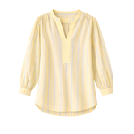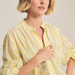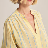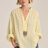 Crafted from yarn-dyed stripe cotton, this top offers a relaxed fit with a slightly sheer, airy feel. Designed with a V-neckline, pop-over style, single-button stitched cuffs, and a softly scooped hem, it blends effortless ease with subtle detail.