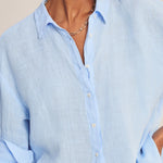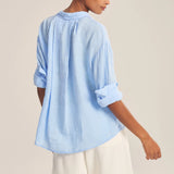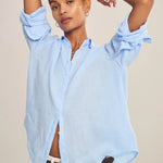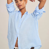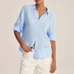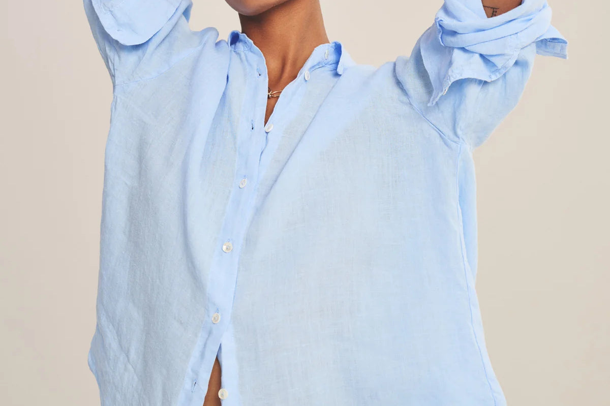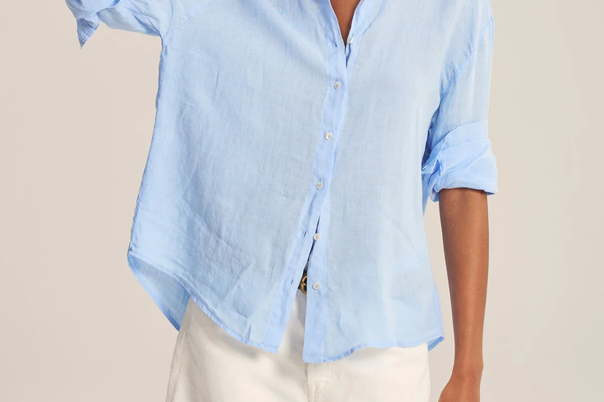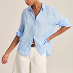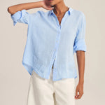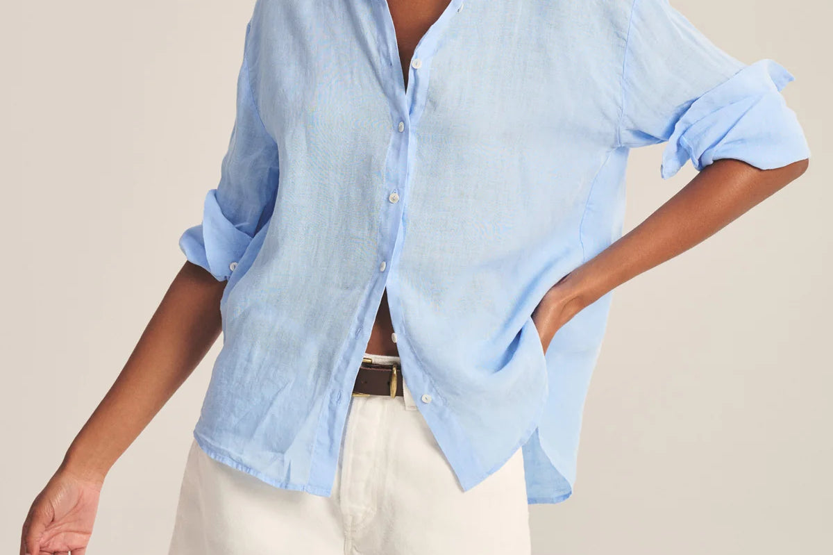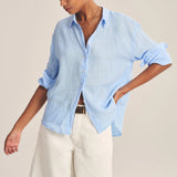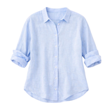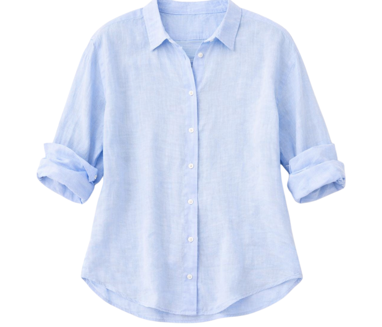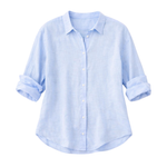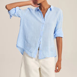 Crafted from breathable woven linen, this button-up top offers a relaxed fit with an effortlessly polished feel that transitions seamlessly from casual days to elevated layering looks. Designed with a classic collar, single-button cuffs, and pleat detailing down the back, it’s finished with a softly scooped hemline for added ease and movement.