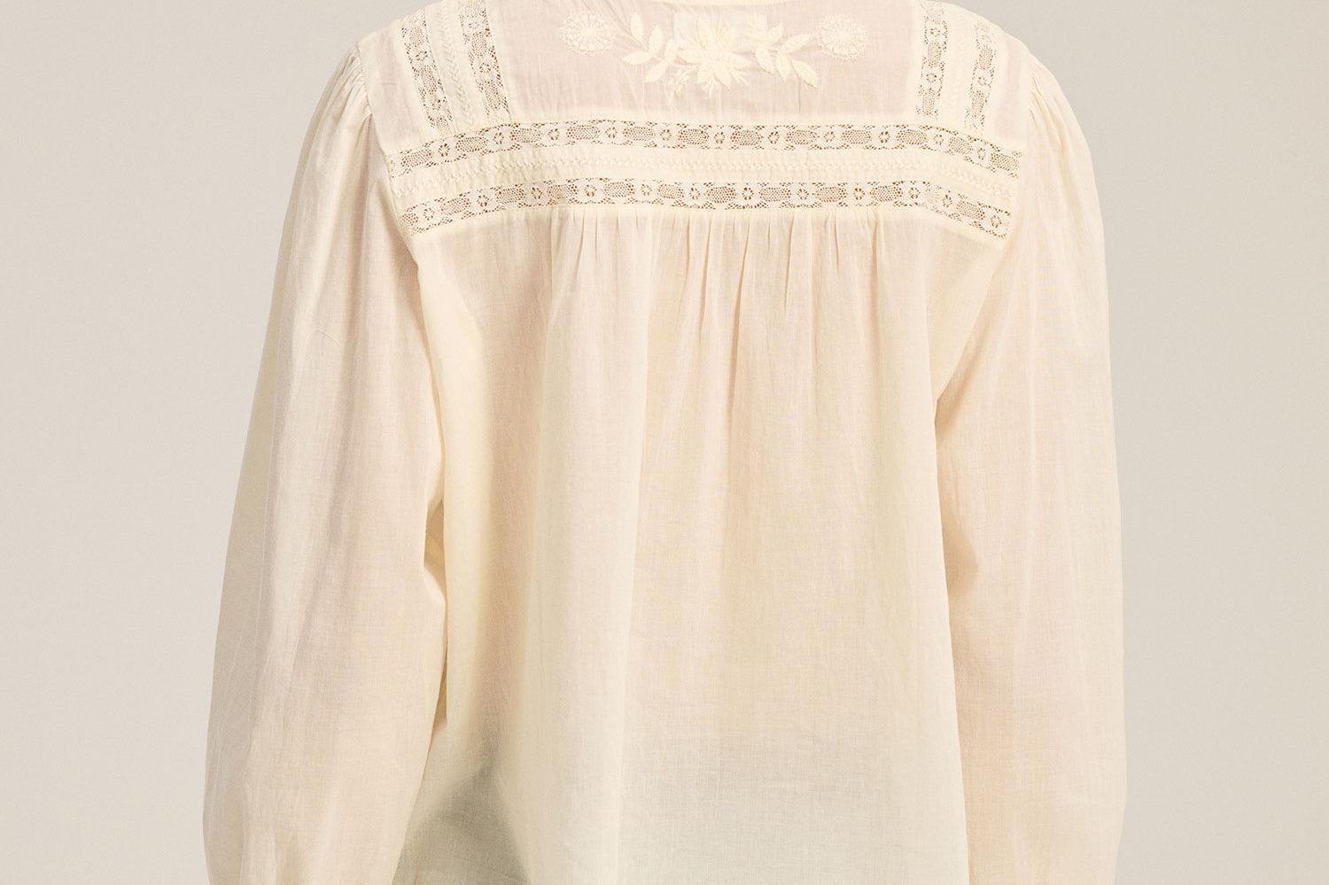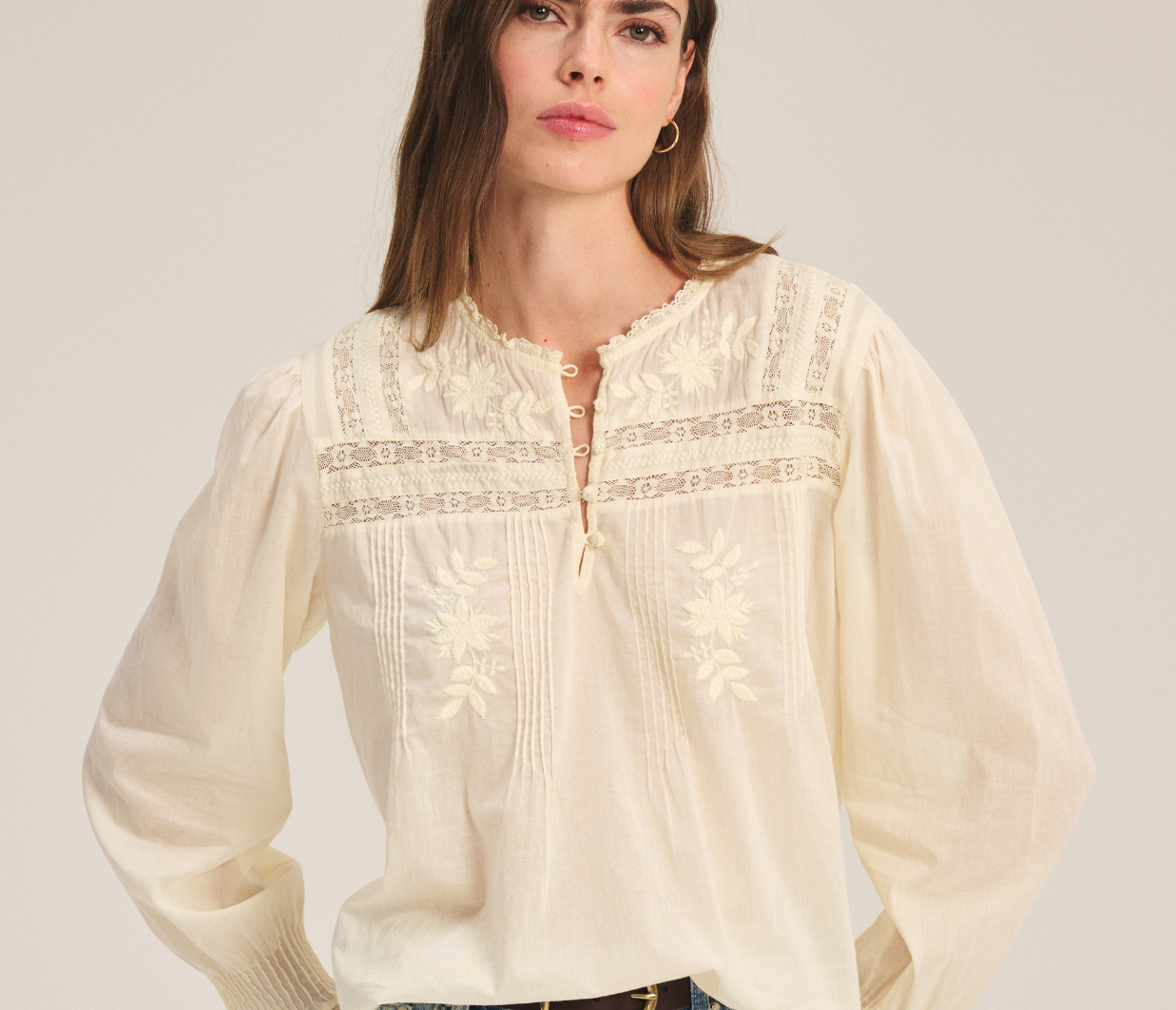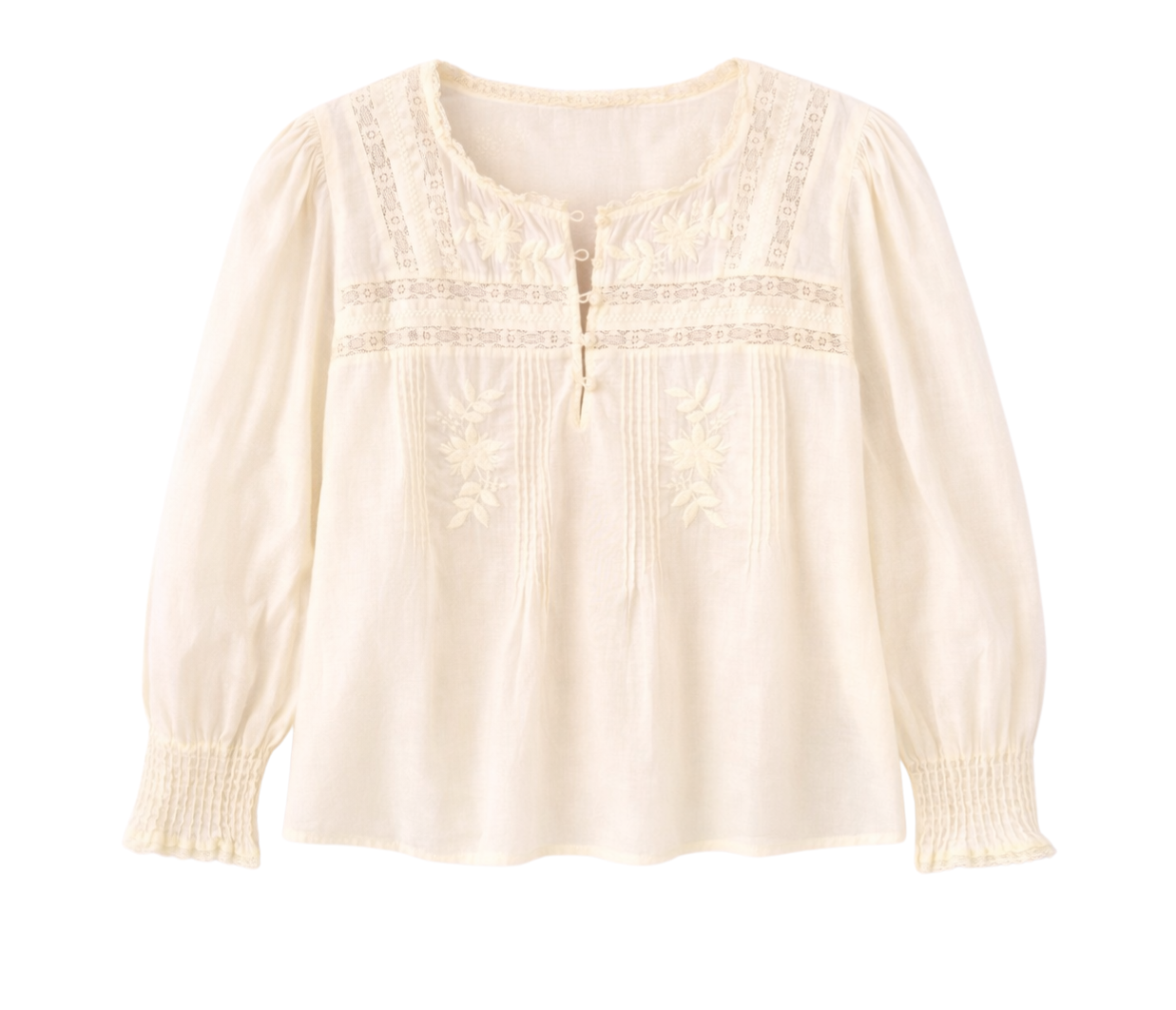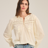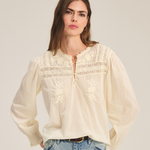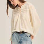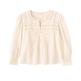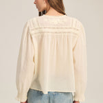 Delicate and feminine, this top is crafted from soft cotton lace with a flattering scooped hemline. Featuring a 3/4 knotted button placket, lace detailing across the shoulders, chest, and back, and ruffle lace at the neck and pleated cuffs, it exudes romantic elegance.