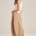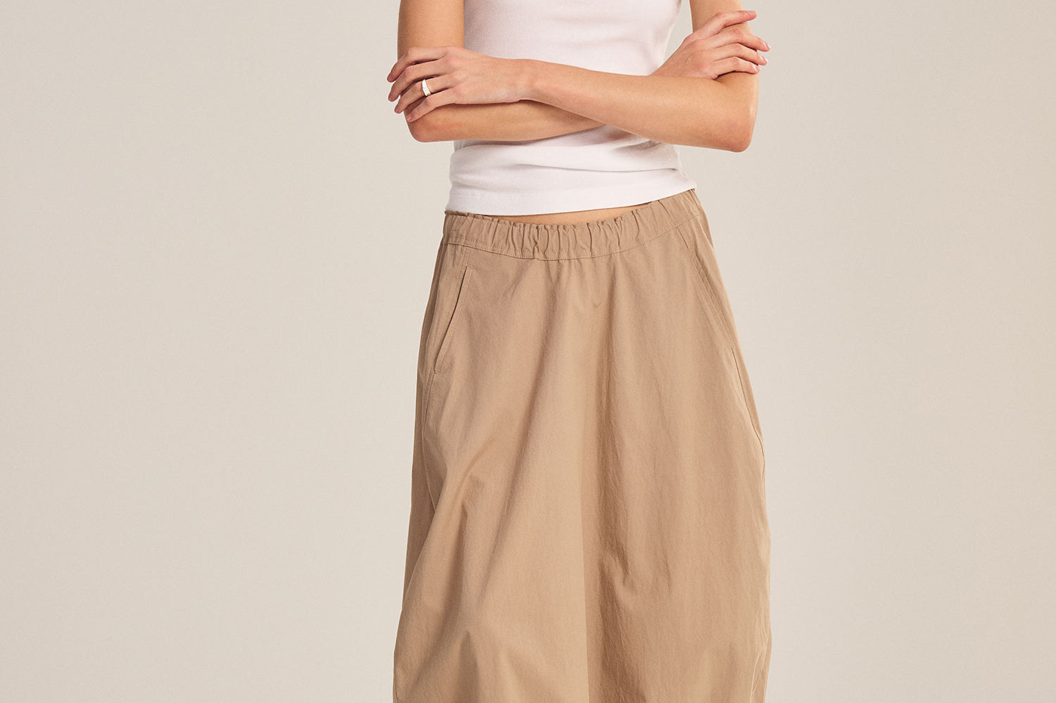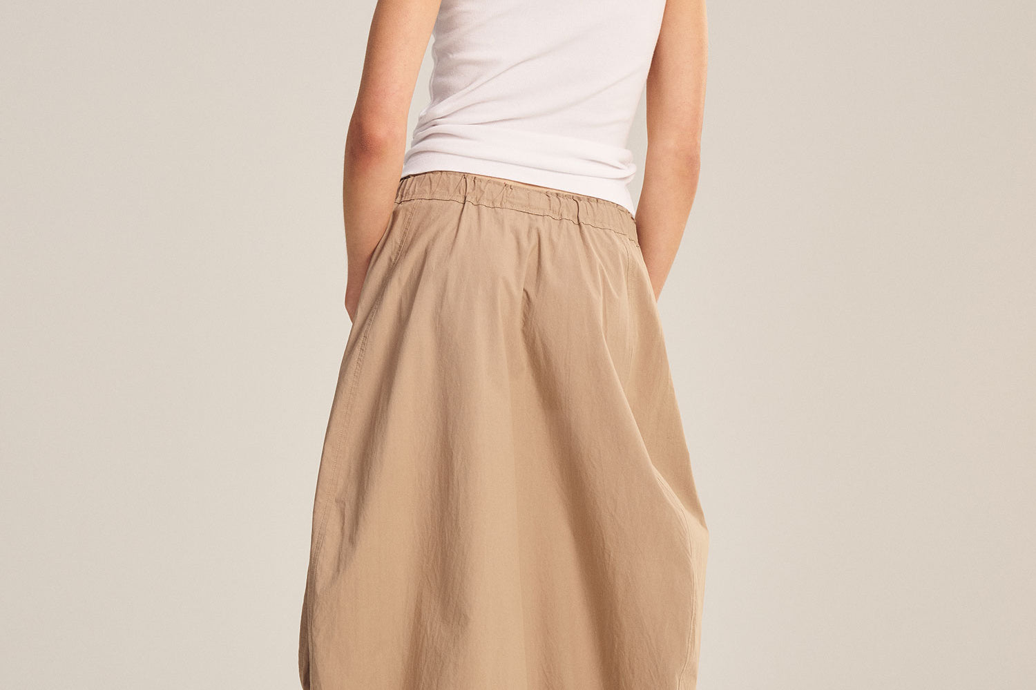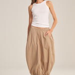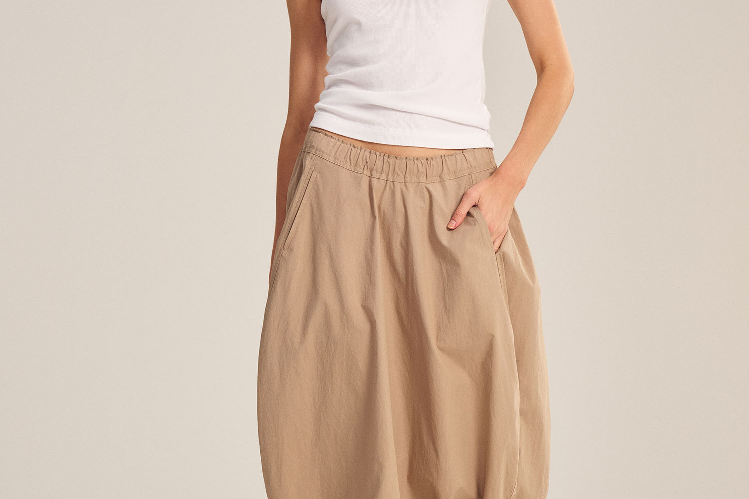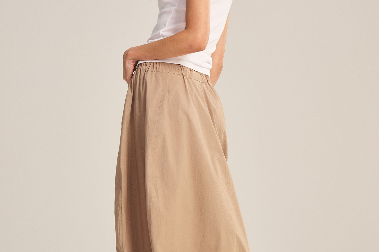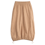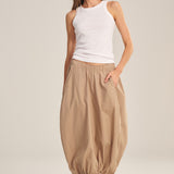 Crafted from crisp cotton poplin, this skirt combines sporty ease with polished detail. Featuring an elastic waist, cinched corded hem, front welt pockets, and a subtle handkerchief hemline, it allows you to move freely while maintaining a flattering silhouette.
