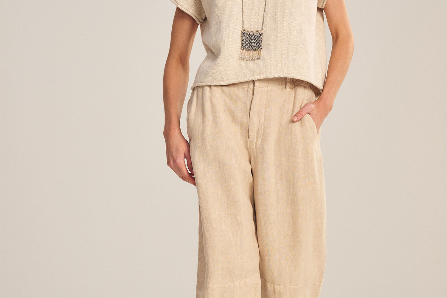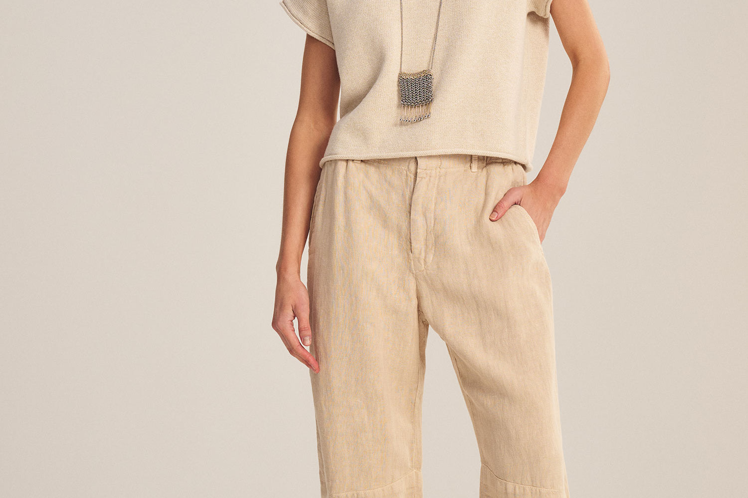 These pants are crafted from heavier-weight linen, offering added structure. Darting at the knee creates a curved leg silhouette, while the hook-and-bar with zipper closure and belt loops provide a tailored fit. Side seam pockets add practicality to this versatile piece.