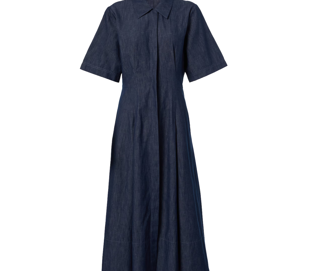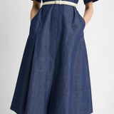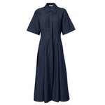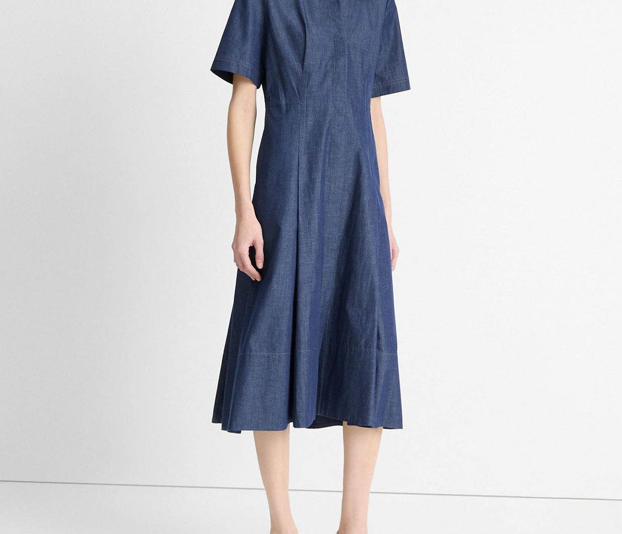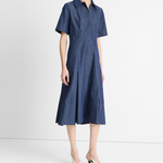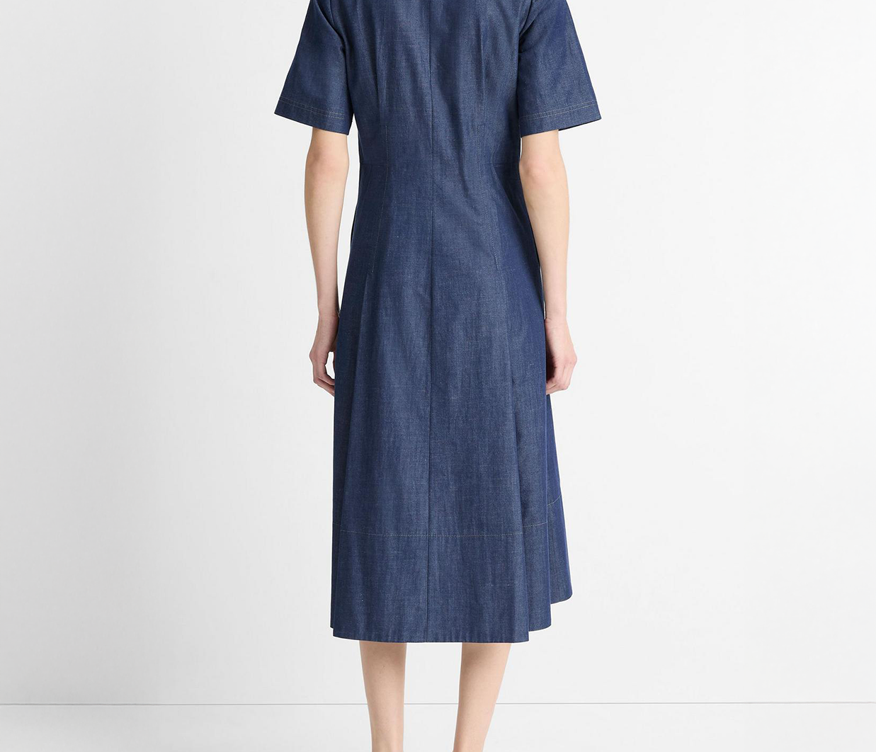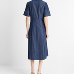 Introducing the Vince Denim Shirt Dress in Deep Indigo a wardrobe staple for every season. Designed with a defined waist, it gracefully flares into an A-line skirt, accentuated by subtle inverted pleat detailing for added movement and structure.