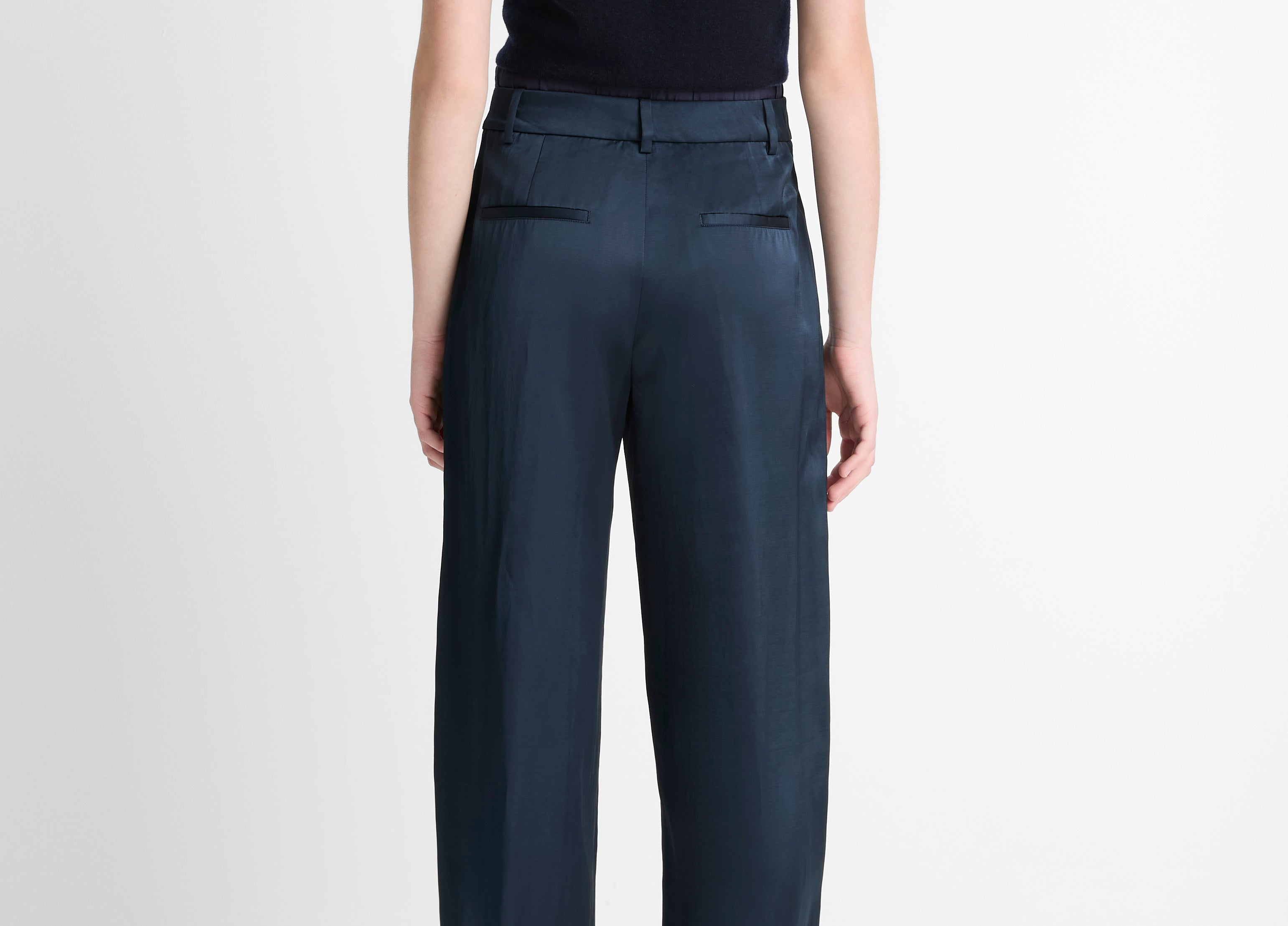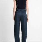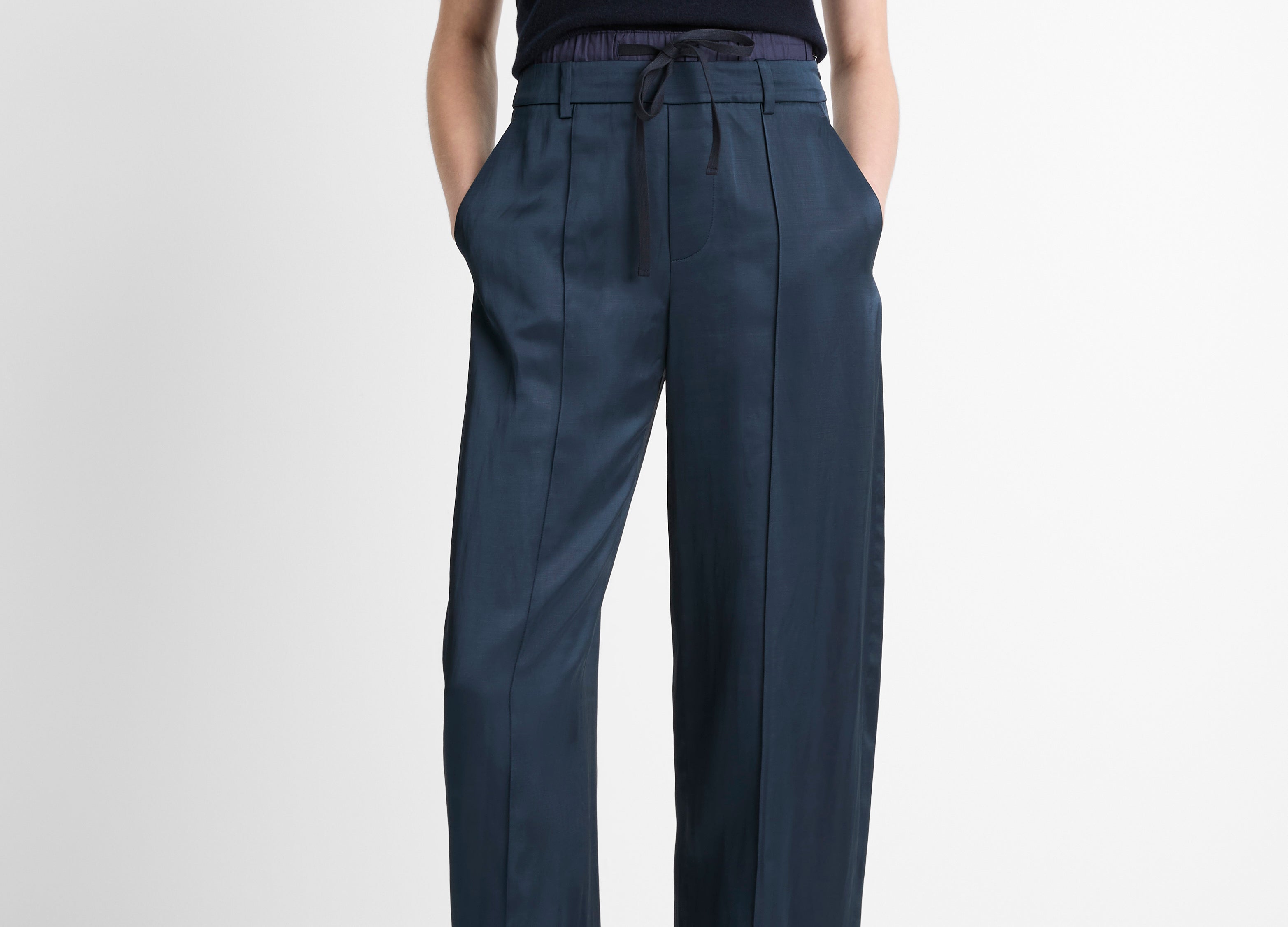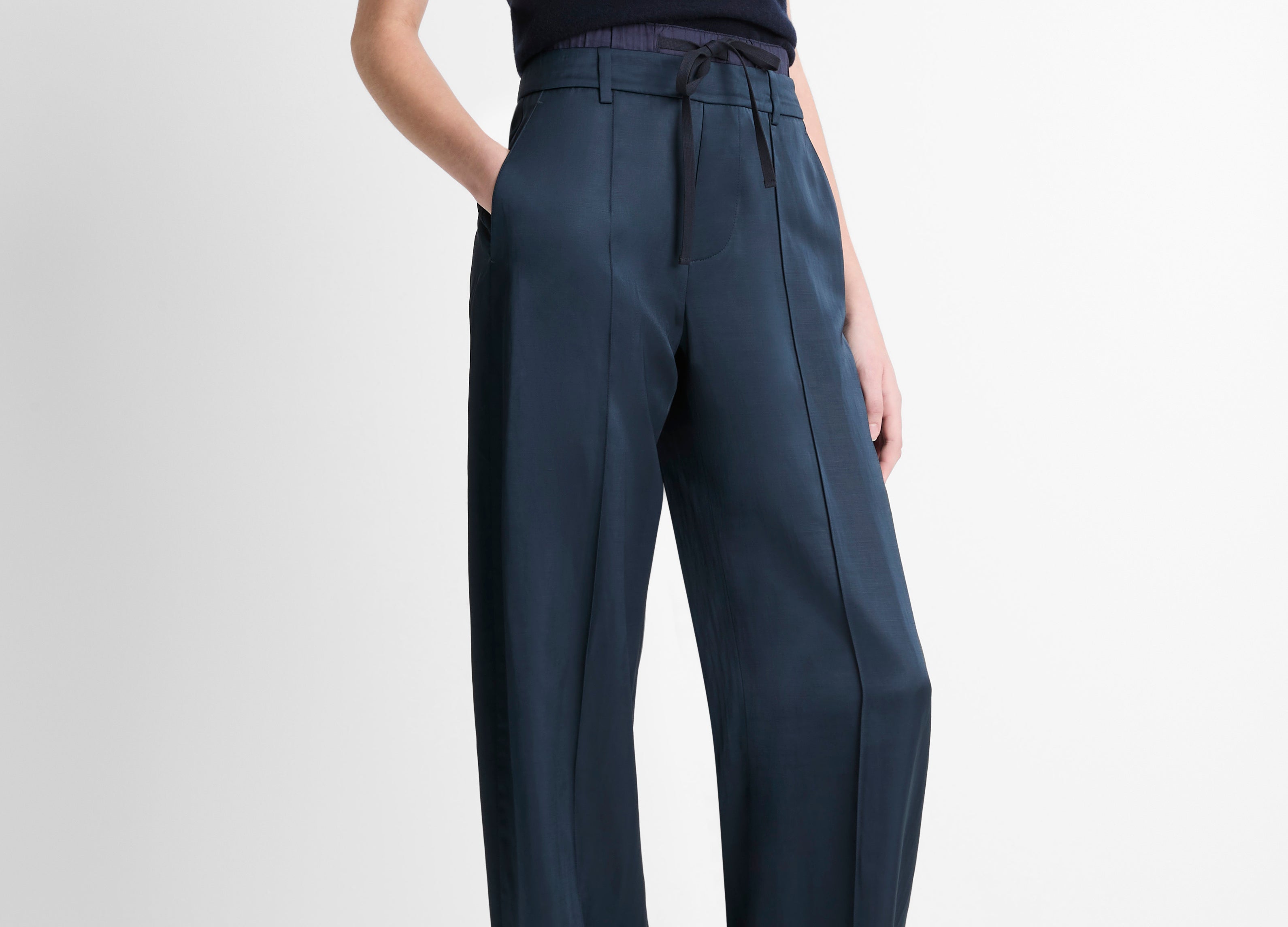 Introducing the Mid Rise Double-Waistband Drawstring Pant a modern twist on the classic trouser. This wide-leg pant is fashioned with traditional tailored details and accented with a drawstring double waistband to create the appearance of boxer briefs peeking over the top.