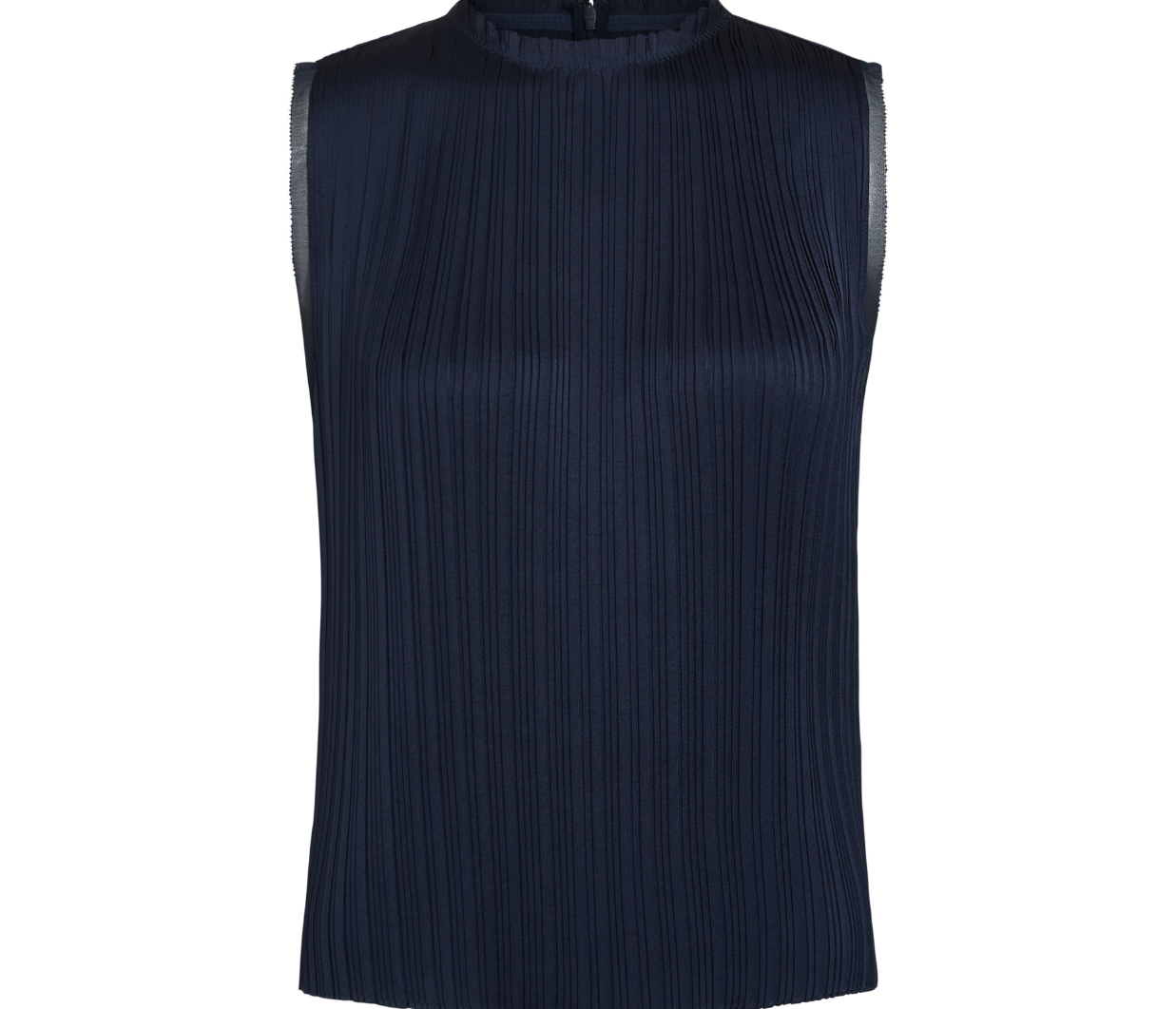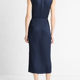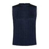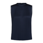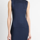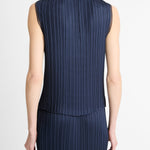 Introducing the Pleated Satin Crew Neck Shell in Coastal Blue, crafted from luxurious Japanese satin, this top features variegating pleats that create a mesmerizing, dimensional effect. Delicate, tonal sheer chiffon trim at the armholes adds a subtle touch of refinement. The perfect piece for dressing up any occasion, this shell pairs beautifully with the matching Pleated Satin Straight Pull-On Skirt for a coordinated, head-turning look.
