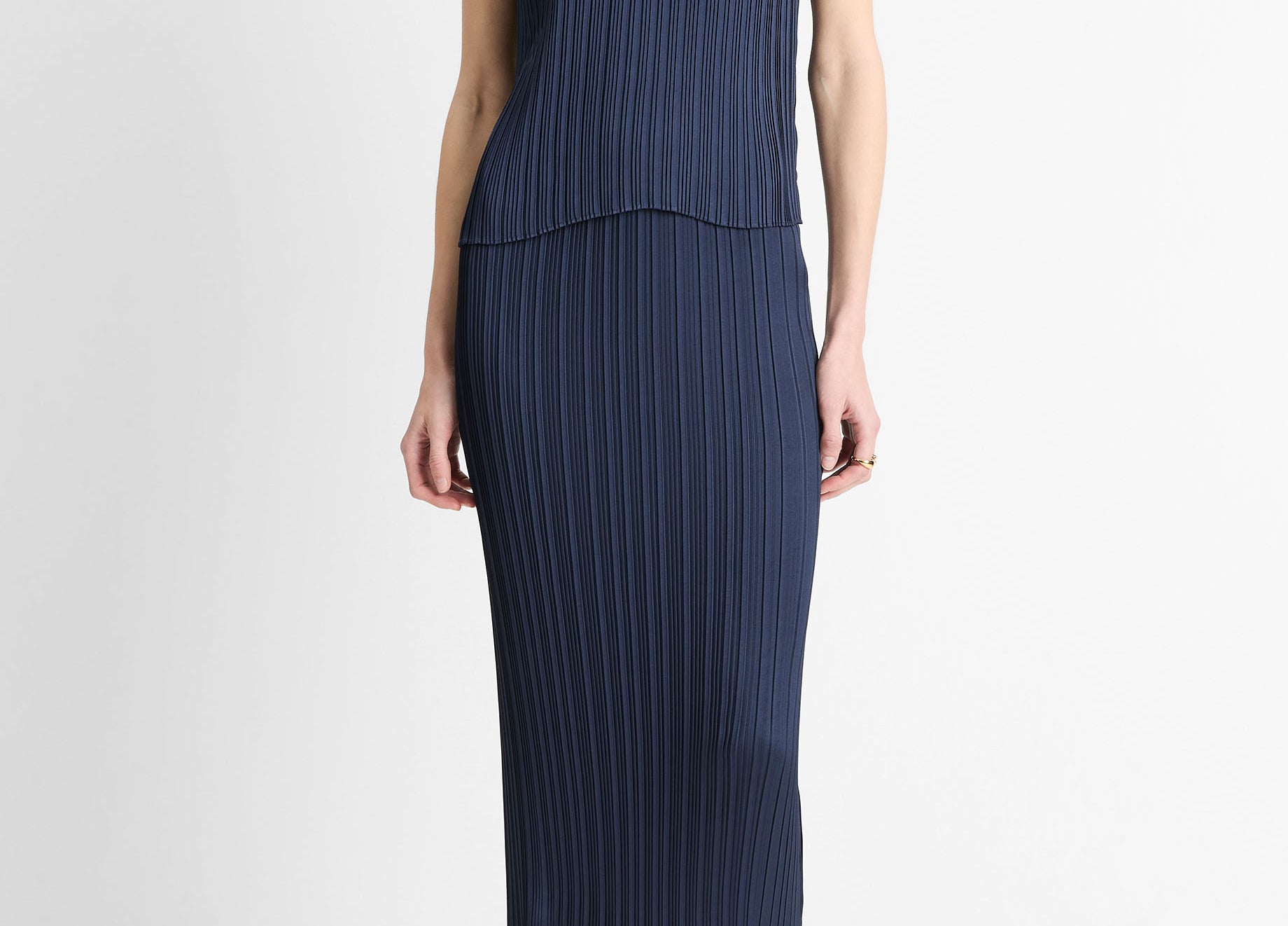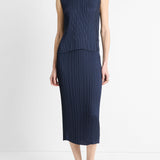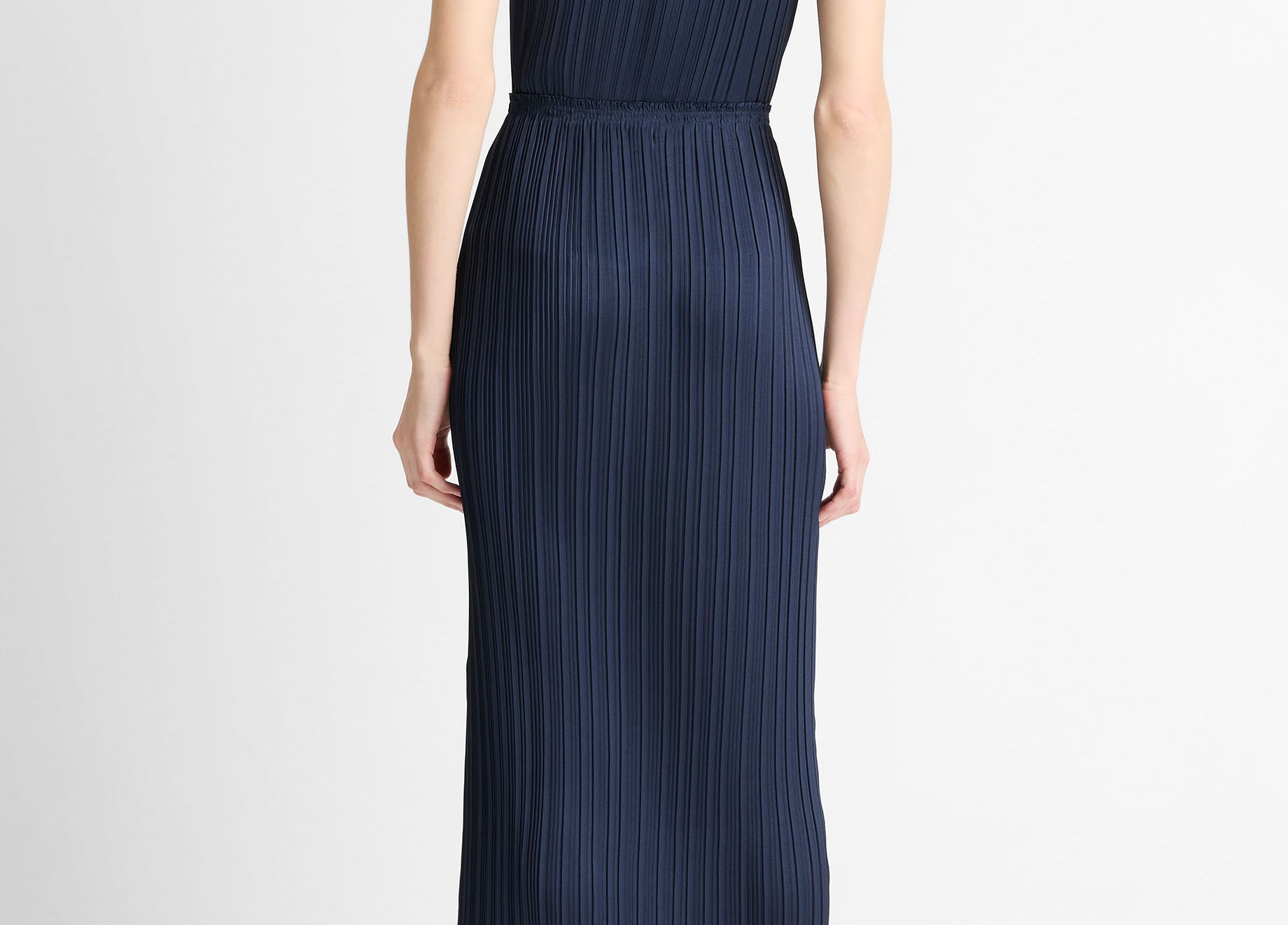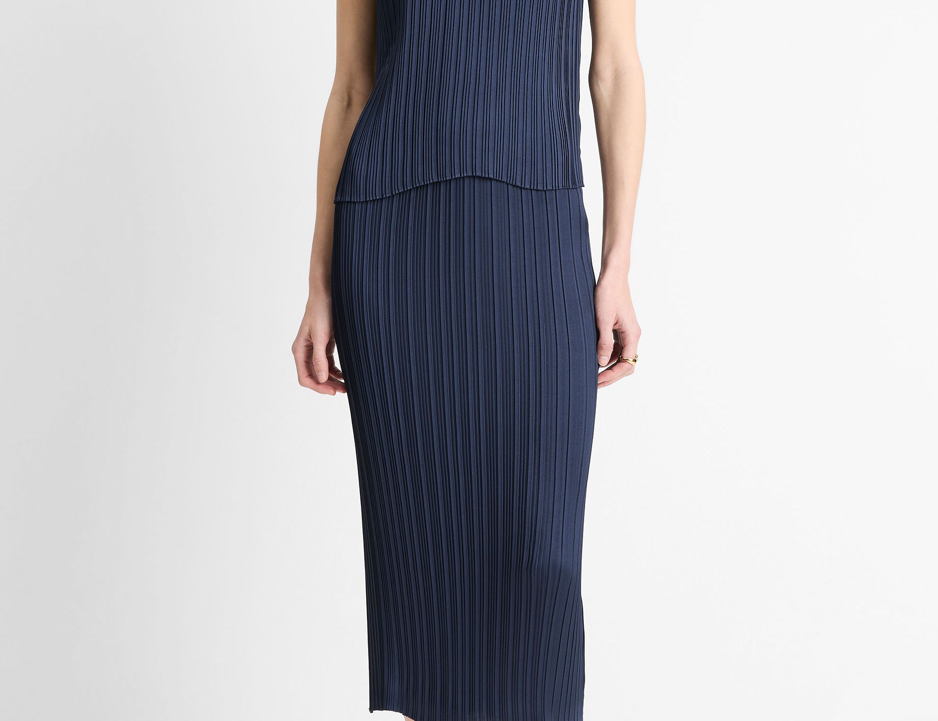 Introducing the Pleated Straight Pull-On Skirt in Coastal Blue, made from luxurious Japanese satin, the skirt features variegated pleats that create a captivating, dimensional effect. Designed with a hidden elastic waist, it offers a smooth, easy fit that slips on with ease.