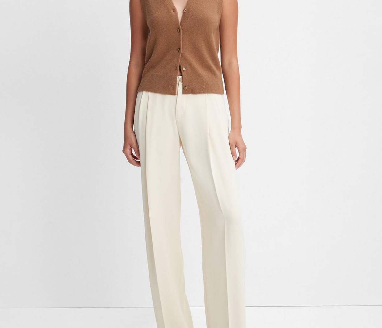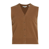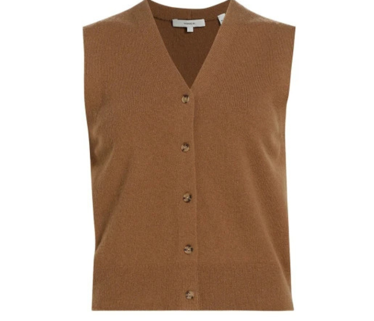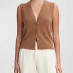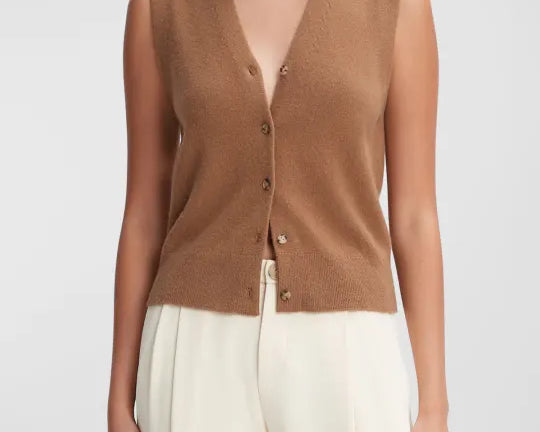 Introducing Vince's Shrunken Button Vest in Camel, crafted from a luxuriously soft blend of wool and cashmere, this lightweight Vince sweater vest delivers timeless appeal. Featuring a deep V neckline and button placket, it’s the perfect layer for transitional weather, whether styled solo or layered over crisp shirting.