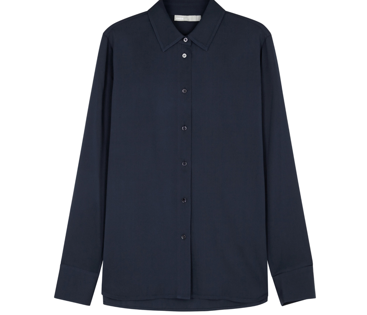 Introducing Vince's Slim Fit Classic Shirt in Twilight modern take on a timeless essential, this silk shirt is cut on the bias to gently contour the body for a flattering, feminine drape. Designed with a classic spread collar and front button closure, it’s finished with subtly flared cuffs that lend a contemporary edge.