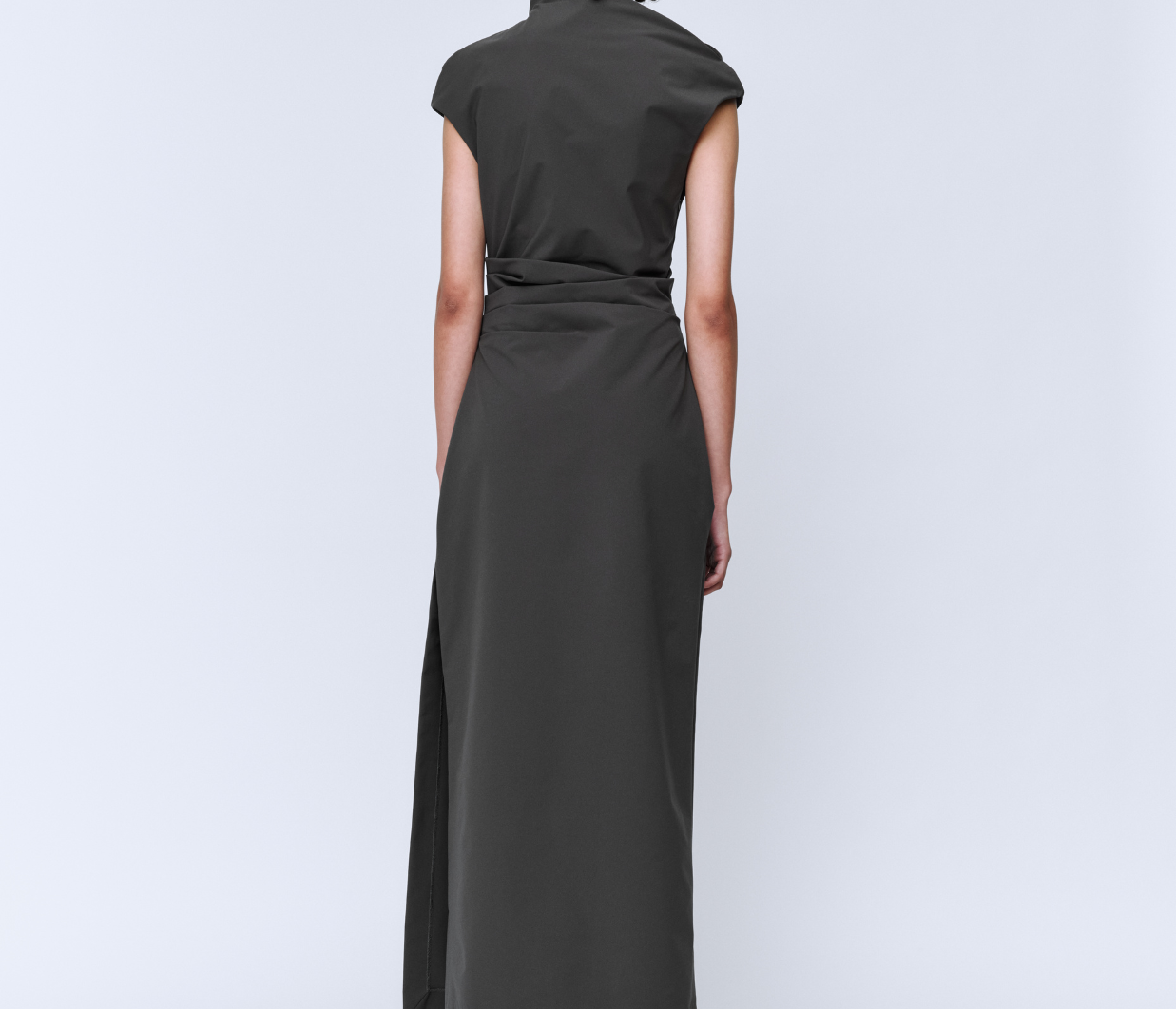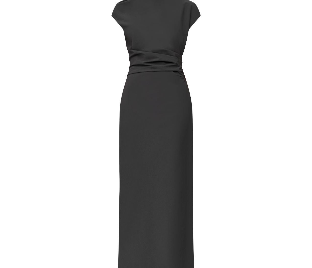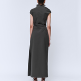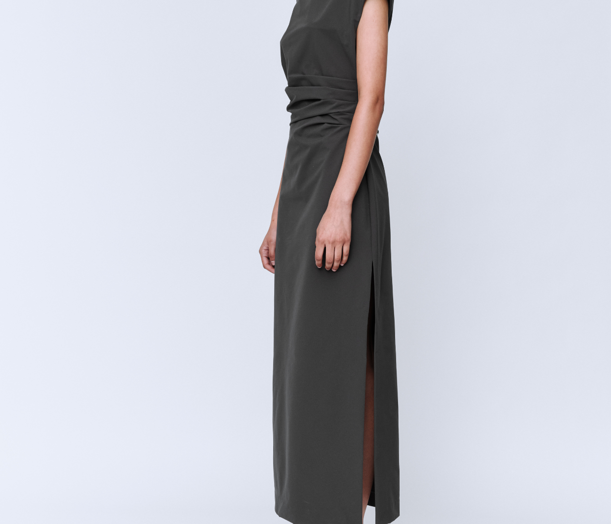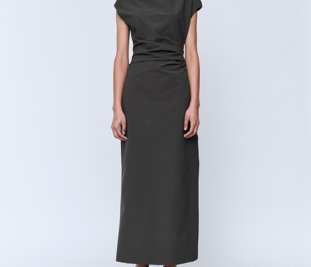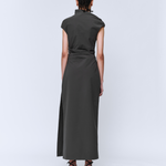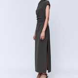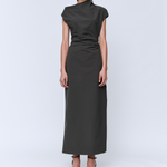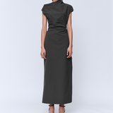 Introducing Wynn Hamlyn's Rita Maxi Dress in Charcoal, an asymmetric-shoulder maxi dress in the solid grey hue. Designed with an asymmetric shoulder neckline, cuffed shoulder short sleeves, and ruching at the waist. Perfect dress for daytime events or occasions.