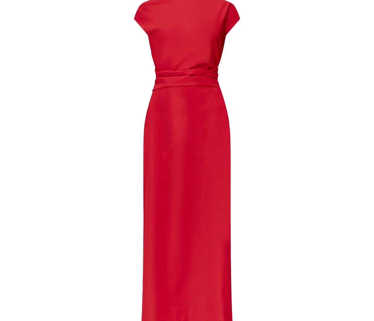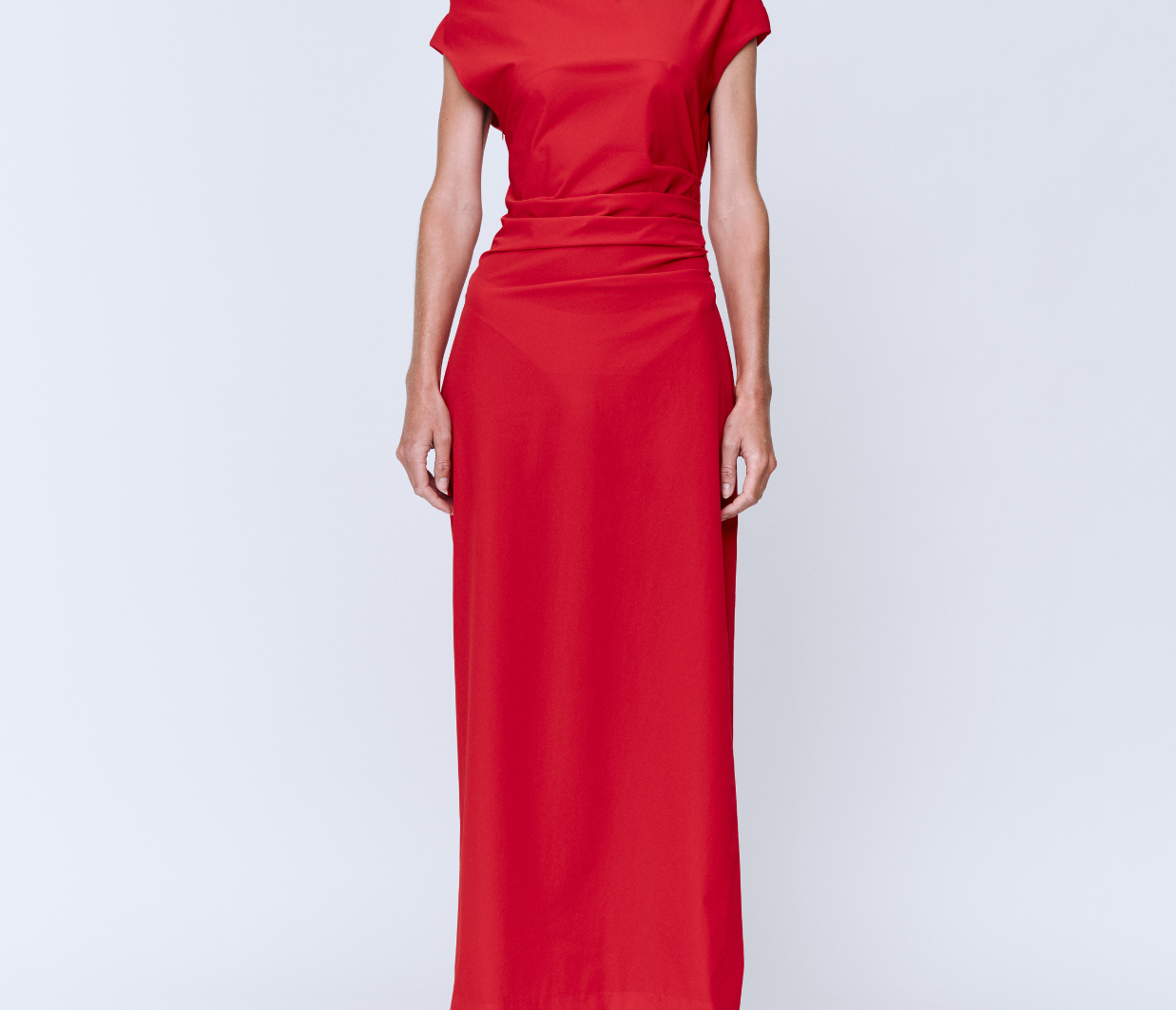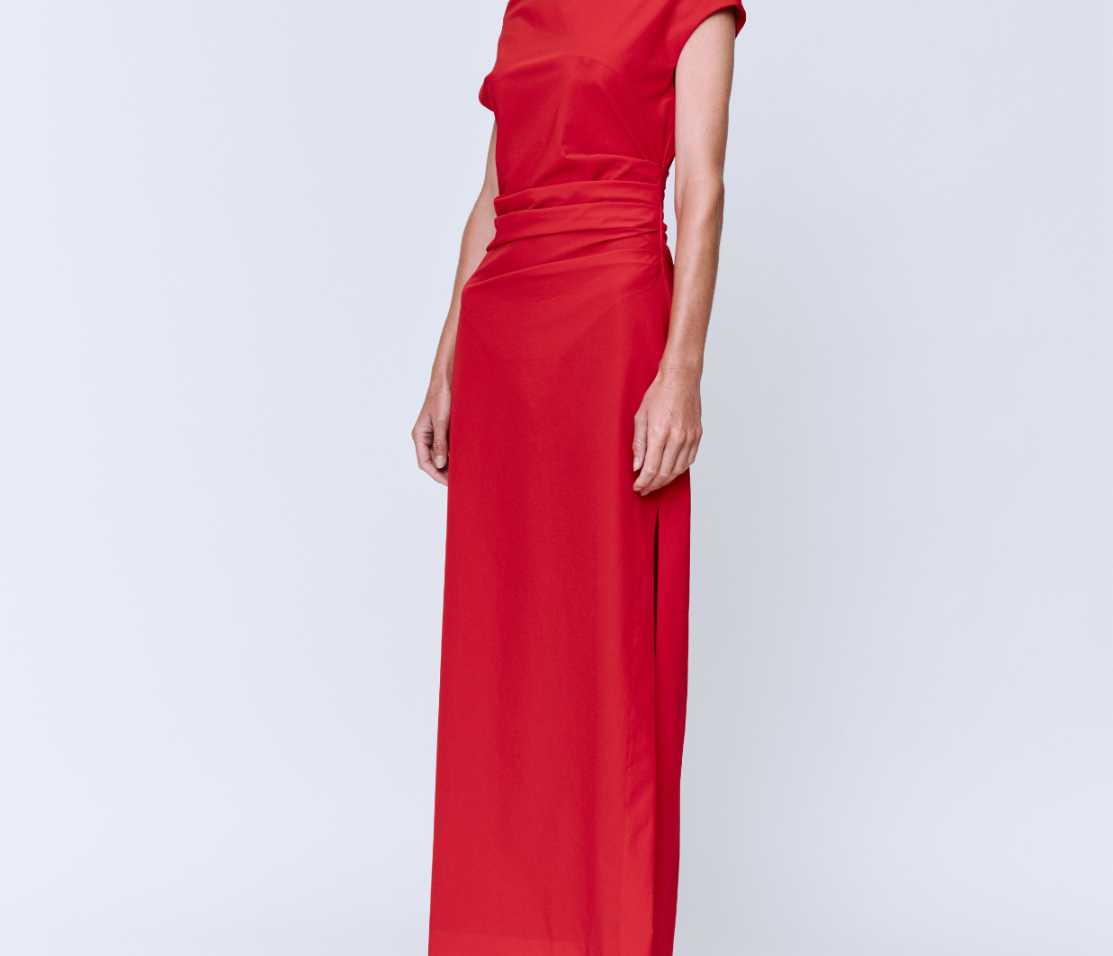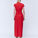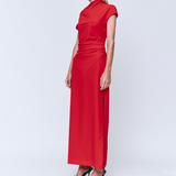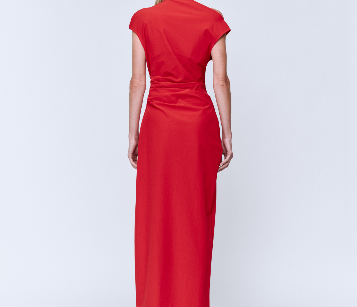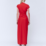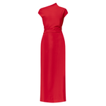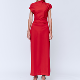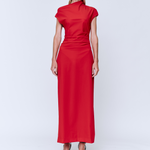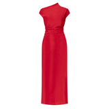 Introducing Wynn Hamlyn's Rita Maxi Dress in Red, an asymmetric-shoulder maxi dress in the solid red hue. Designed with an asymmetric shoulder neckline, cuffed shoulder short sleeves, and ruching at the waist. Perfect dress for daytime events or occasions.